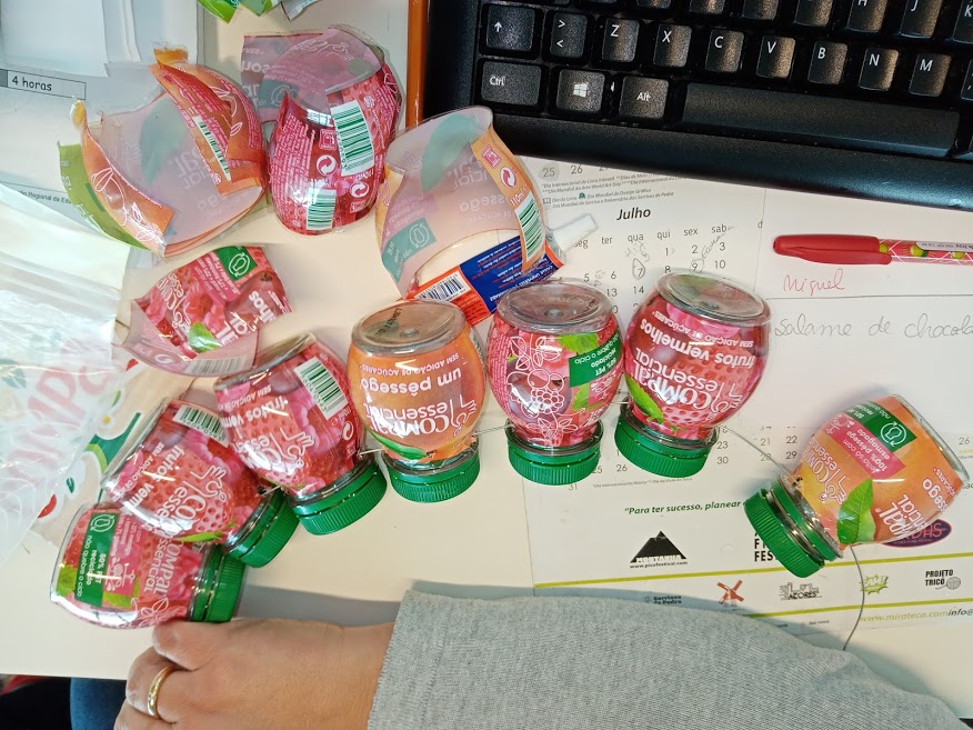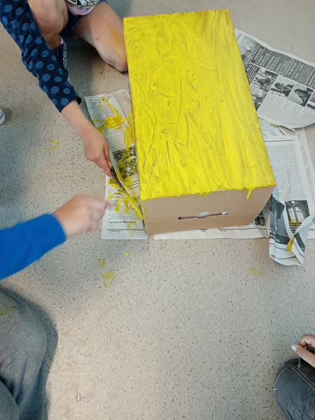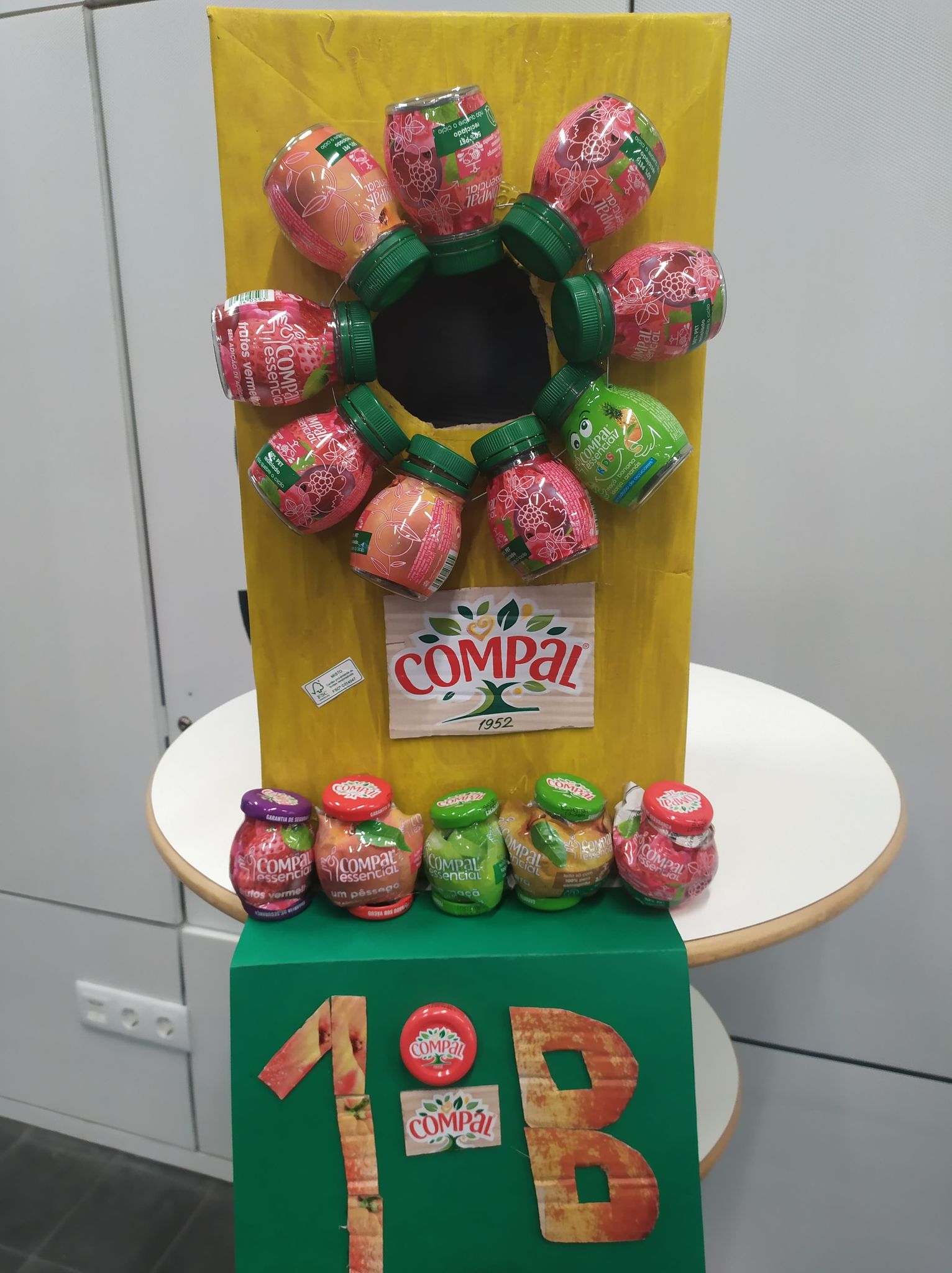 11 alunos da turma B do primeiro ano foram os grandes artistas desta obra de arte, em conjunto com a Professora Márcia Quaresma. Este trabalho também teve a participação dos Encarregados de educação e do Pessoal Não Docente. De que modo? Então foi assim, um dos pais trouxe a caixa, e uma das mães que trabalha num supermercado trouxe alguns caixotes das embalagens da Compal, e os alunos tiveram a recortar. Depois montou-se outra equipa que esteve a pintar e uma outra que esteve a preparar as pequenas embalagens da fruta. Foi aqui, que entrou o pessoal não docente, pois as senhoras do bar guardaram e lavaram as embalagens e o nosso carpinteiro é que furou as pequenas embalagens. Foi um verdadeiro trabalho em equipa!