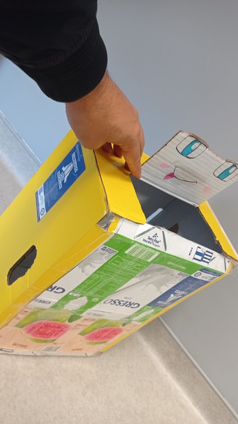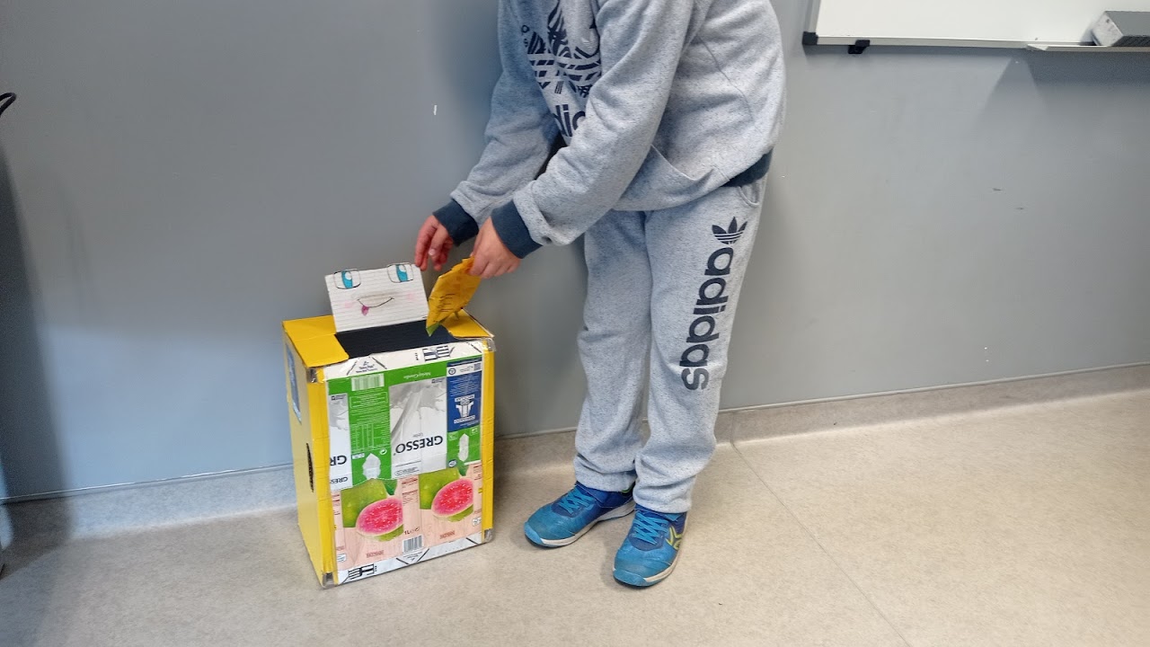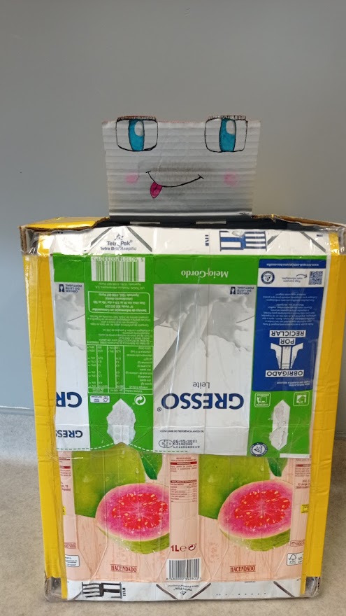 Este ecoponto é constituído por uma caixa reciclada amarela, fita cola, embalagens de leite e sumos, bem como material de recorte. Foram criadas abertura na parte superior e lateral. Na abertura superior foi desenhada uma cara sorridente. Foi necessário recorrer à régua para efetuar os cortes necessários de forma a que as peças se encaixassem corretamente.