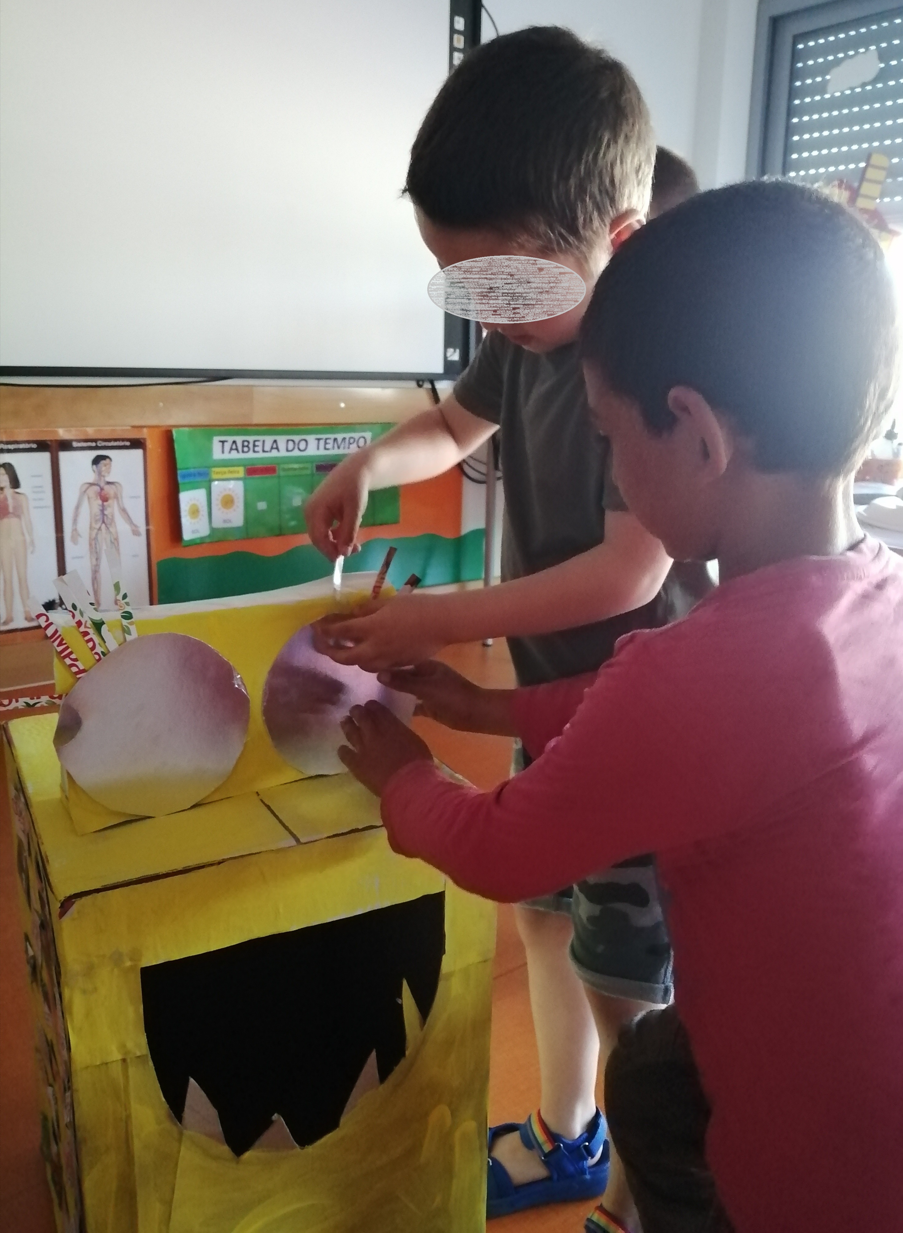 A Turma da Pré D, da Escola Básica de Aljustrel - Agrupamento de Escolas de Aljustrel, decidiu participar no desafio de construir um ecoponto amarelo, porque surgia, frequentemente, entre as crianças, a dúvida sobre onde colocar as embalagens depois do lanche. Assim, resolvemos “deitar as mãos à obra” e, a partir de uma caixa de cartão, construímos o “Devorador de Embalagens”!