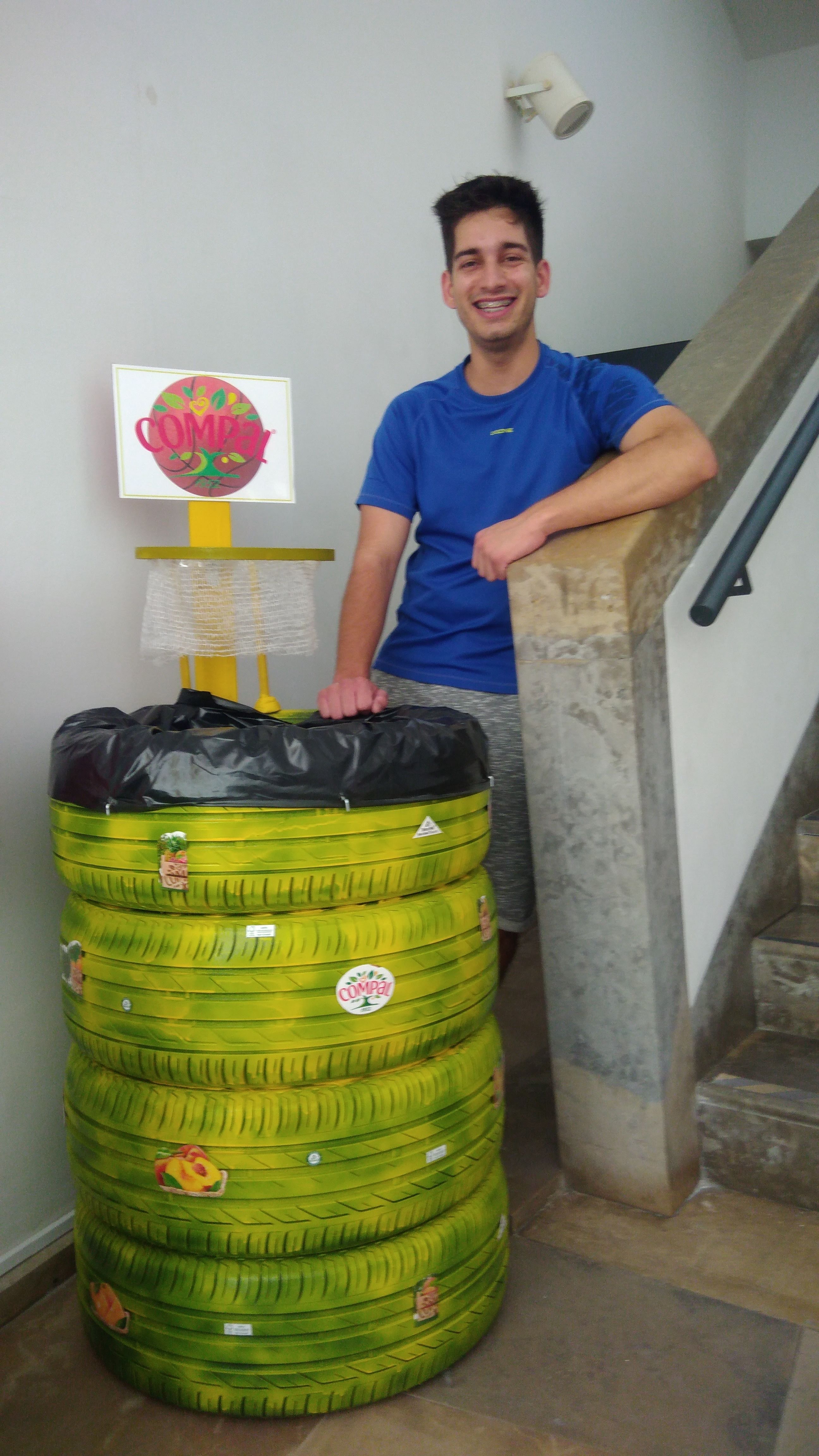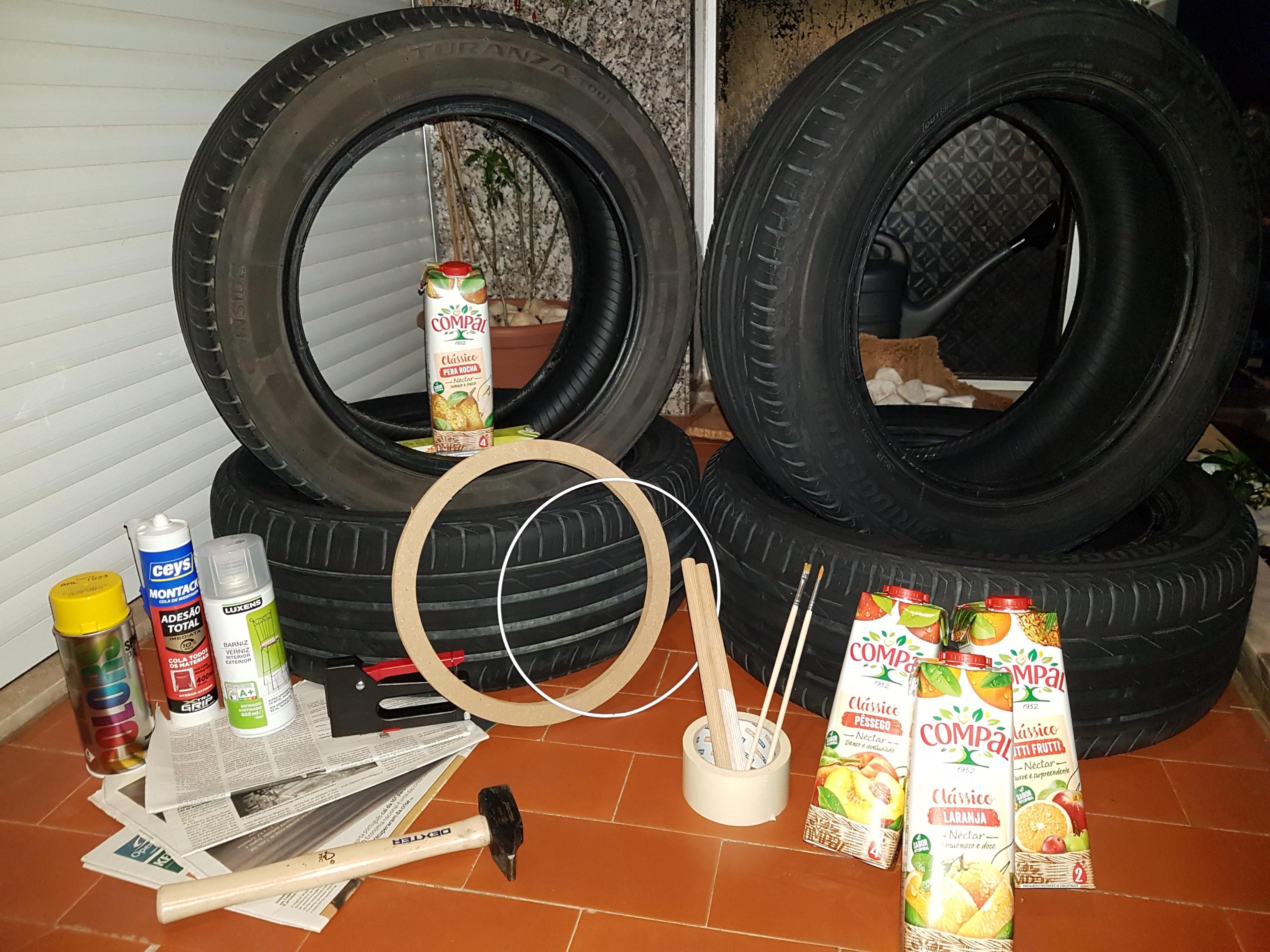 Iniciámos a construção do ecoponto utilizando como base os pneus usados que fomos buscar a uma oficina. Passámos à colagem, formando a estrutura do ecoponto. Em seguida pintámos o ecoponto com tinta vegetal amarela e depois de seco, envernizámo-lo.