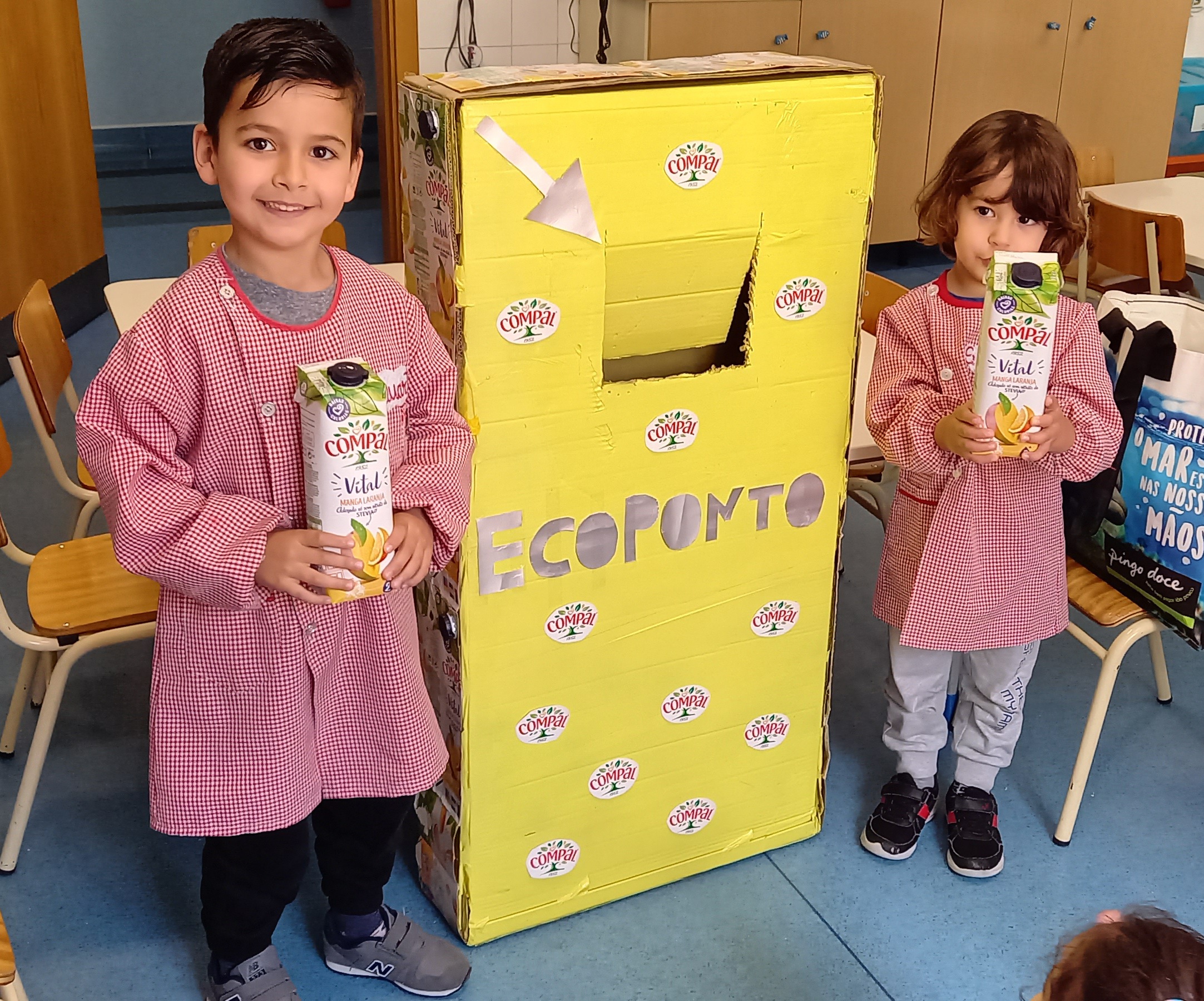 O desafio foi lançado durante o ensino @ distância. A família Sousa, que tem um filho em cada uma das salas, disse logo que queria participar e que todos em conjunto, em casa, iriam construir o ecoponto amarelo, porque consomem muitos sumos da marca Compal e conseguem juntar muitas embalagens facilmente.