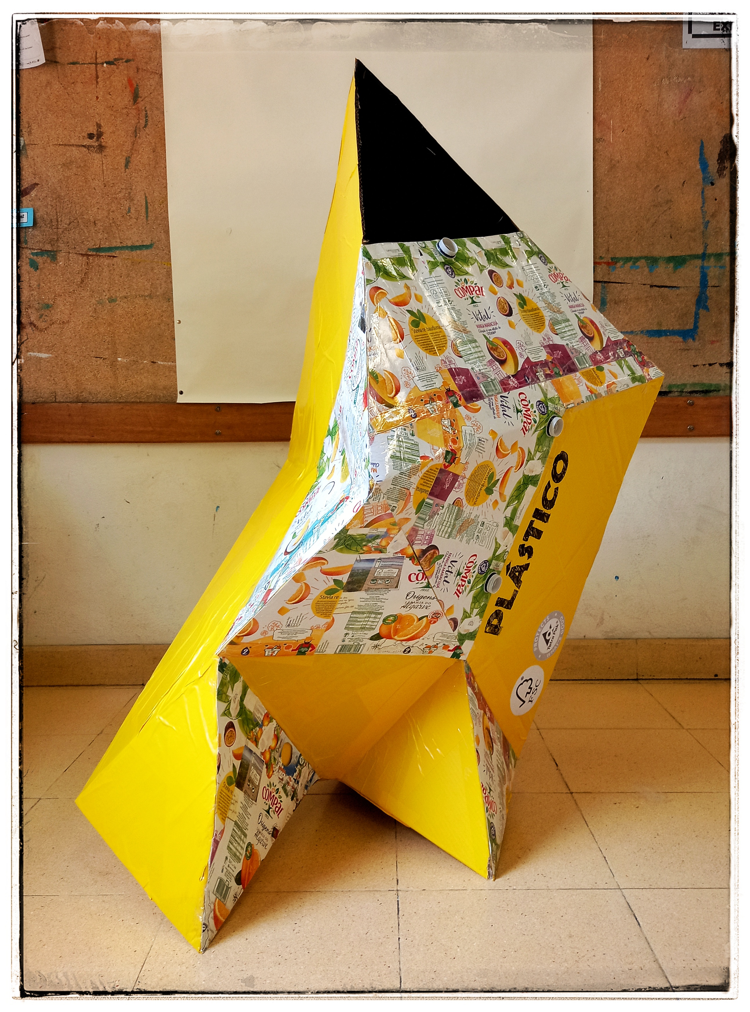 No revestimento exterior dos ecopontos foram coladas as partes exteriores das embalagens Compal e no lado interior colaram-se as partes interiores das mesmas embalagens. Em ambas as situações aplicou-se cola branca.