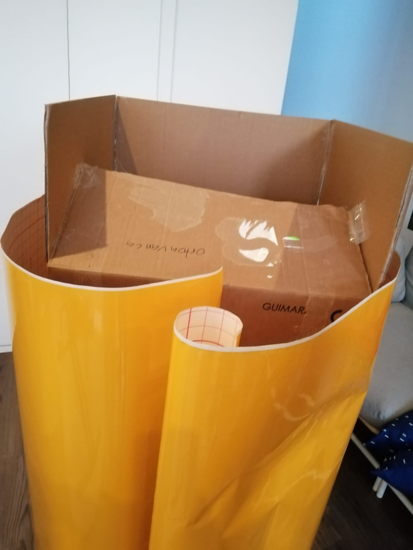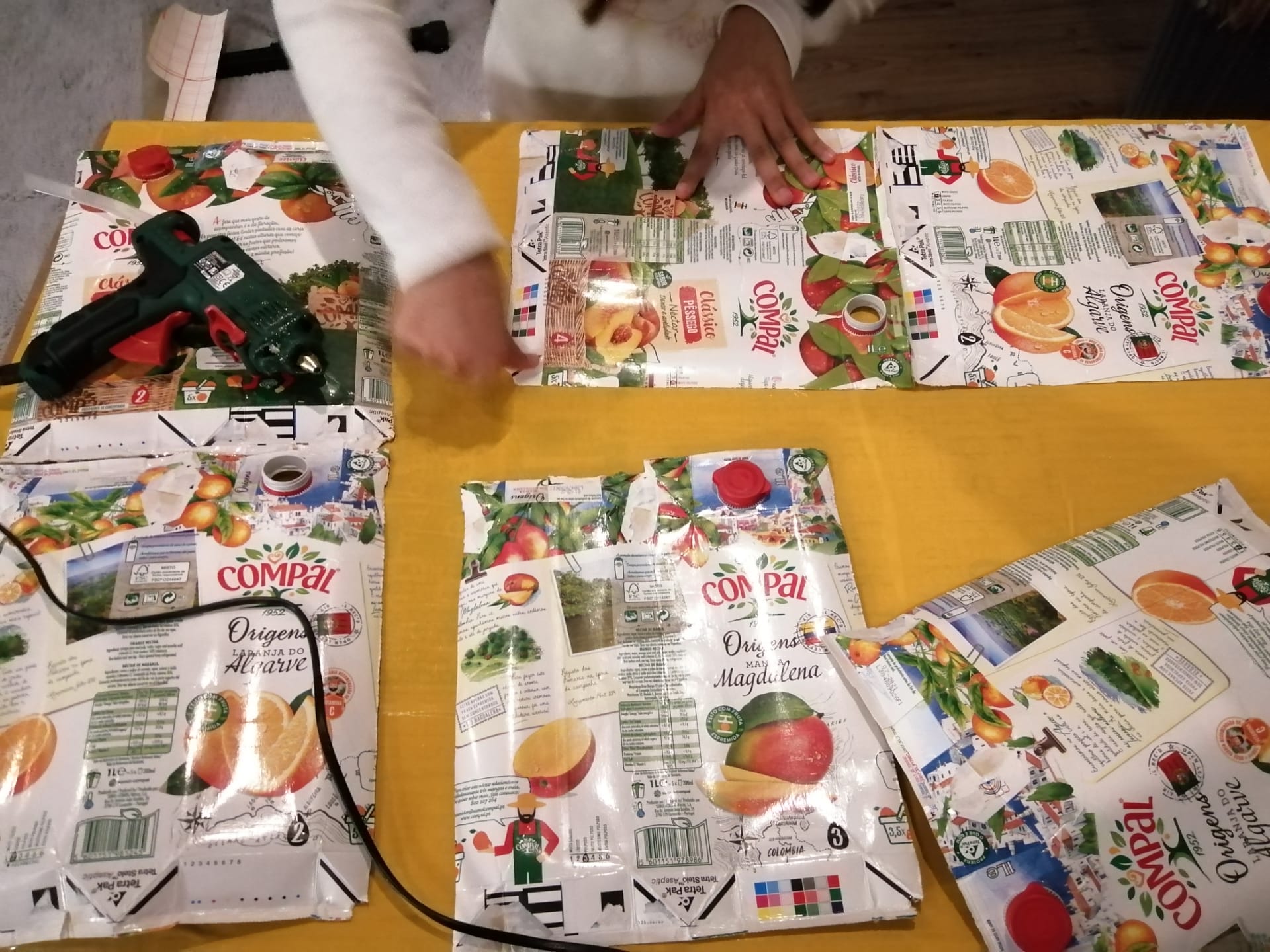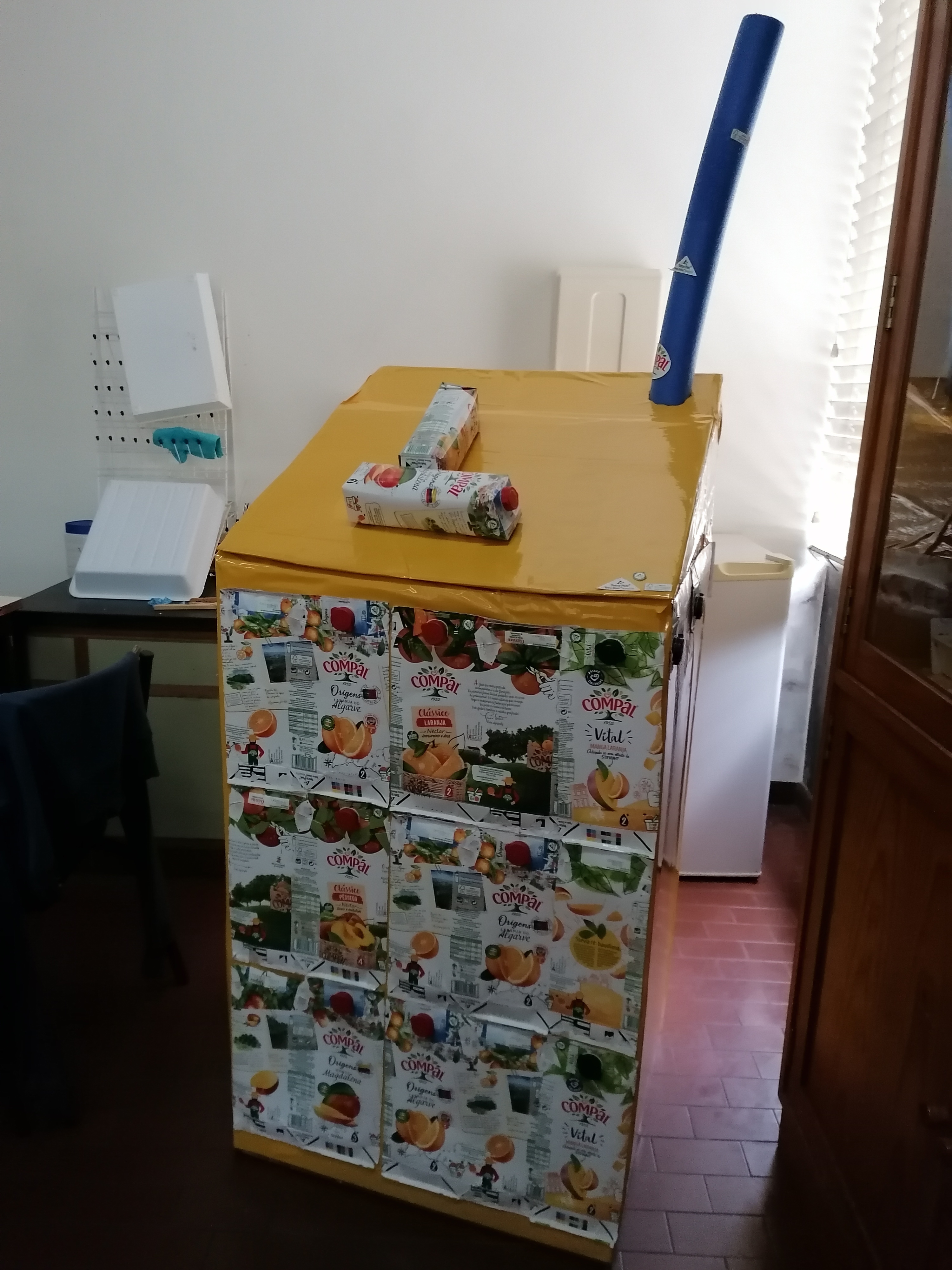 Cortou-se o cartão de uma caixa para fazer a parte de cima inclinada do ecoponto e utilizou-se uma caixa branca para ser a parte que apoia no chão. Depois o cartão foi forrado com papel autocolante amarelo e castanho. Em seguida, foram coladas as embalagens Tetra Pak Compal. No fim, colocou-se a esponja de piscina na parte de cima do ecoponto para imitar a "palhinha" que surge nas embalagens "Nesquik".