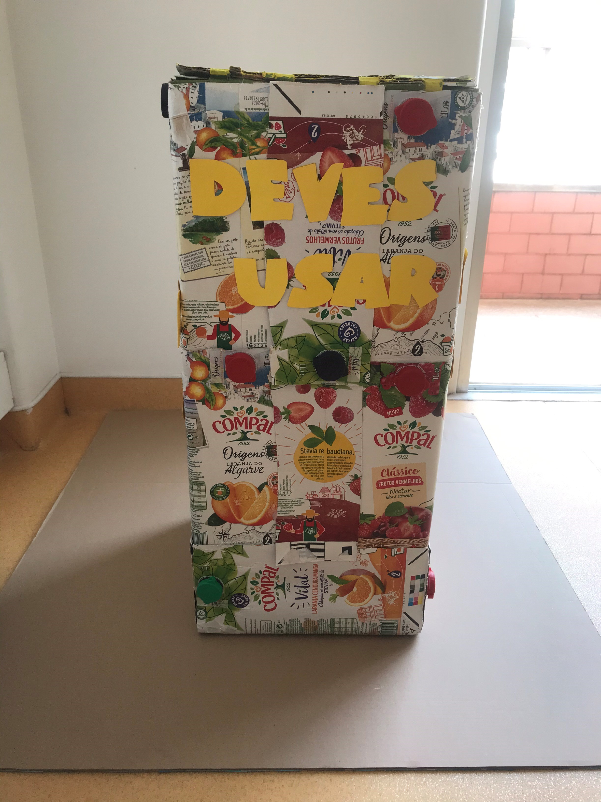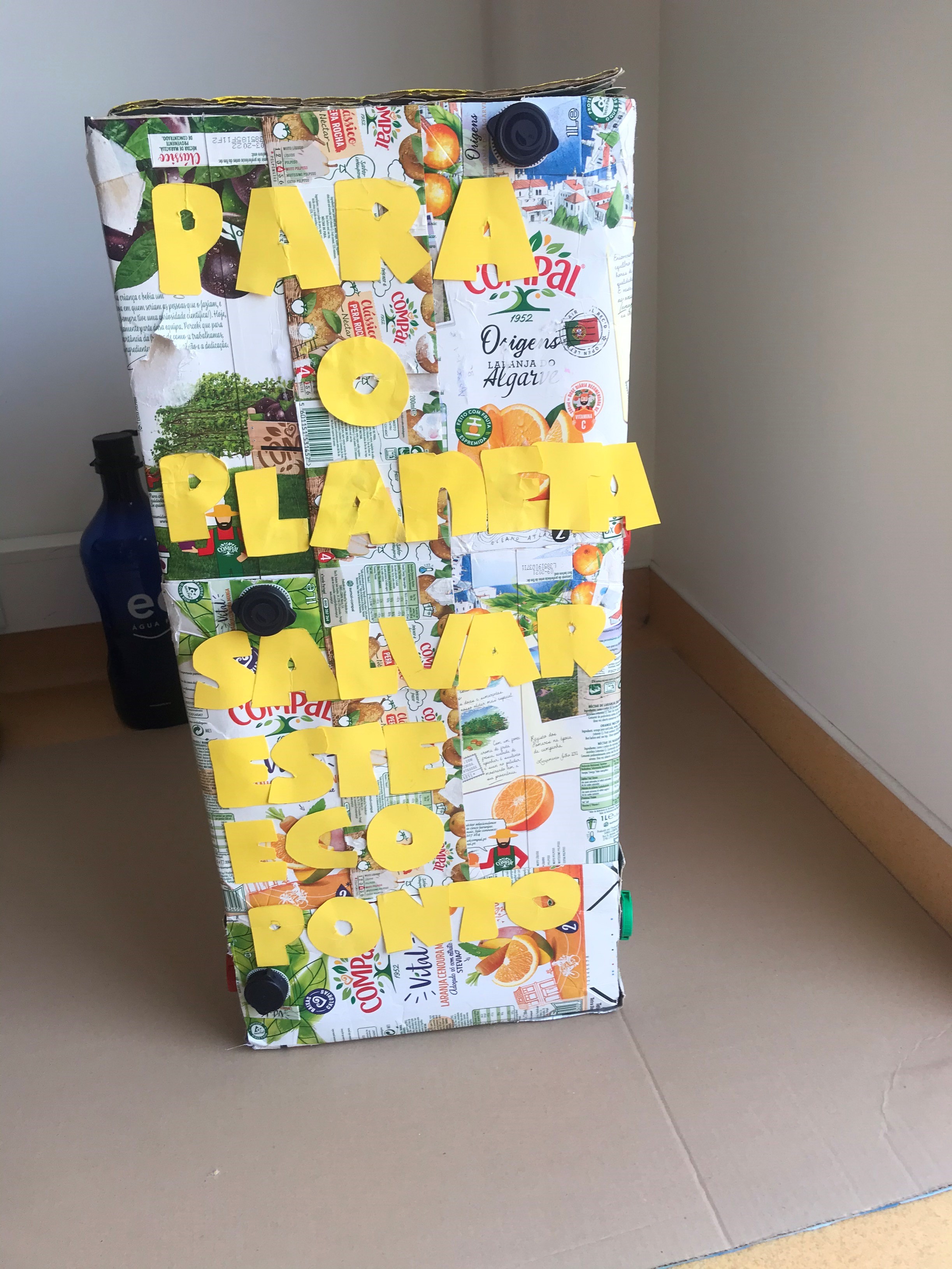 Forraram a caixa de cartão por dentro e por fora com as embalagens de Compal, e recortaram as seguintes frases “ECOPONTO AMARELO” e “PARA O PLANETA SALVAR ESTE ECOPONTO DEVES USAR” e colaram numa das faces.