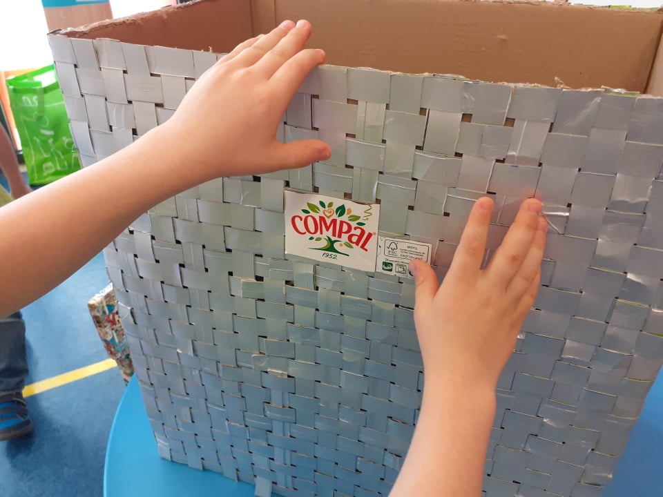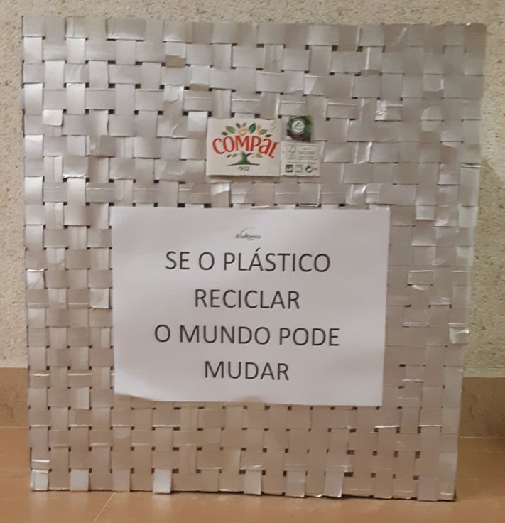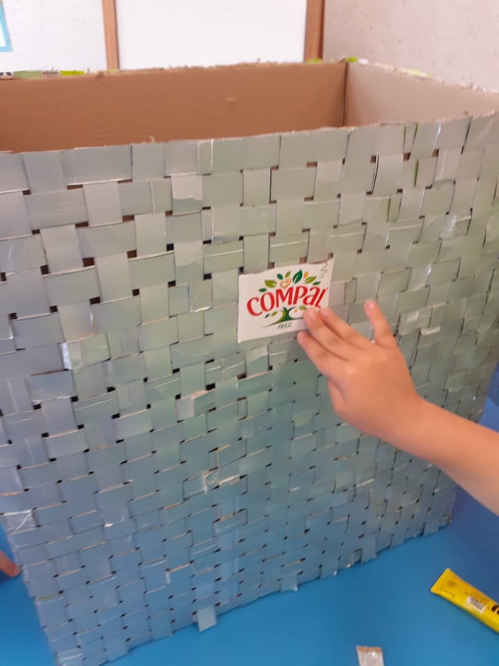 que posteriormente serviu de mote para o lançamento desta atividade de construção do ecoponto amarelo. Após uma reunião de tapete na sala surgiu a ideia de construirmos o nosso ecoponto amarelo à base de embalagens tetrapack cortadas em tiras que depois foram entrançadas para forrar uma caixa de cartão. Também definimos a frase de sensibilização para a reciclagem e explicados os significado dos símbolos que teríamos de colocar no nosso ecoponto. O material utilizado foi: caixa de cartão (molde), embalagens tetrapack diversas cortadas em tiras, cola quente e cola liquida uhu, embalagens tetrapack da compal, papel. Pedimos colaboração às famílias na recolha das embalagens que depois de lavadas e desinfetadas foram cortadas em tiras para se forrar a caixa. No final colámos os símbolos e a frase escolhida.