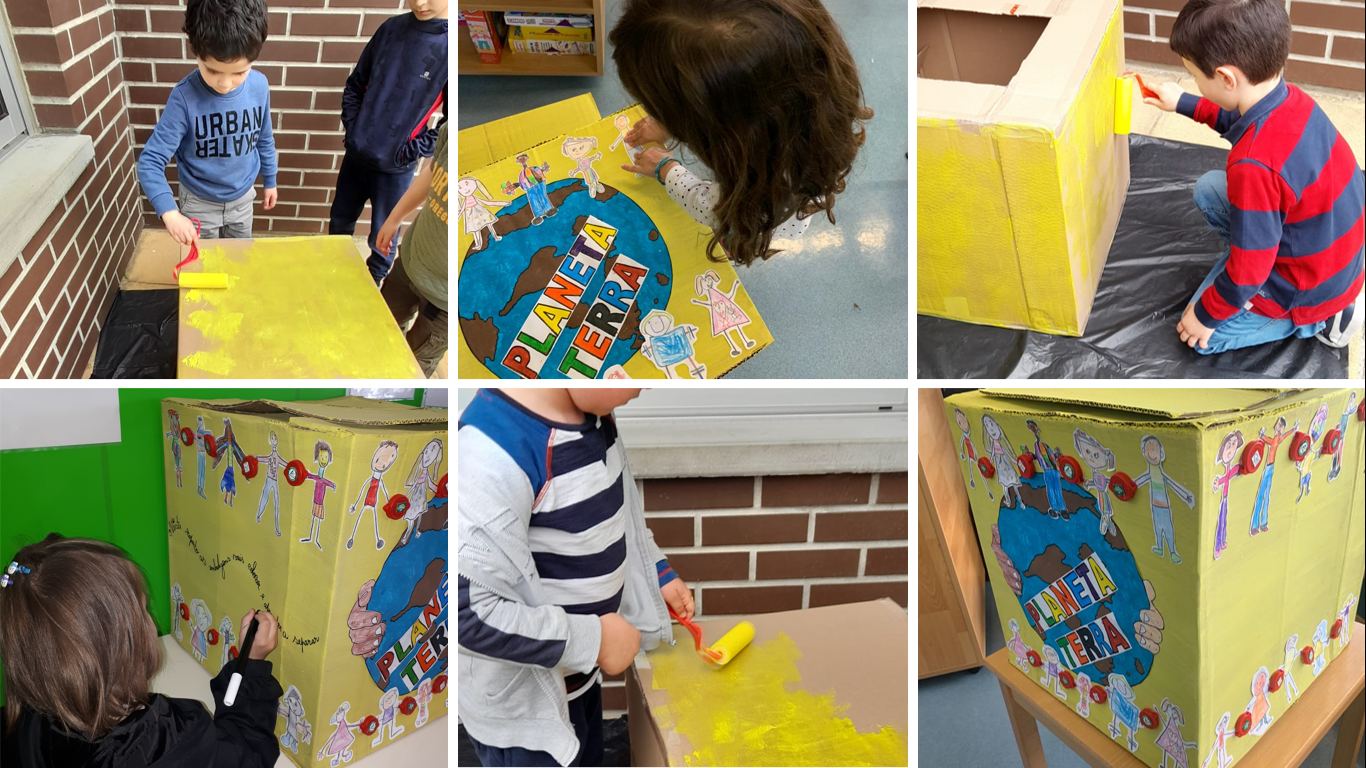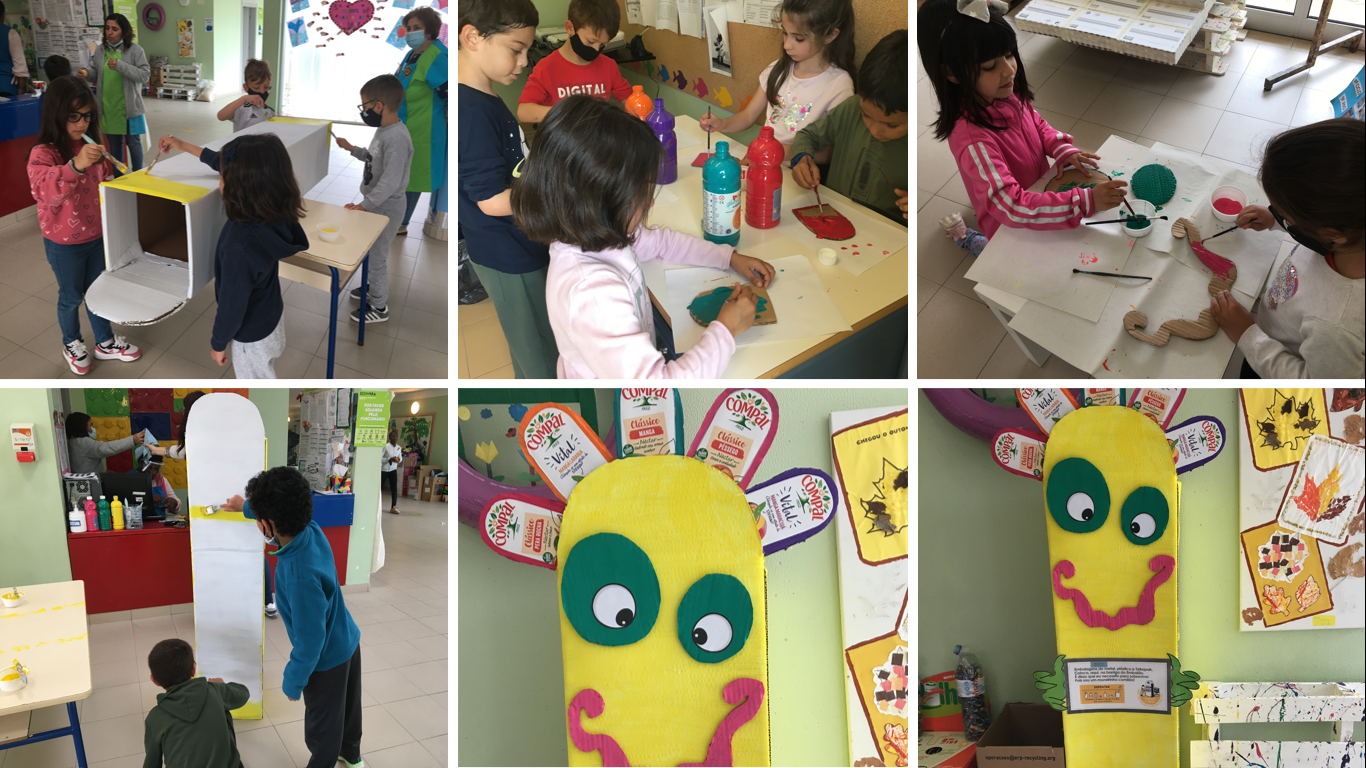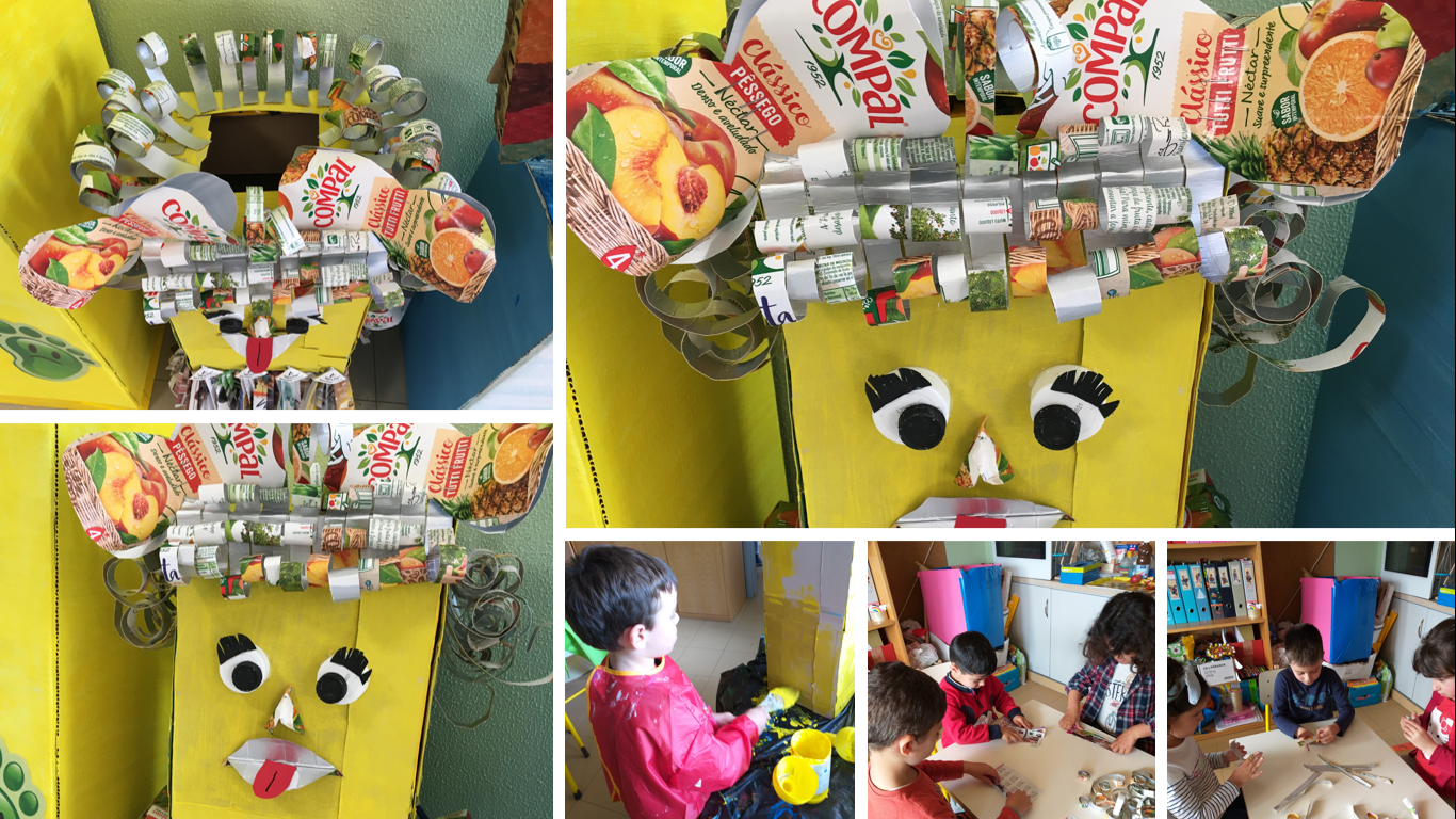 Indo ao encontro do projeto de escola "Monstrinhos Comilões" que pretende construir ecopontos para os materiais que reciclamos na nossa escola, resolvemos aderir ao desafio "Constrói o teu ecoponto Amarelo e Recicla". Fizemos três ecopontos diferentes para reciclar as embalagens, utilizando material reciclado, nomeadamente embalagens Tetra Pak da marca "Compal", destacando-se o símbolo FSC®. Para a sua construção usamos ainda embalagens de cartão, tampas de plástico, diferentes tipos de papel, tintas, cola, tesouras,... utilizando técnicas diversificadas tais como pintura, recorte, dobragem e colagem.