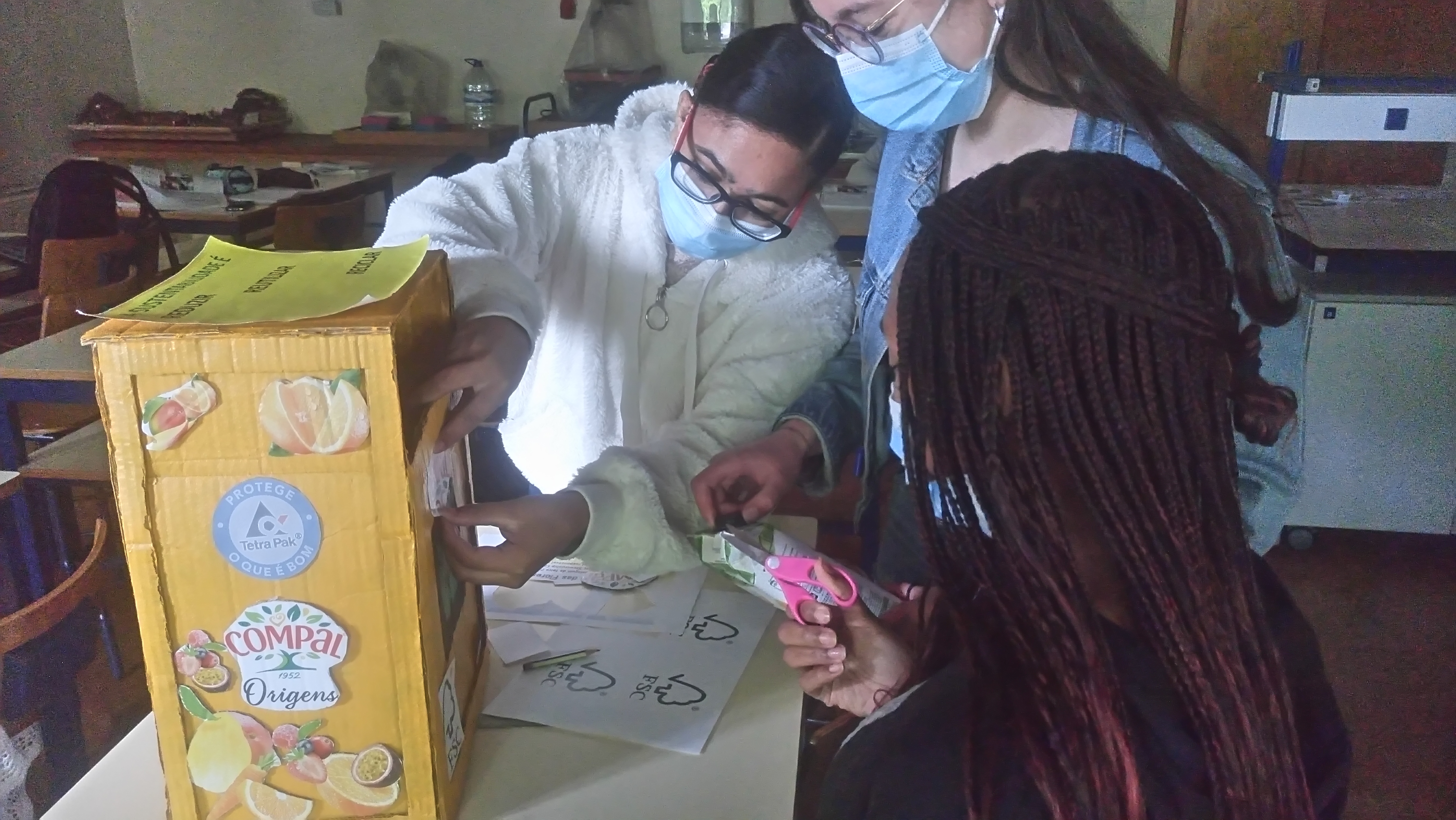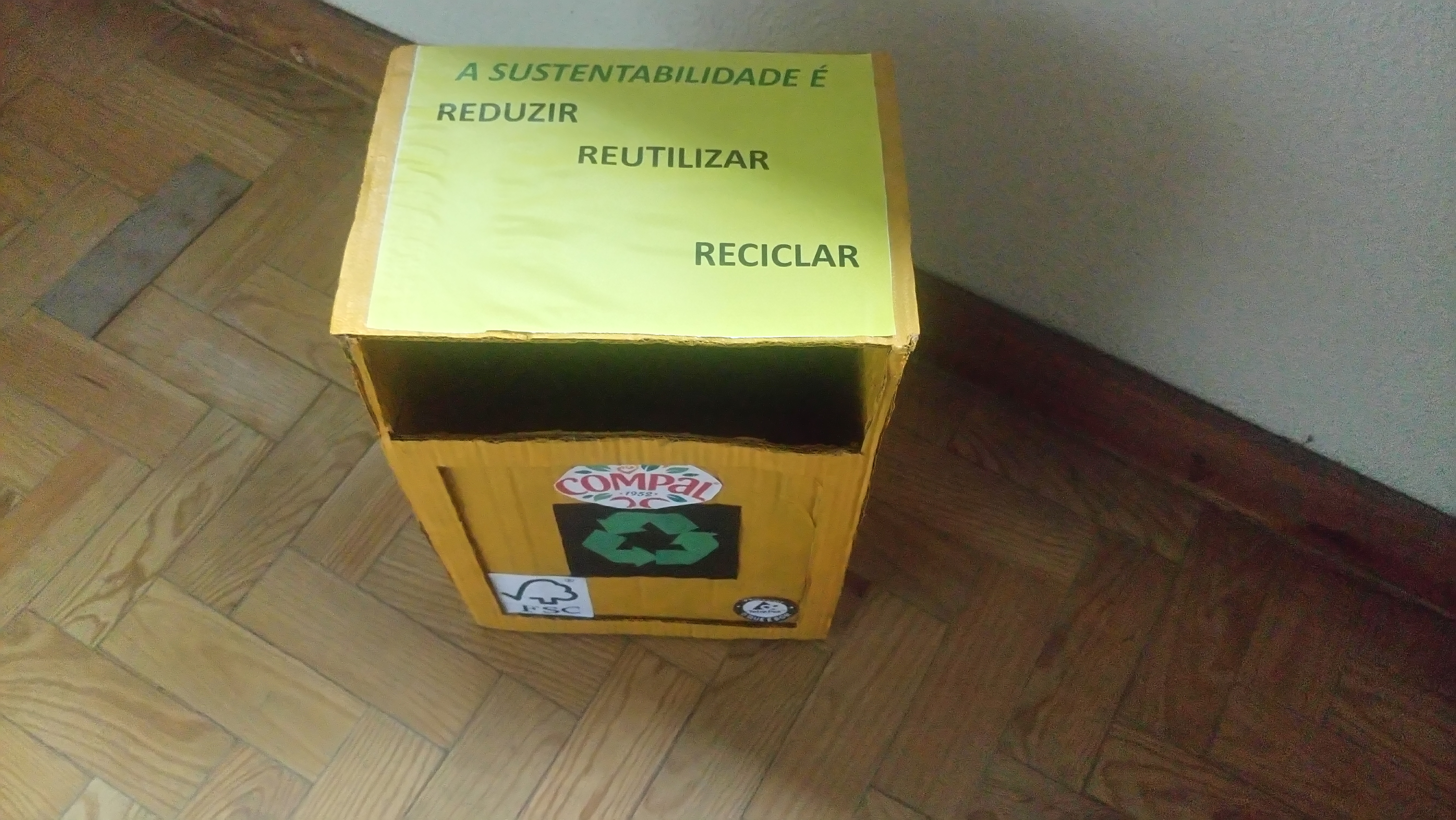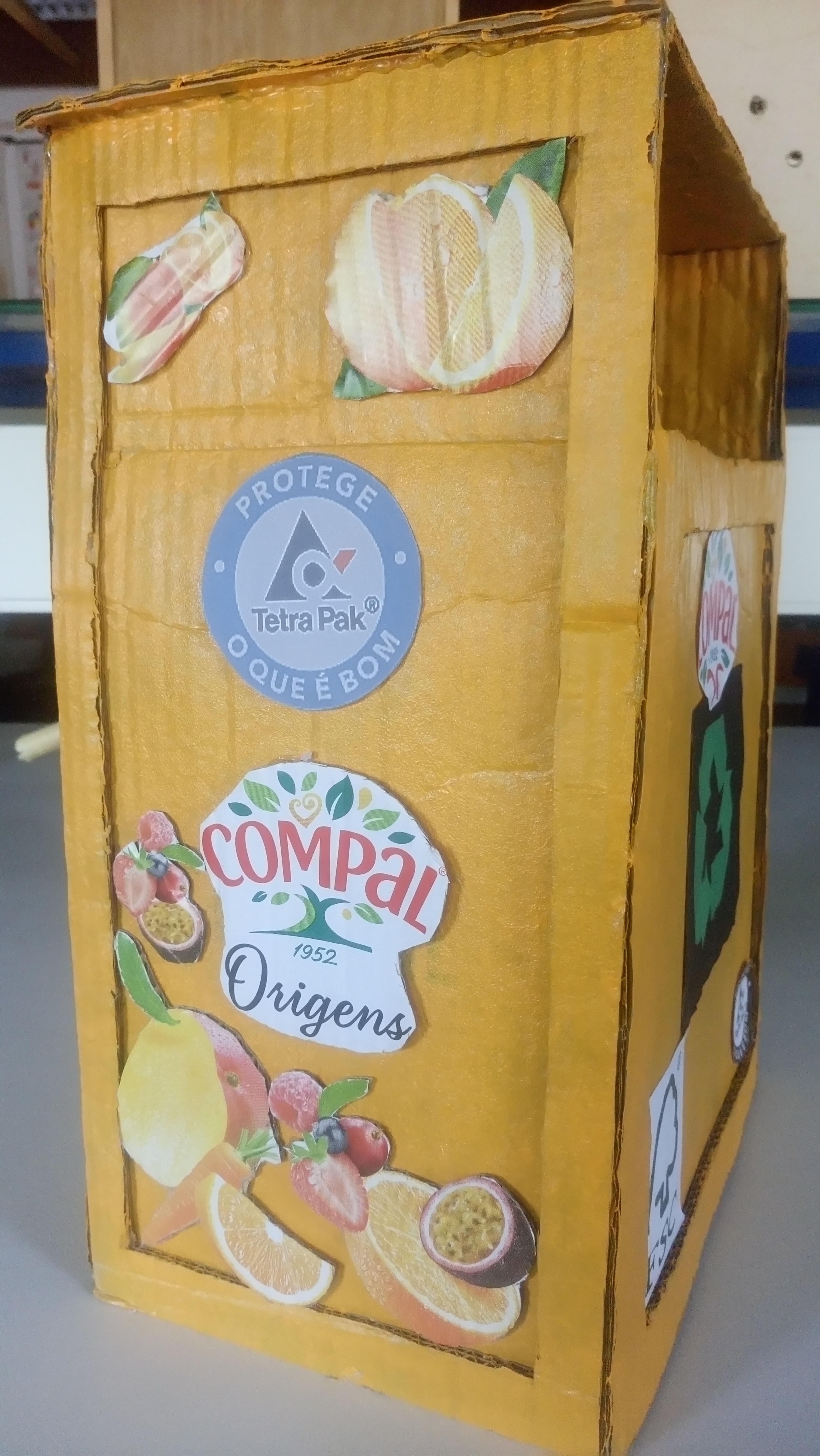 Ecoponto 2- A construção e pintura dos Ecopontos foi feita por 3 alunas em suas casas e na escola. Na sua construção usaram 2 caixas de cartão, 3 embalagens de Sumos Compal, 2 latas de tinta amarela, rolo de pintura, papel impresso, fita adesiva, cola baton UHU e uma pistola de cola quente. Numa primeira fase construíram o Ecoponto adaptando o formato das caixas a um dos modelos de seu maior agrado apresentados, e pintaram de amarelo. O acabamento final, ao nível do embelezamento teve lugar na escola, com destaque das embalagens da Tetra Pak da marca Compal e o símbolo FSC. No topo da caixa pode ler-se a frase: A Sustentalilidade é Reduzir, Reutilizar e Reciclar.