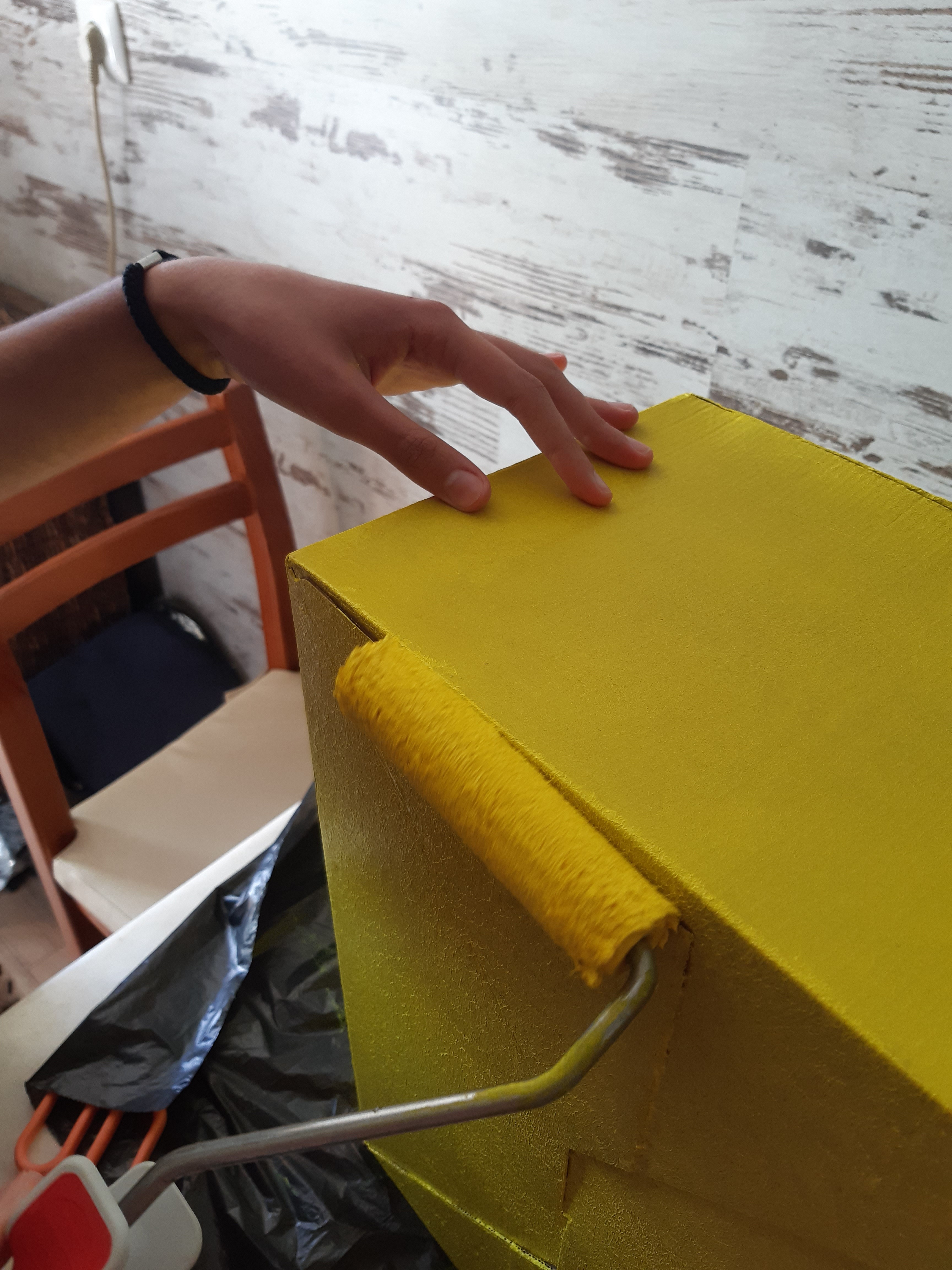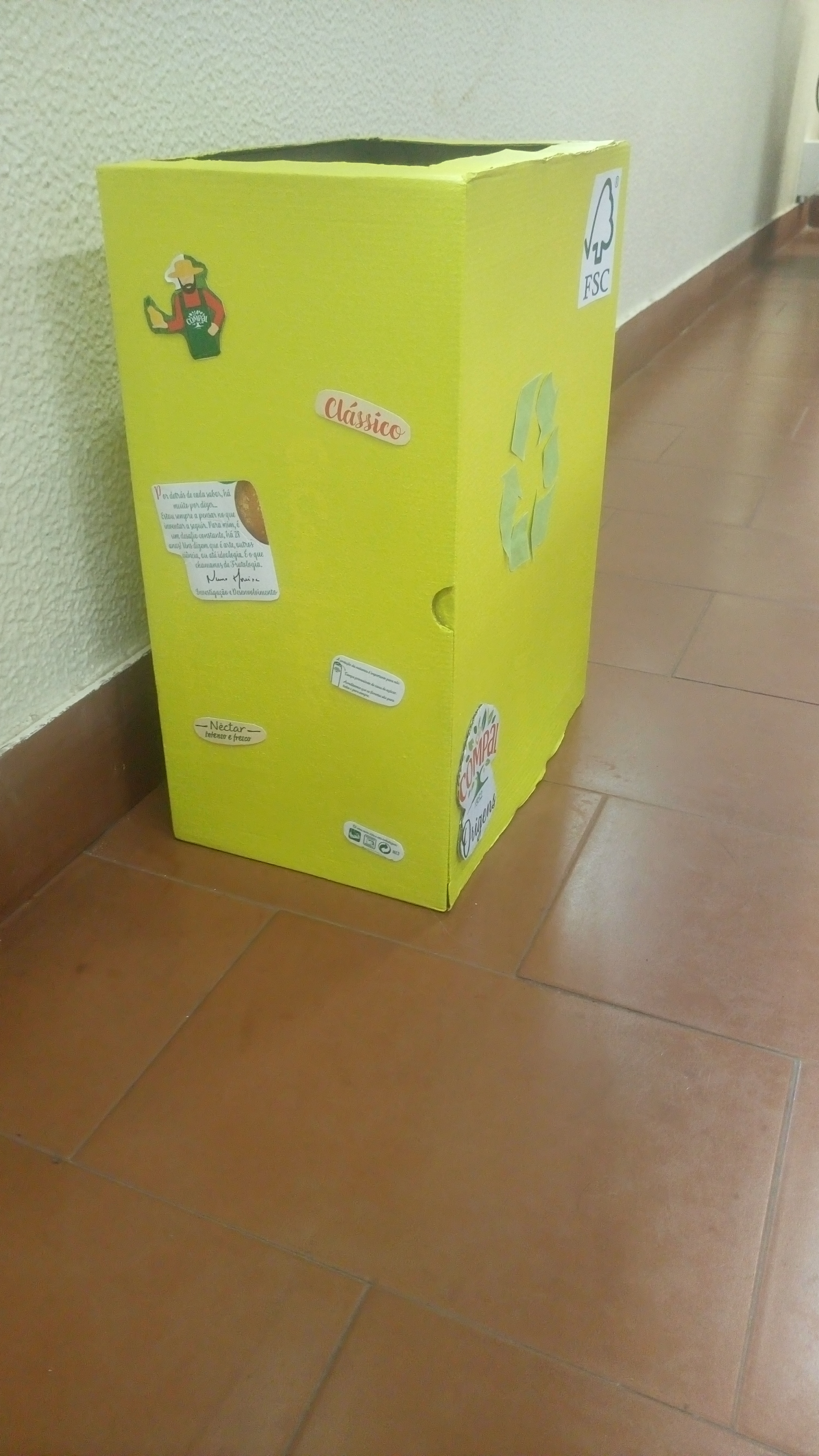 Ecoponto 3- A construção dos Ecopontos foi feita em casa por duas alunas. Na sua construção usaram 1 caixa de cartão, 1 embalagem de Sumo Compal, 2 latas de tinta amarela, rolo de pintura, papel impresso, cola baton UHU e uma pistola de cola quente. A construção do Ecoponto teve em consideração o formato da caixa que mais se aproximou do modelo apresentado e do qual gostaram mais. Todo o planeamento, design e execução foi feito colaborativamente, com destaque das embalagens da Tetra Pak da marca Compal e o símbolo FSC .