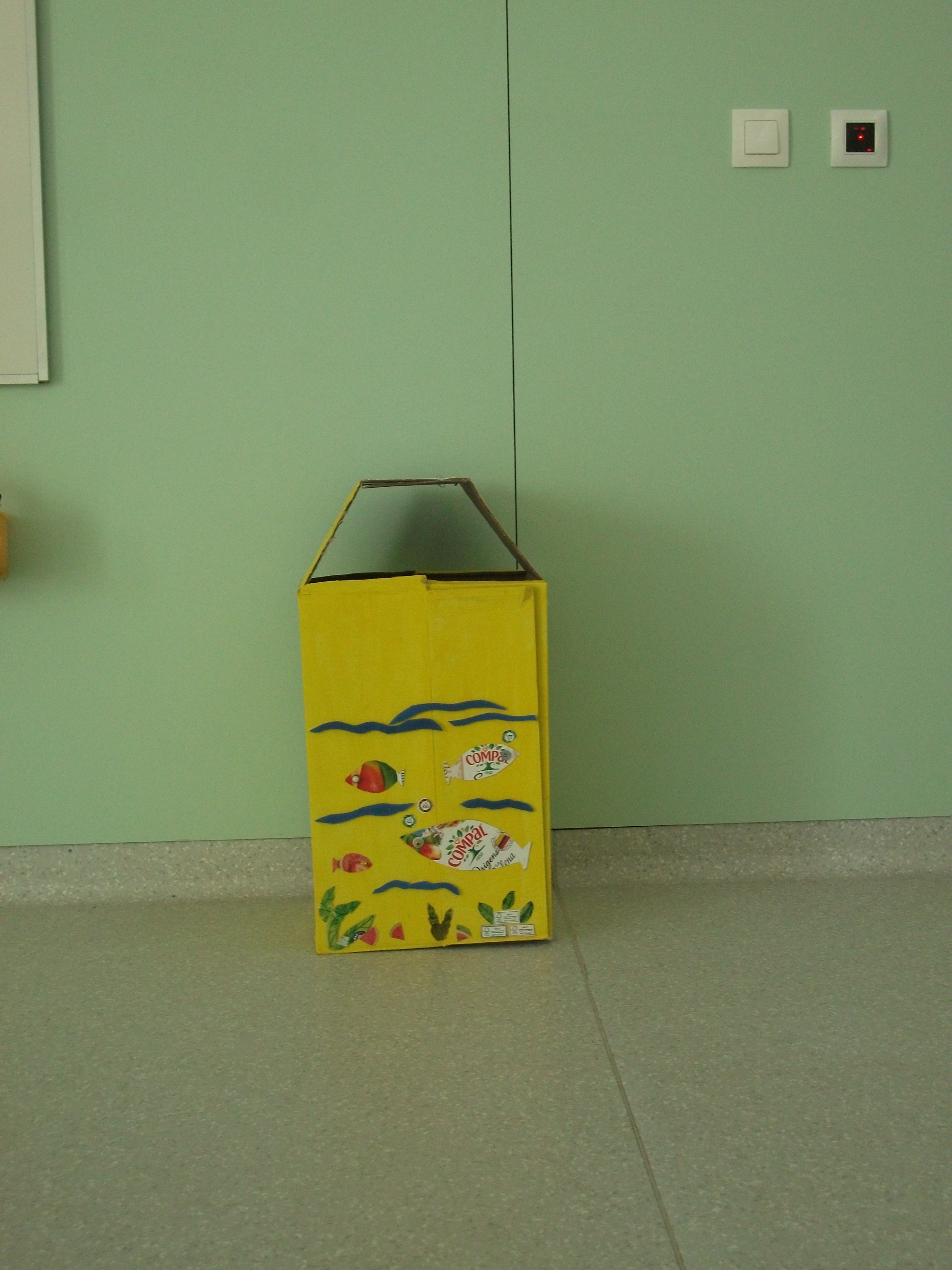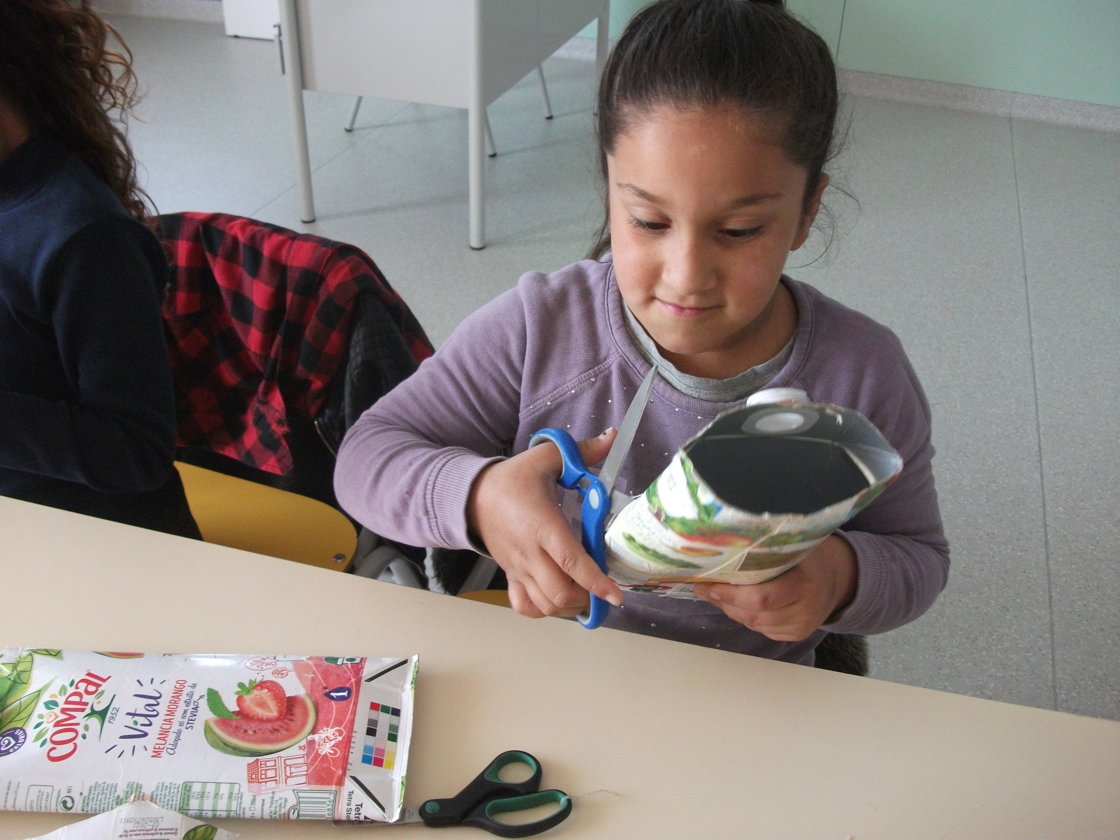 Os alunos começaram por pintar as caixas de cartão de cor amarela e de seguida deram forma ao ecoponto, recortando as embalagens e colando-as, tendo em atenção a utilização nas colagens dos elementos obrigatórios, nomeadamente os símbolos da tetra pak, a siga FSC e a palavra COMPAL, obtiveram a decoração desejada.