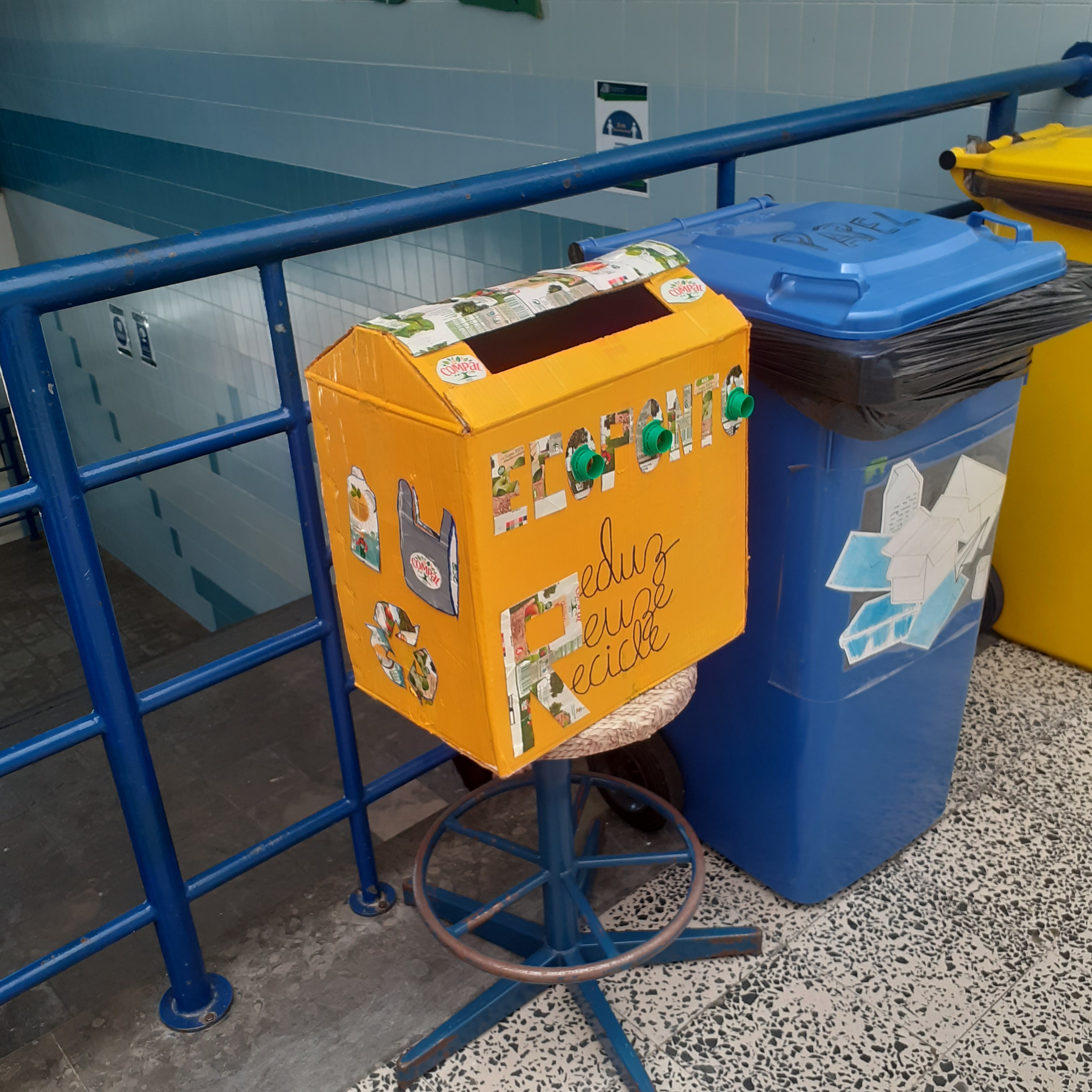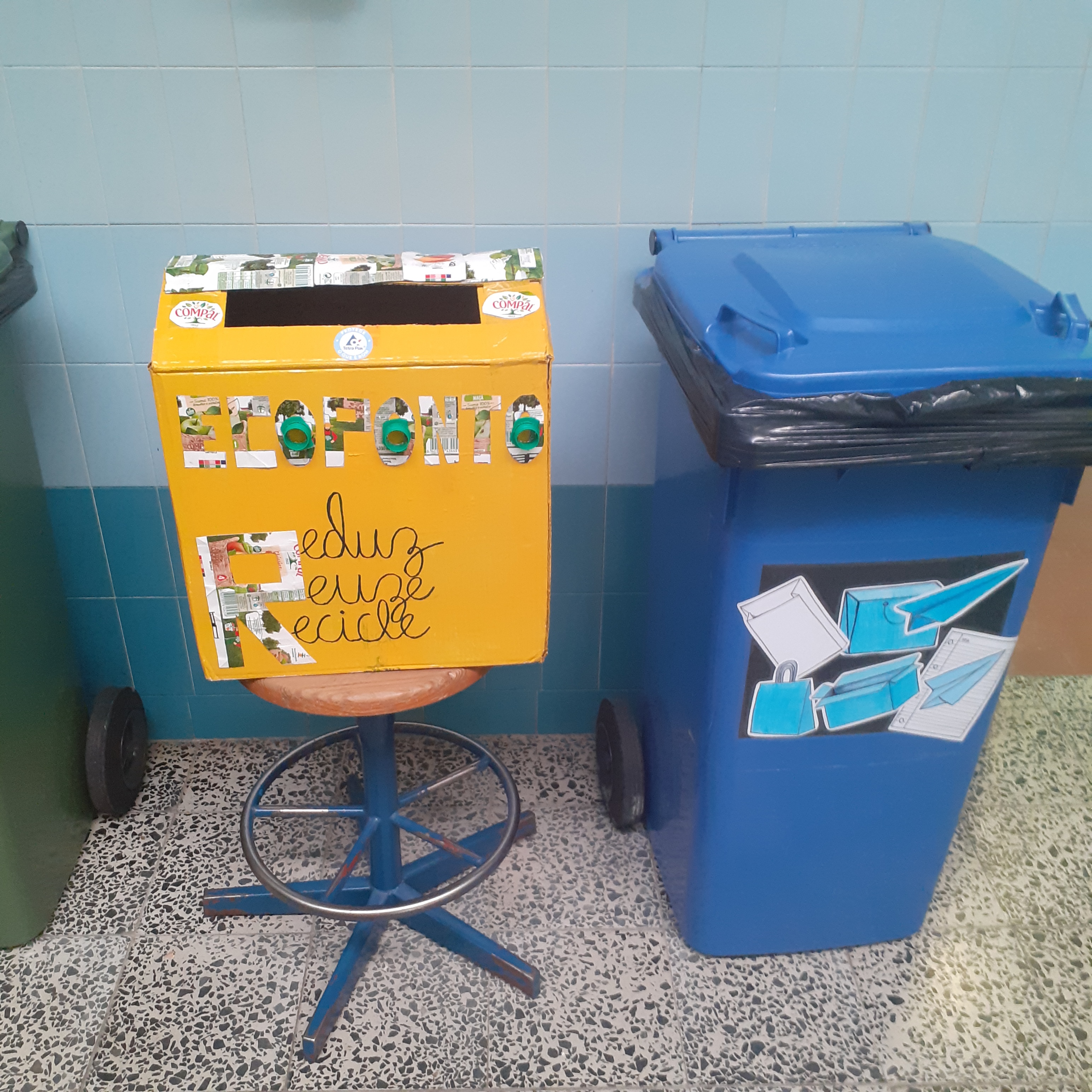 O Ecoponto foi colocado num dos corredores da escola, junto dos outros ecopontos, sensibilizando todos para a recolha de resíduos de embalagens, plásticos, latas e outros.