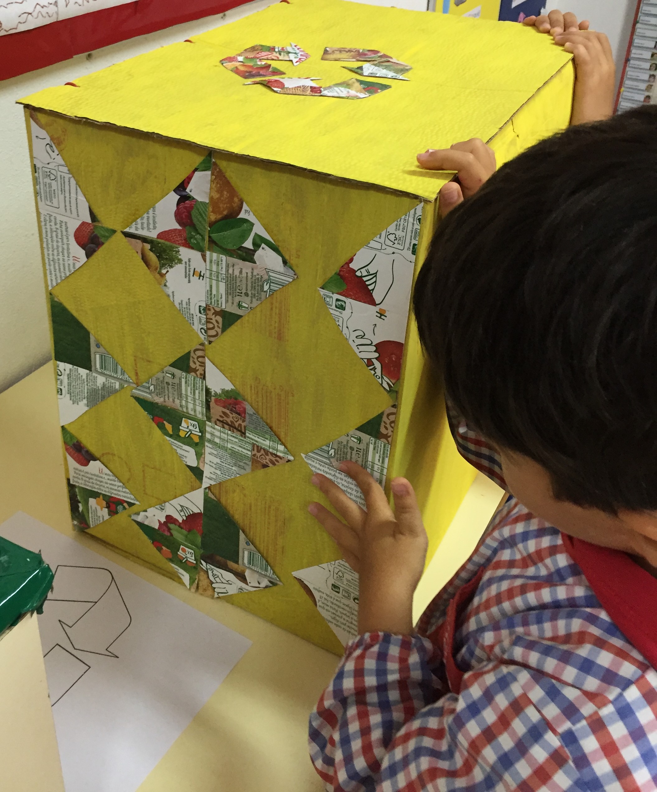 4ª Decoração dos Ecopontos: recorte e colagem das embalagens da Tetra Pak da marca Compal e de outros materiais;