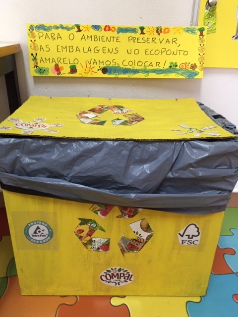 5ª. Colocação do Ecoponto Amarelo, elaborado pela Turma A, no recreio e do Ecoponto Amarelo, construído pela Turma B na respetiva sala de atividades;