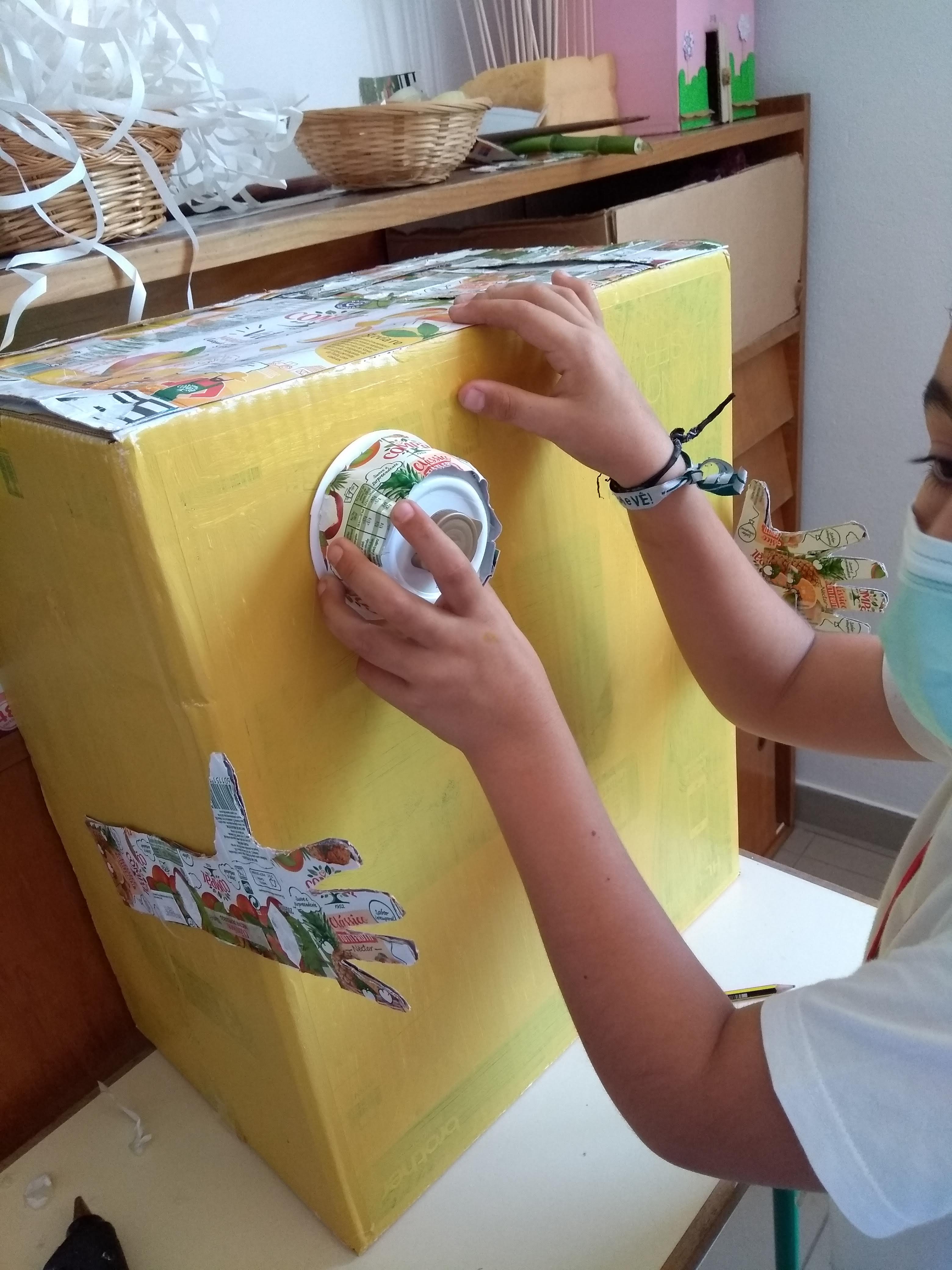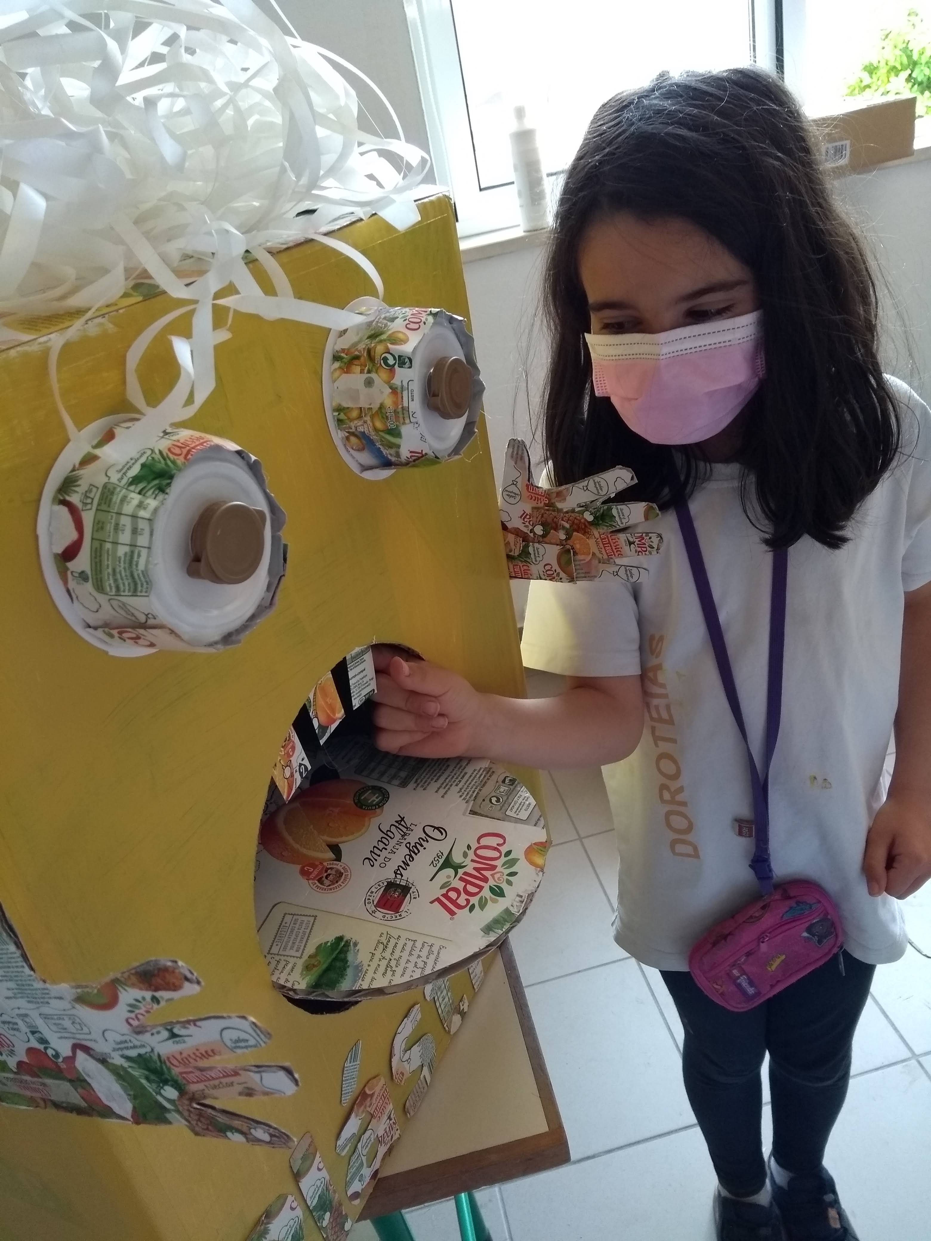 A atividade teve por base uma caixa de cartão. Esta caixa foi pintada com tinta amarela e procedeu-se ao recorte das embalagens recolhidas ao longo do 3º Período que depois foram coladas na caixa, já pintada, de forma a fazer o “o monstro do plástico”.