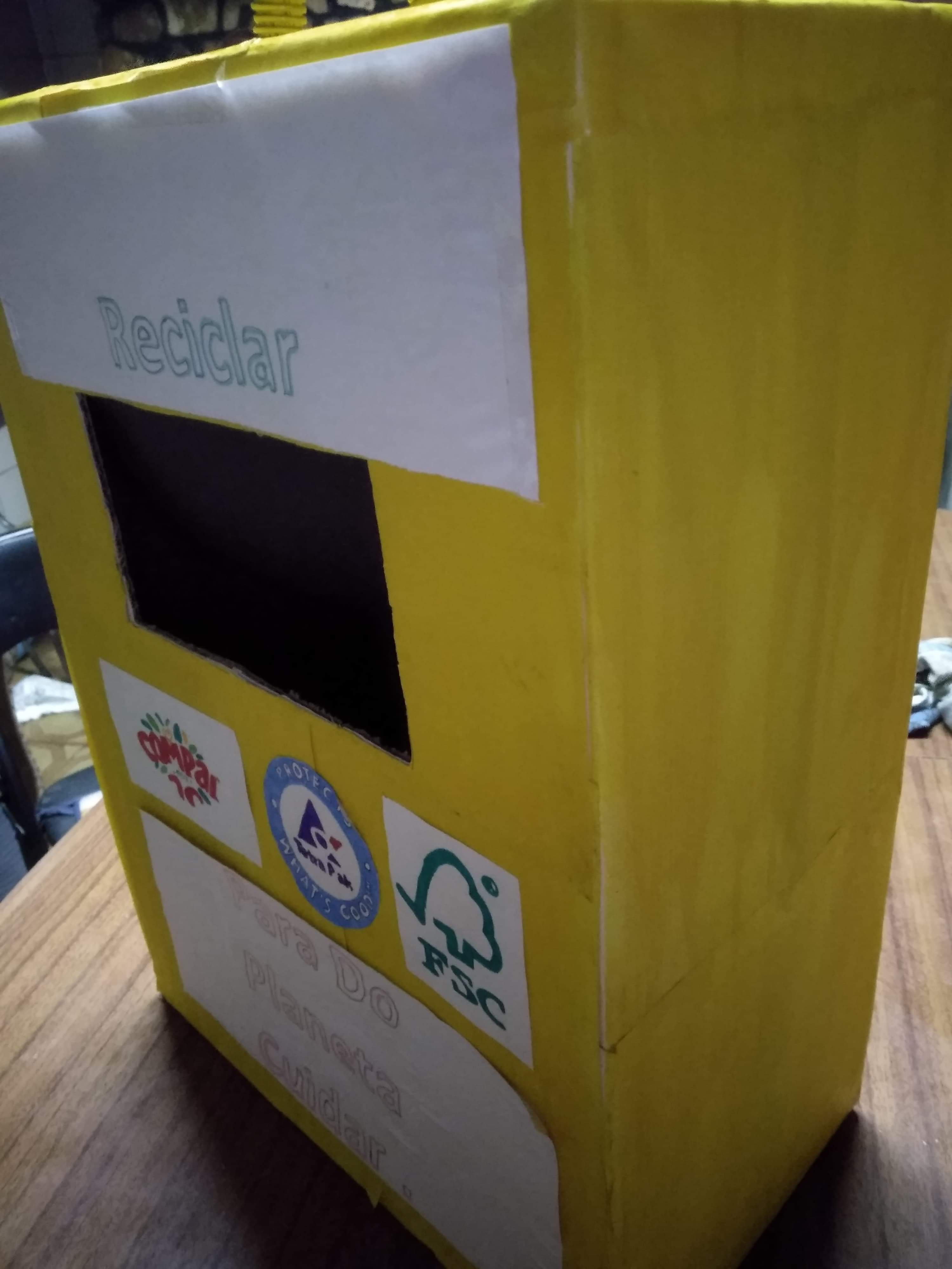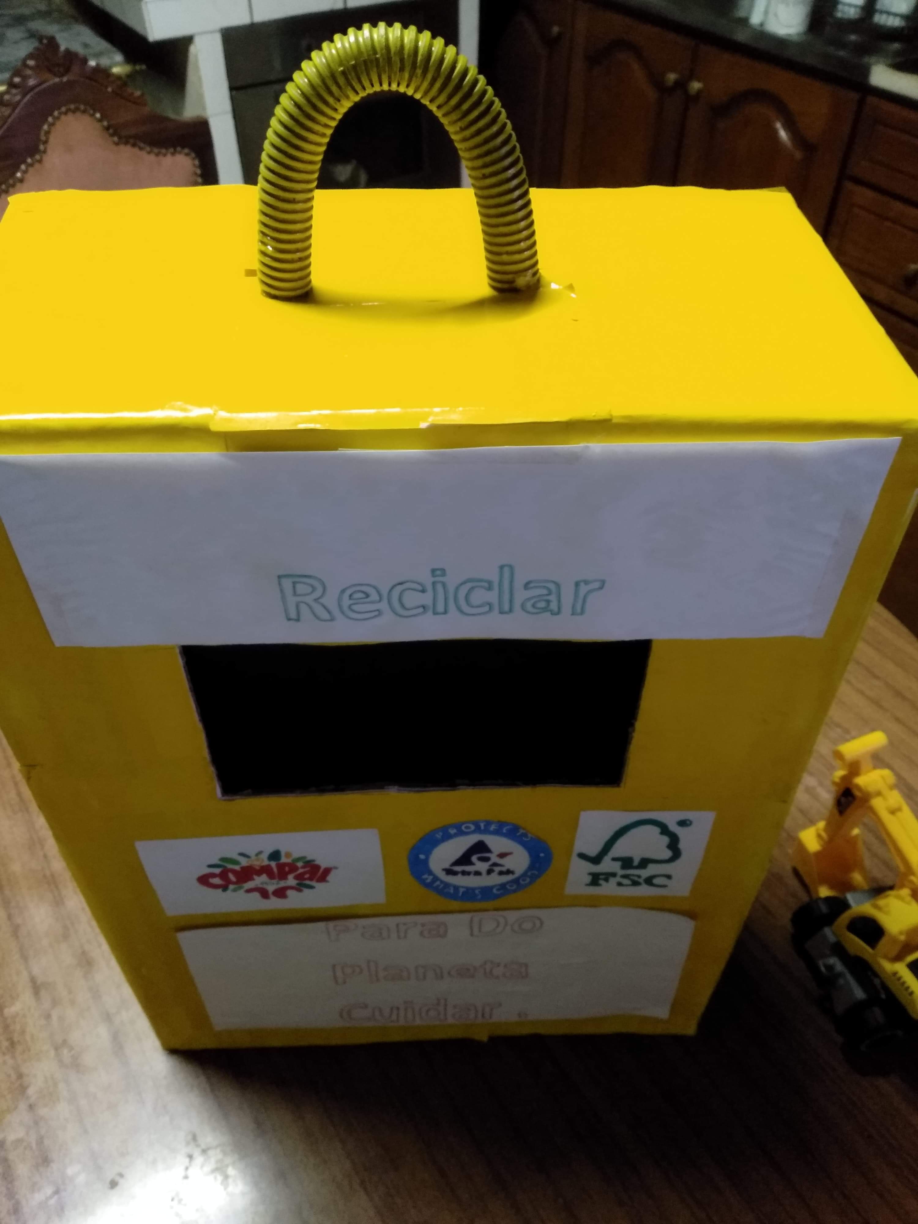 O trabalho realizado teve como base a reutilização de uma caixa de uma impressora. A aluna forrou a caixa com folhas brancas que estavam escritas, amarrotadas ou rasgadas, tendo depois de coladas, pintado com a cor amarela. A alça foi feita com um bocado de tubo de uma campainha.