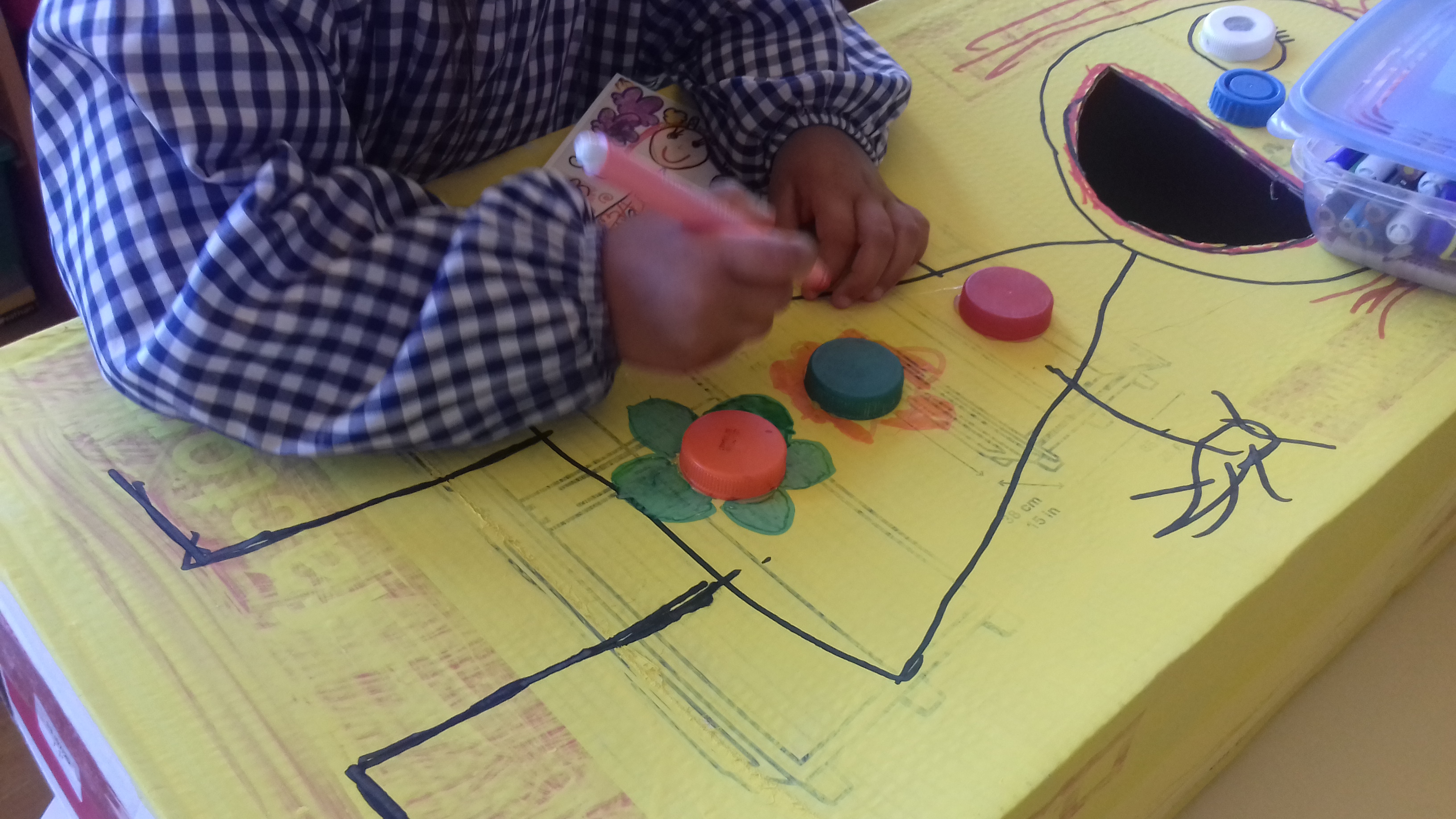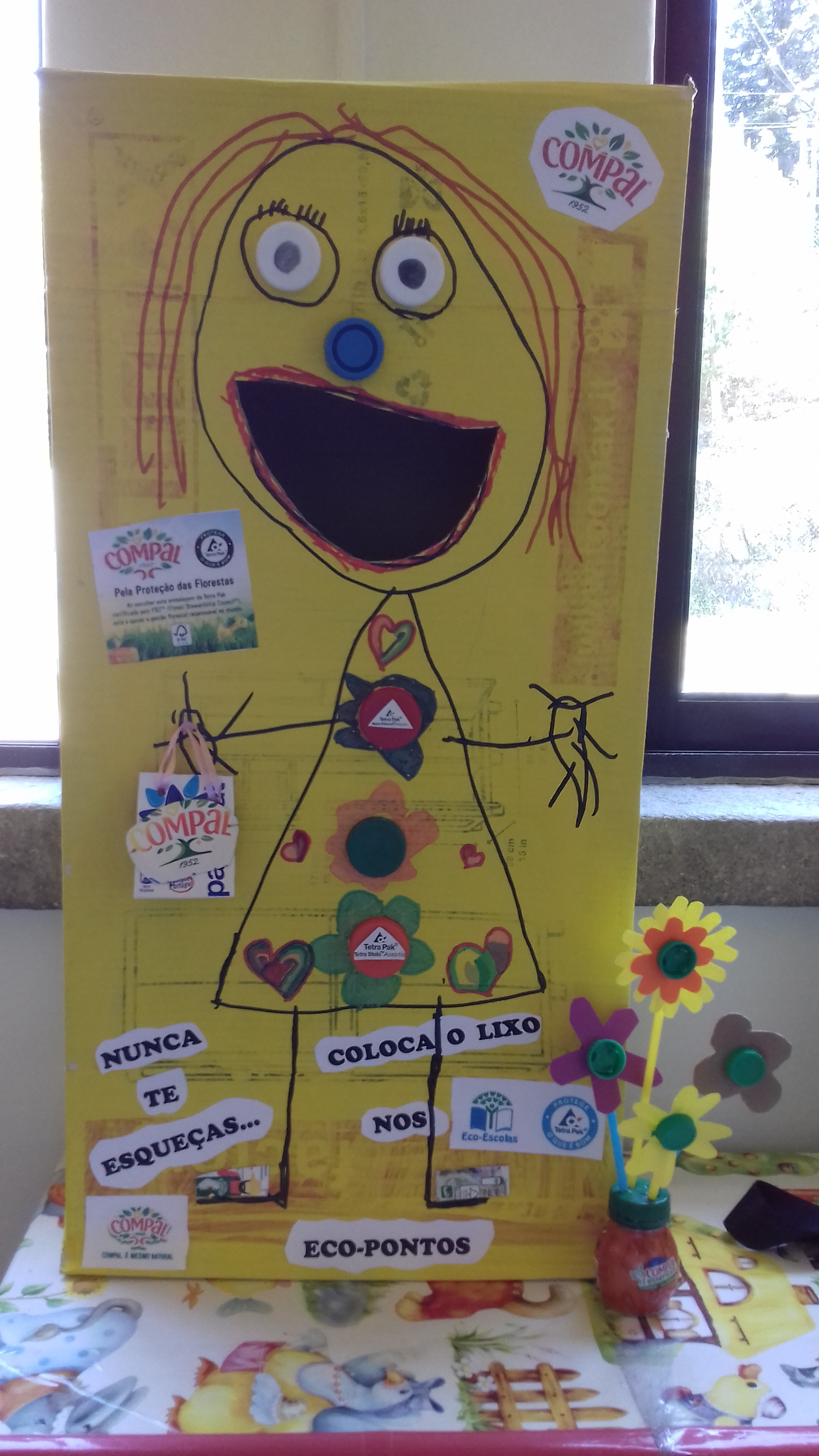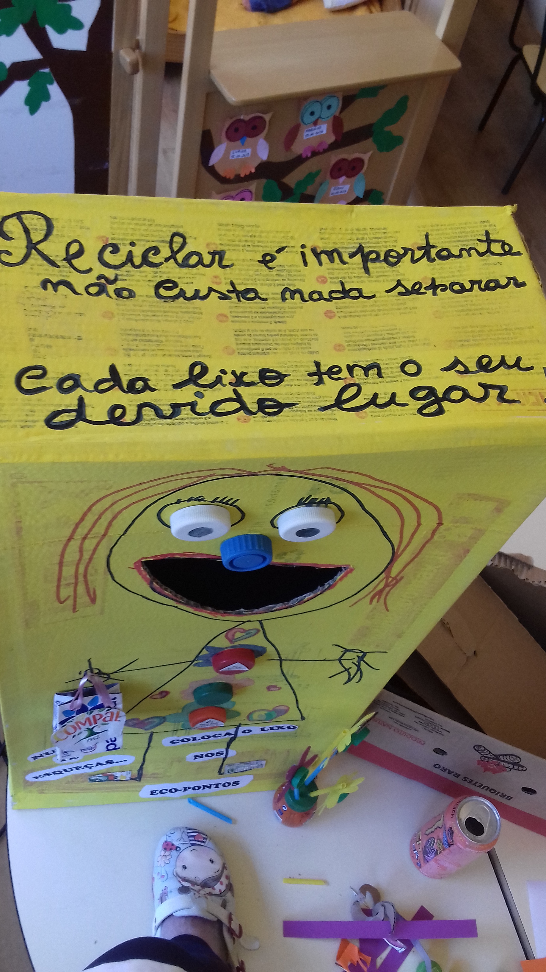 Na sequência do dia Mundial do Ambiente e da atividade o mundo está nas nossas mãos, procedemos à construção do ecoponto amarelo com uma caixa de cartão. As crianças do grupo de 3 anos pintaram a caixa, o grupo de 5 anos imaginou e criou a estrutura (desenharam e recortaram os logo tipos da compal e tetrapack e eco escolas) as crianlas do grupo de 4 anos estiveram a desenhar e pintar as flores e as colagens.