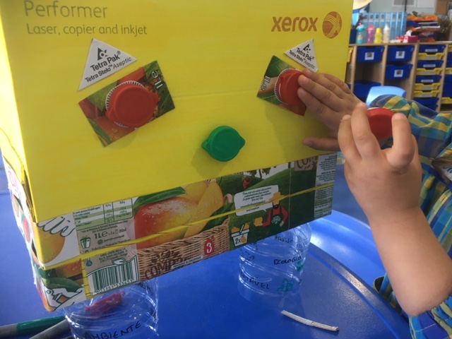 Cortaram as embalagens, colaram numa caixa de papelão. Com as garrafas de plástico fizeram os pés do boneco e depois decoraram a caixa.