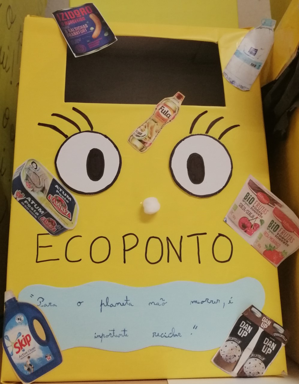 Ecoponto elaborado por 1 criança do 1º ano com materiais reciclados.