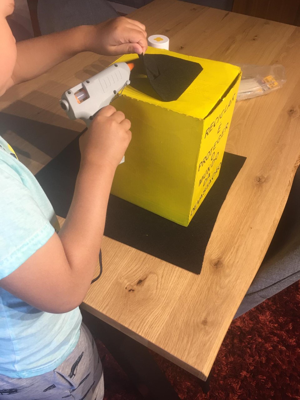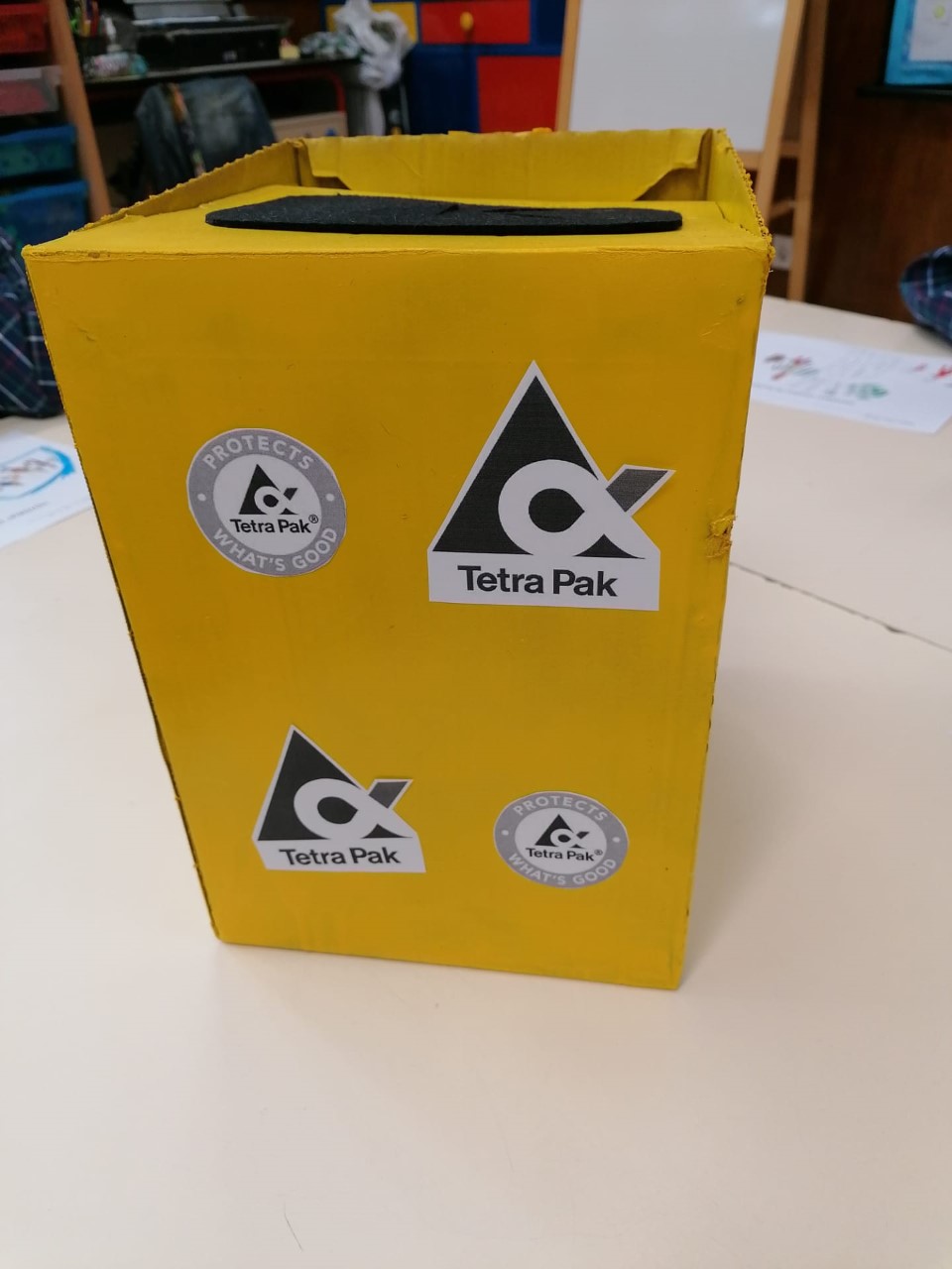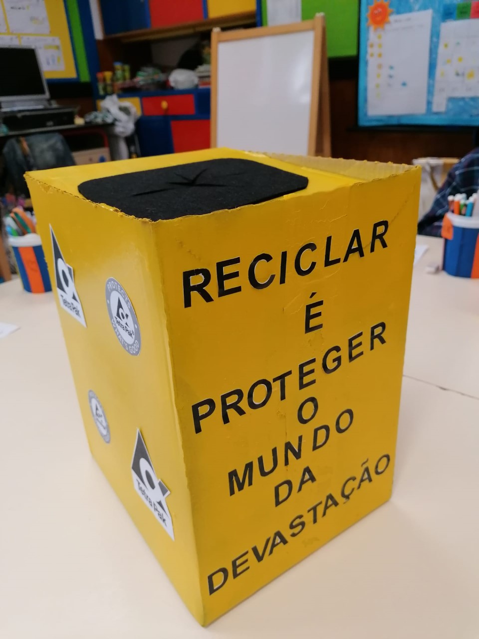 Trabalho elaborado por um aluno do pré escolar com materiais reciclados.