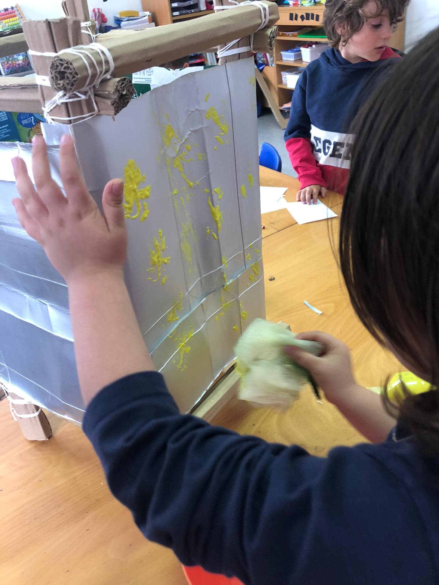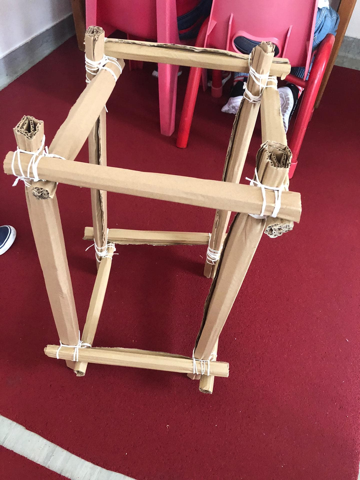O ecoponto foi construído com uma base de rolos de cartão amarrados entre si com cordel, montando a estrutura de um paralelepípedo, por sua vez rodeado de embalagens recolhidas, abertas e unidas com cola.