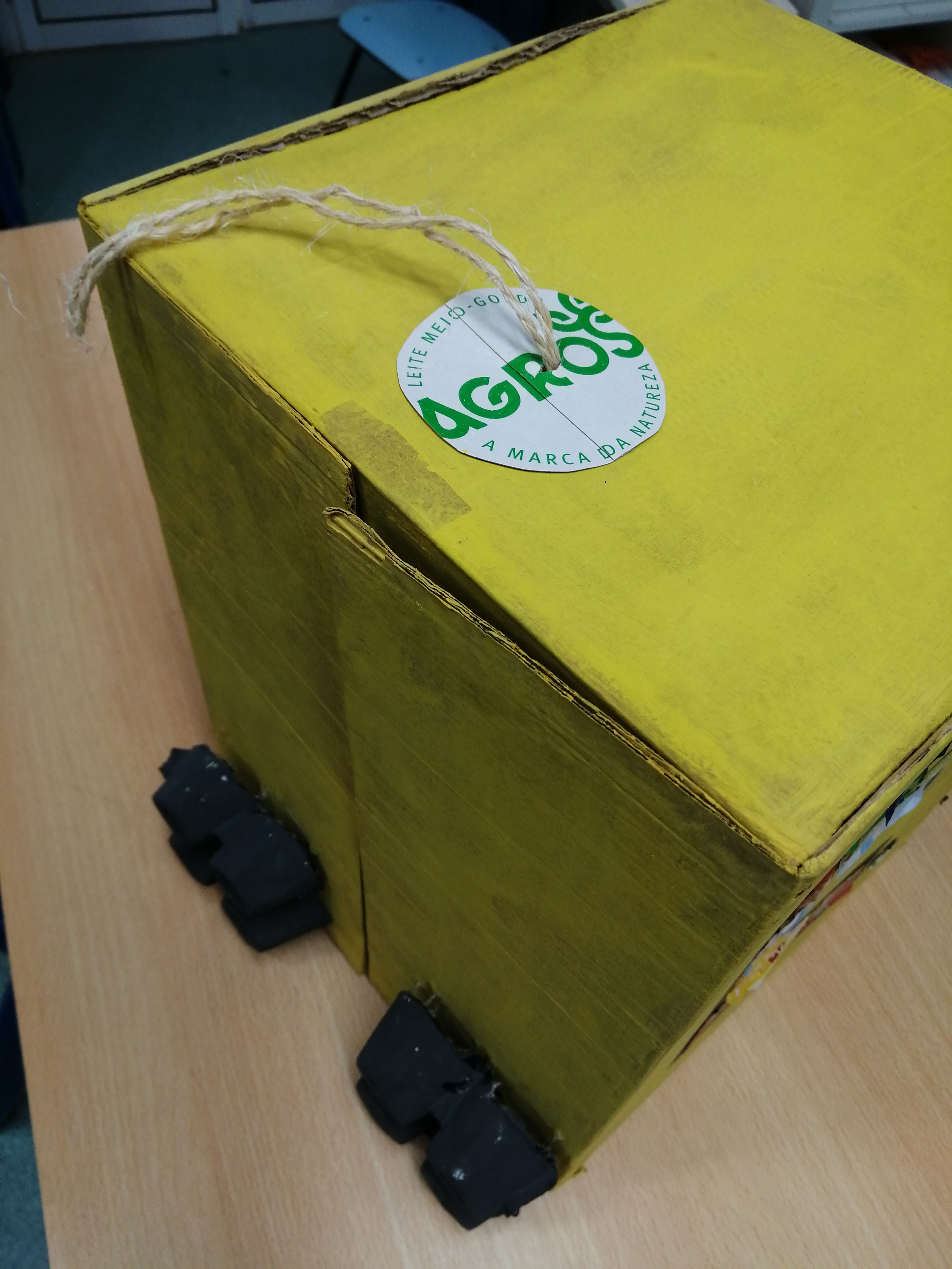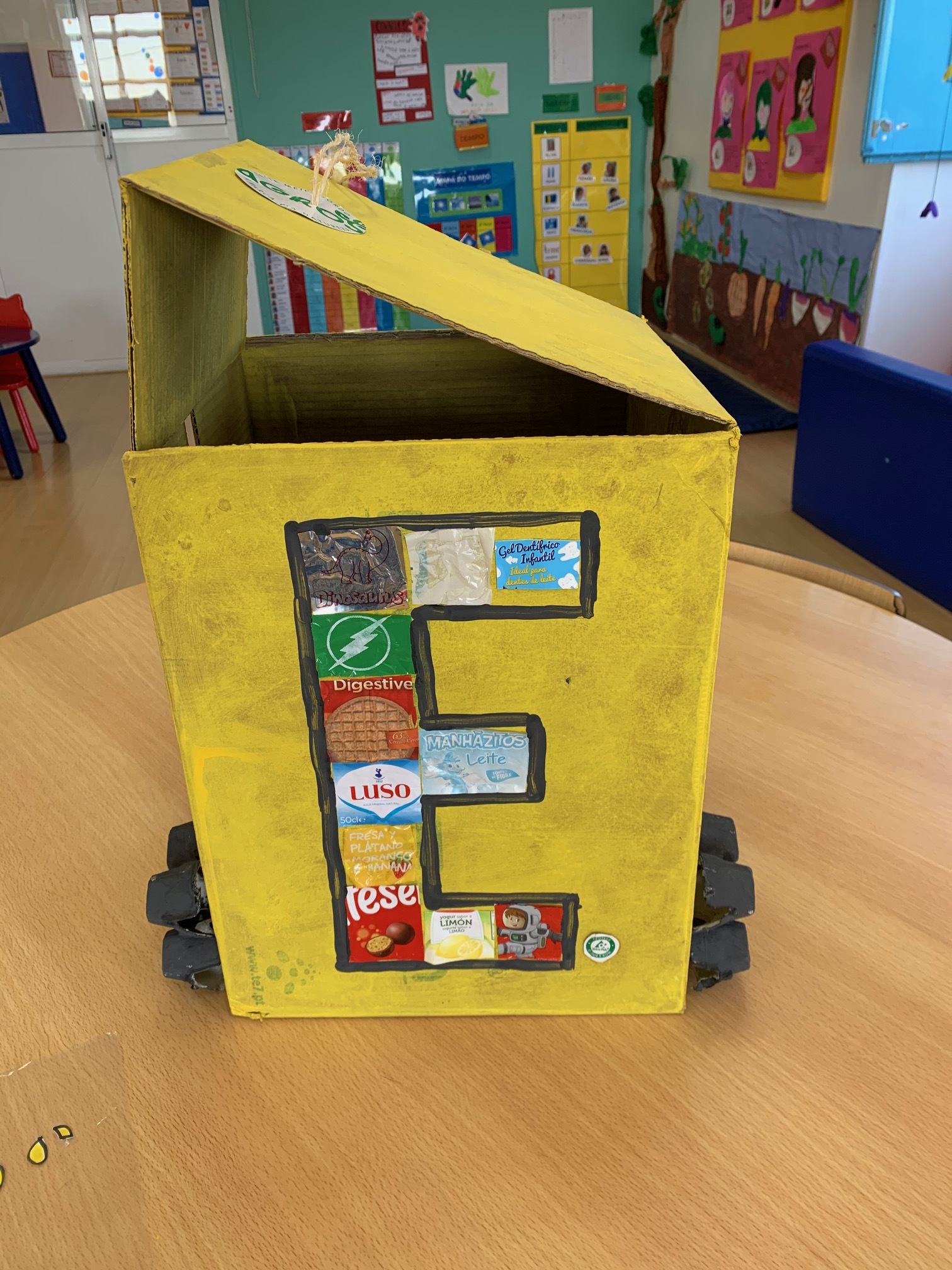 Começaram por ver os ecopontos que são utilizados na sala e relembrar a sua correta utilização. Pintaram um caixote de amarelo e após debate de ideias decidiram utilizar embalagens na construção do embalão. Estas foram selecionadas do ecoponto. Com partes das embalagens recortadas foi desenhada a letra E (embalão) e o símbolo da reciclagem foi construído com embalagens COMPAL. No final, utilizaram caixas de ovos para imitar as rodas do ecoponto e corda para imitar um puxador.
