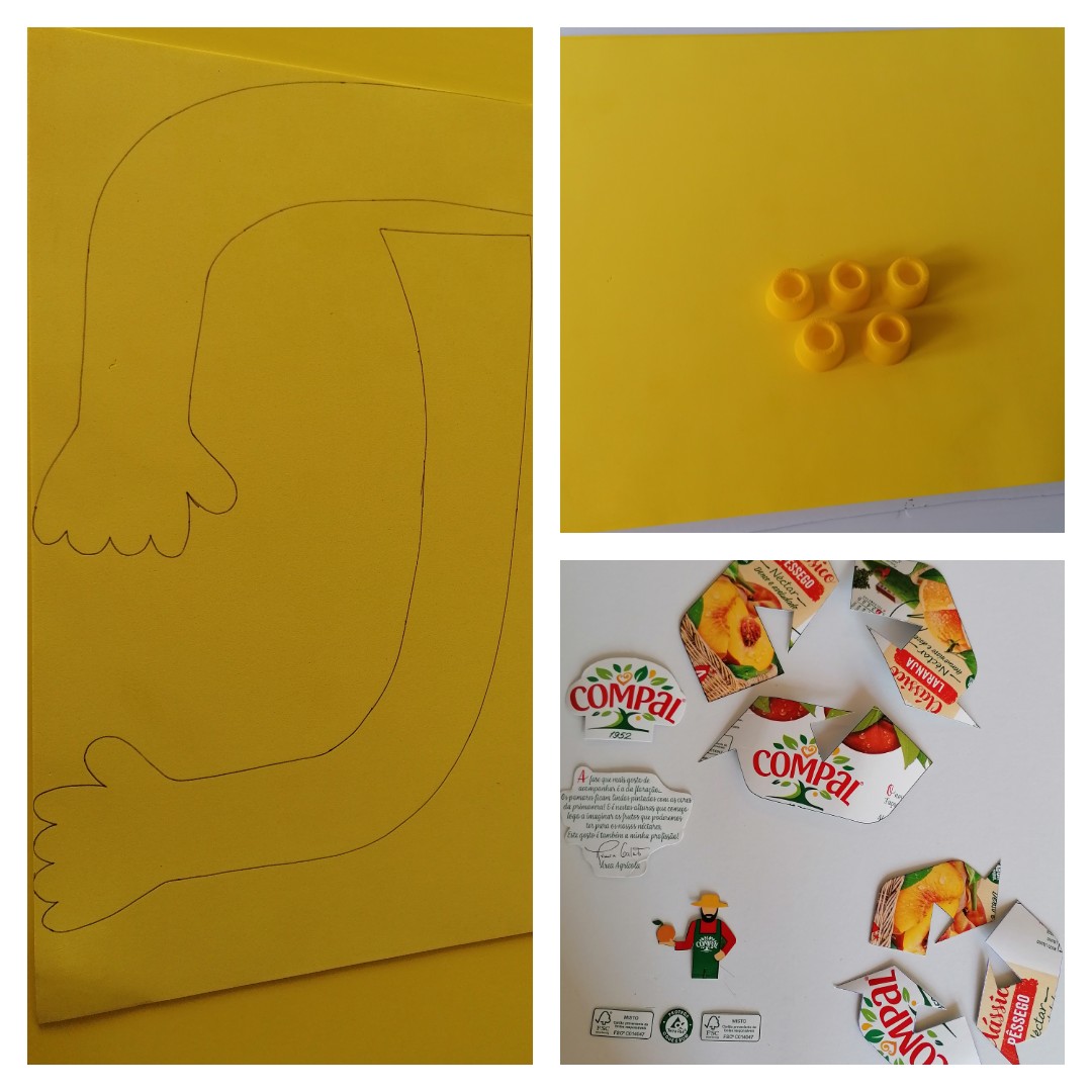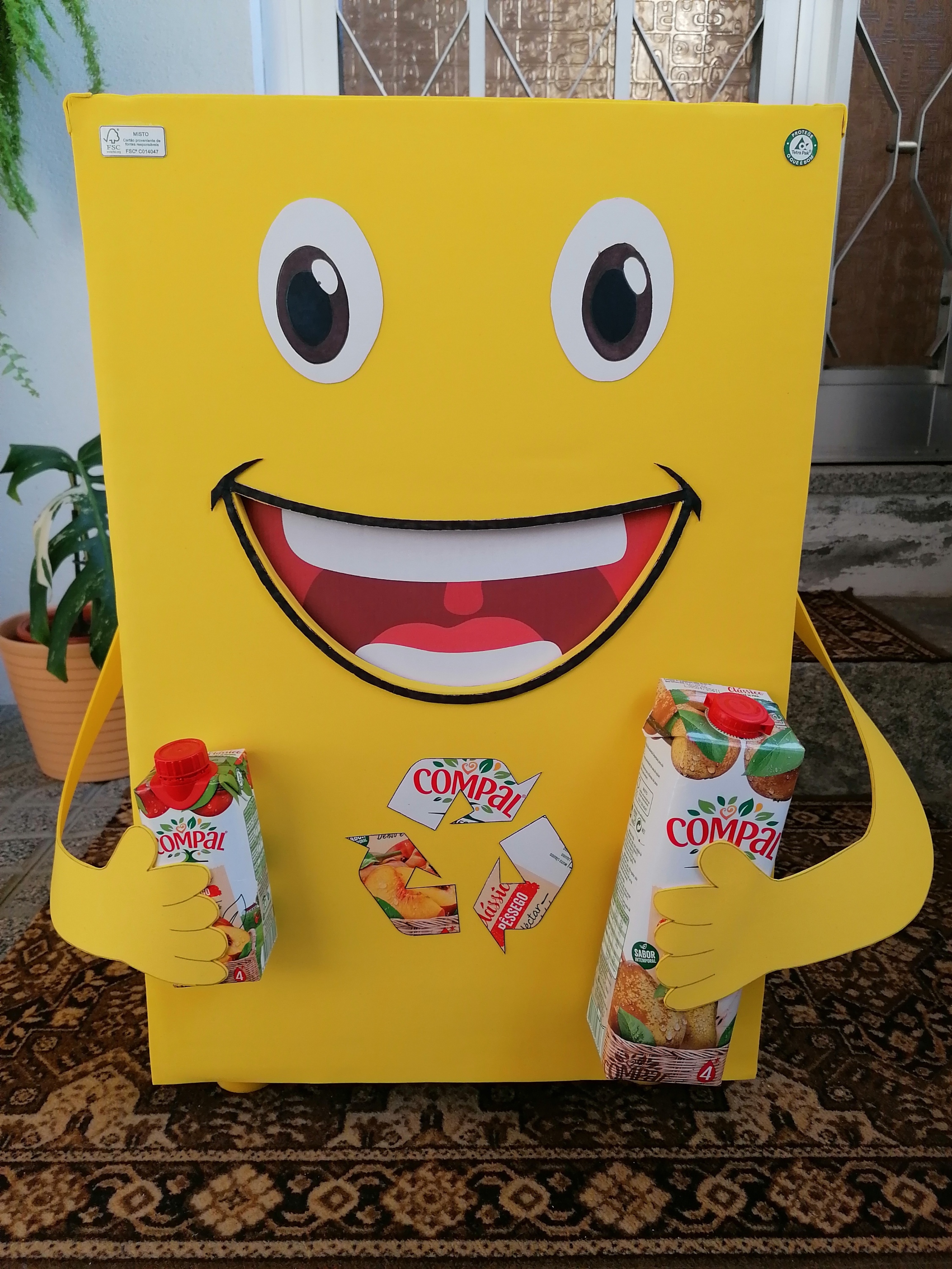 Material utilizado: 1 caixa de cartão com 60 cm de altura, desenho e ilustração com marcadores, pega de garrafão de plástico, vara de madeira, folha de eva amarela, embalagens Tetrapak da Compal de vários tamanhos e cinco tampas plásticas de garrafão para apoio.