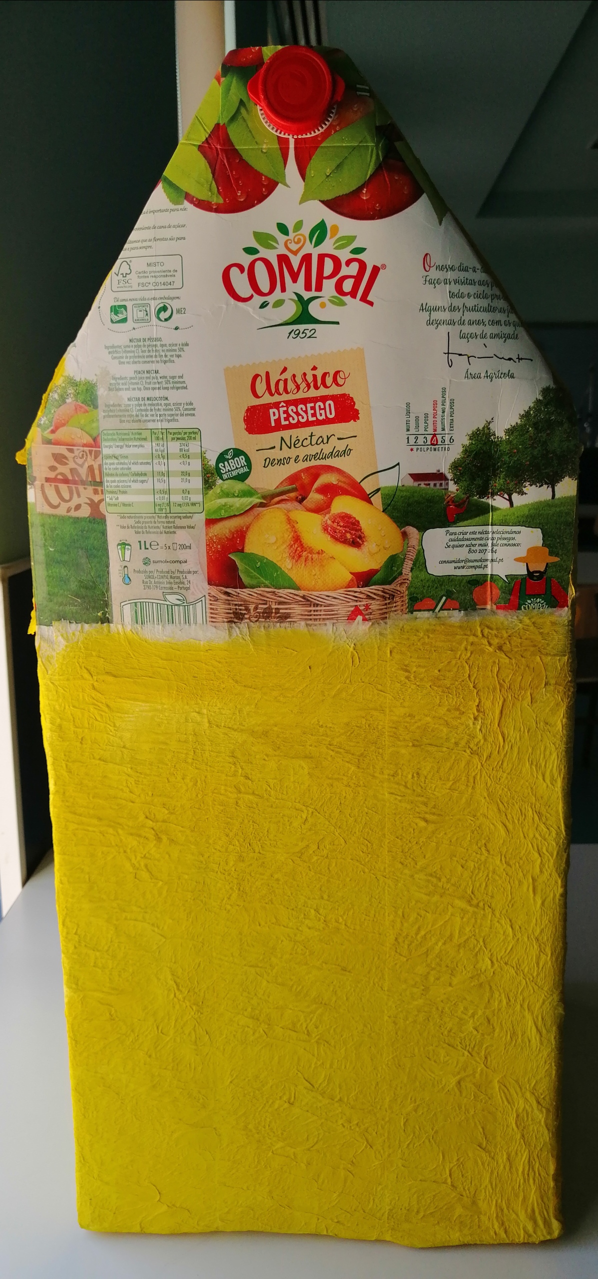 Material utilizado: 2 caixas de cartão com 40 cm e 20 cm de altura, papel higiénico, cola branca, tinta spray, embalagens Tetrapak da Compal de vários tamanhos e duas tampas plásticas dessas mesmas embalagens, tubo de eletricidade de plástico com 20cm de comprimento, desenho e pintura do símbolo da reciclagem a cor verde.