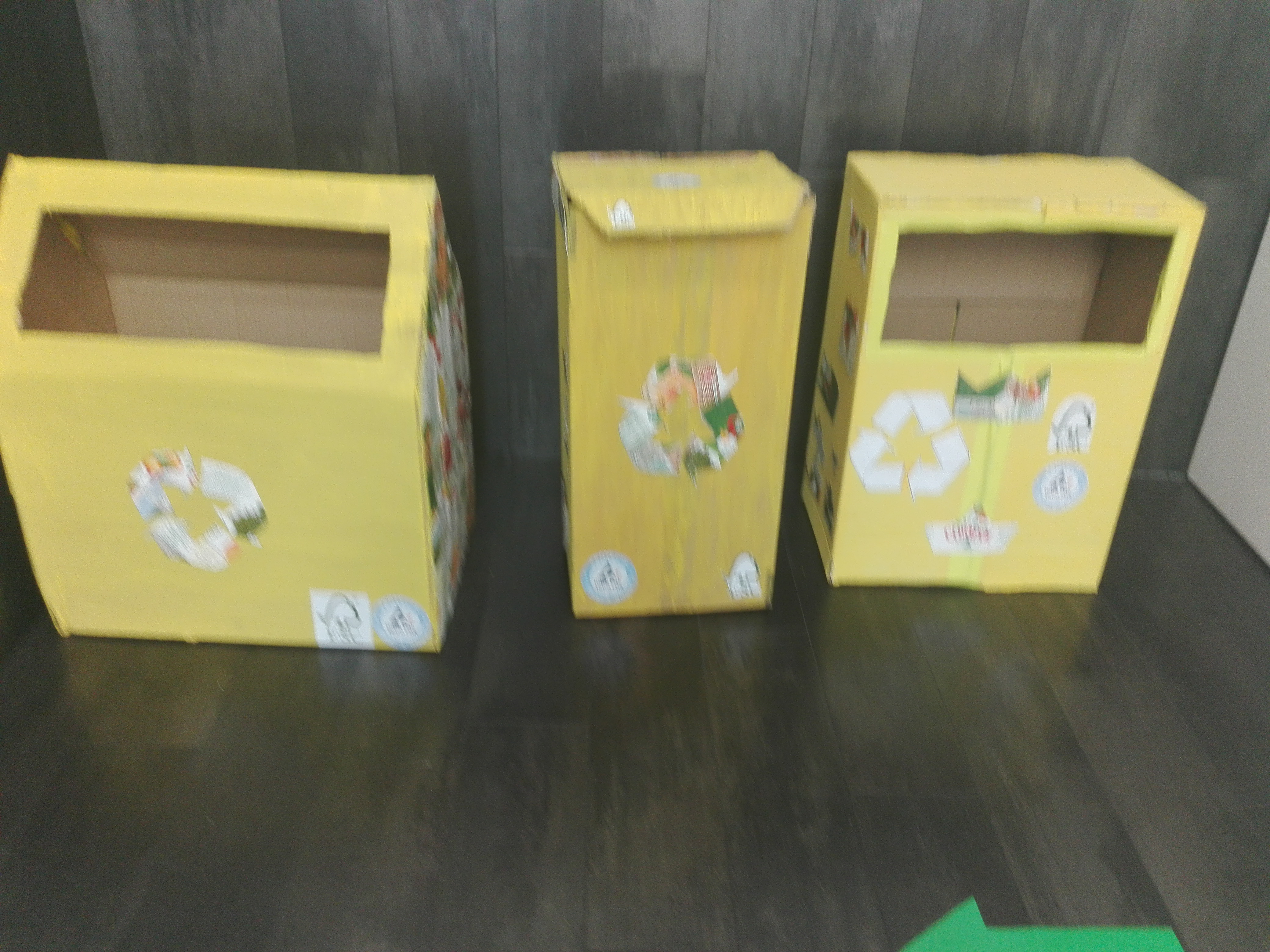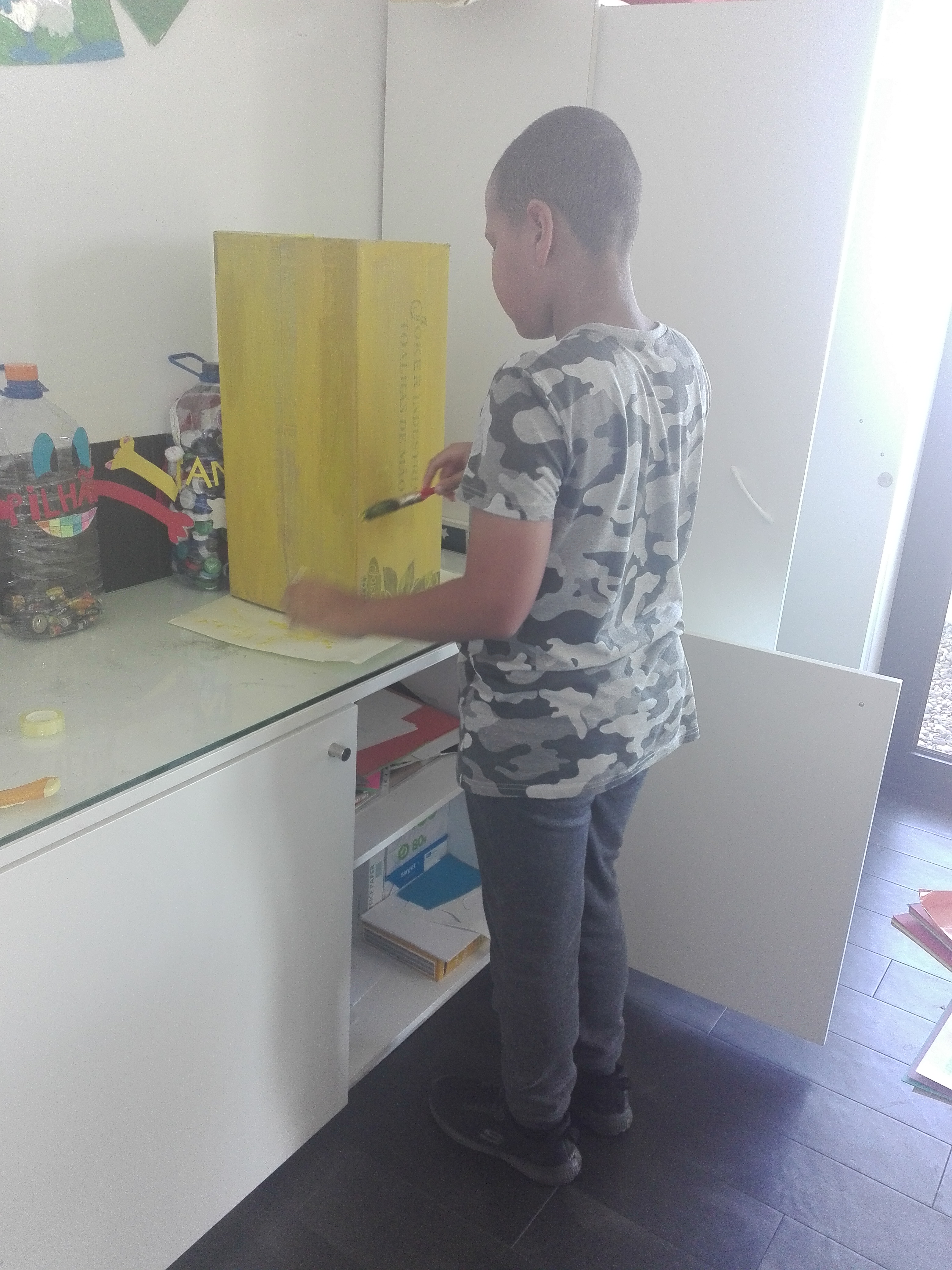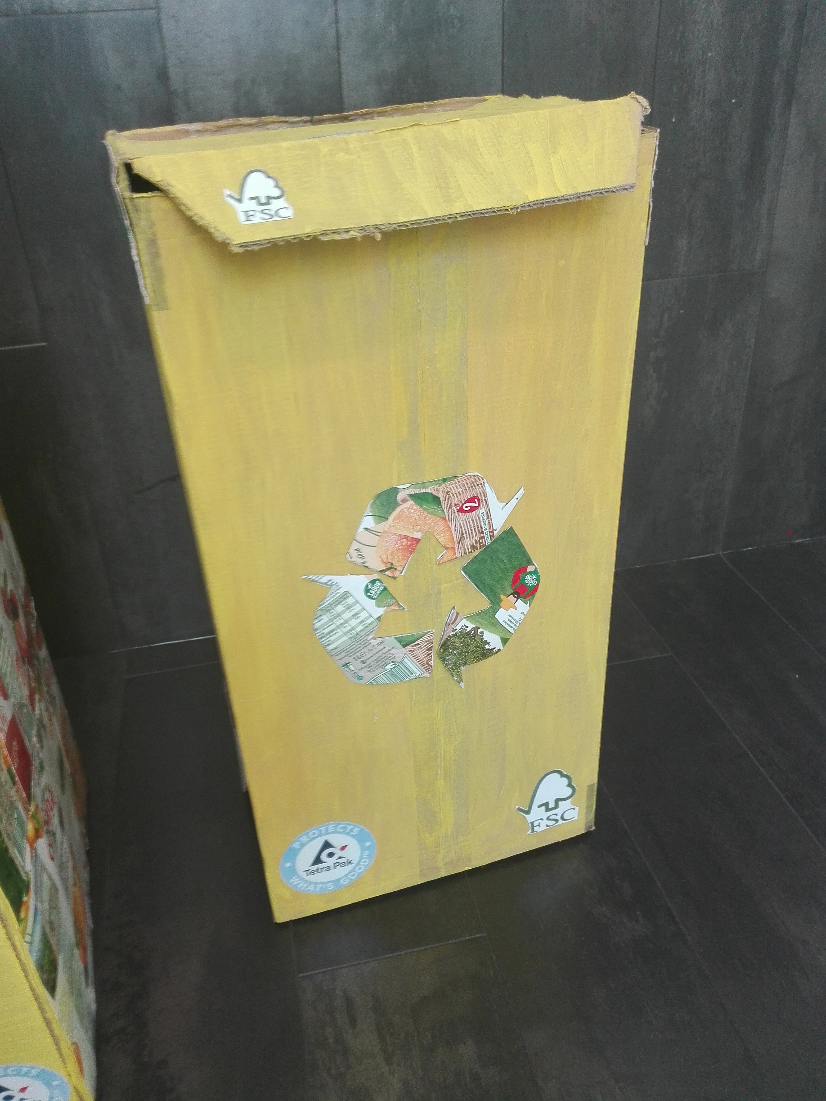 Este Ecoponto foi elaborado pela turma do 4º ano, que pegou num caixote de toalhas de papel, quase destruído, conseguiram reconstruí-lo e fazer um ecoponto amarelo. O mais engraçado é que quase que parecia impossível a sua reutilização.