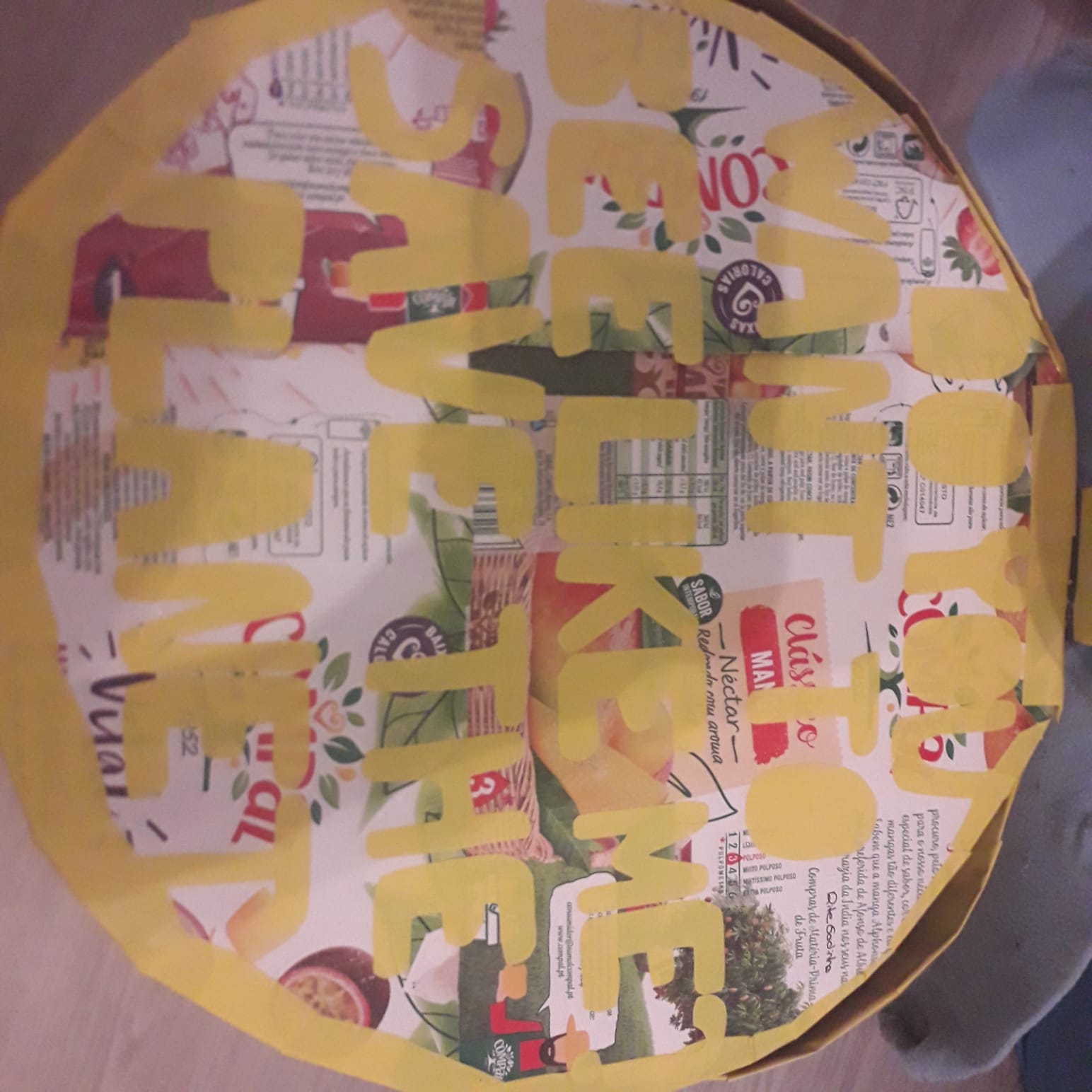 Foi feito com embalagem tetrapack da Compal e desperdicios de cartão e papel autocolante amarelo que já existia na escola de outra atividades.