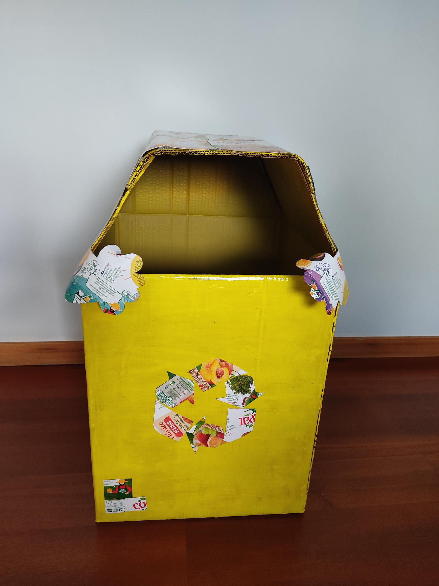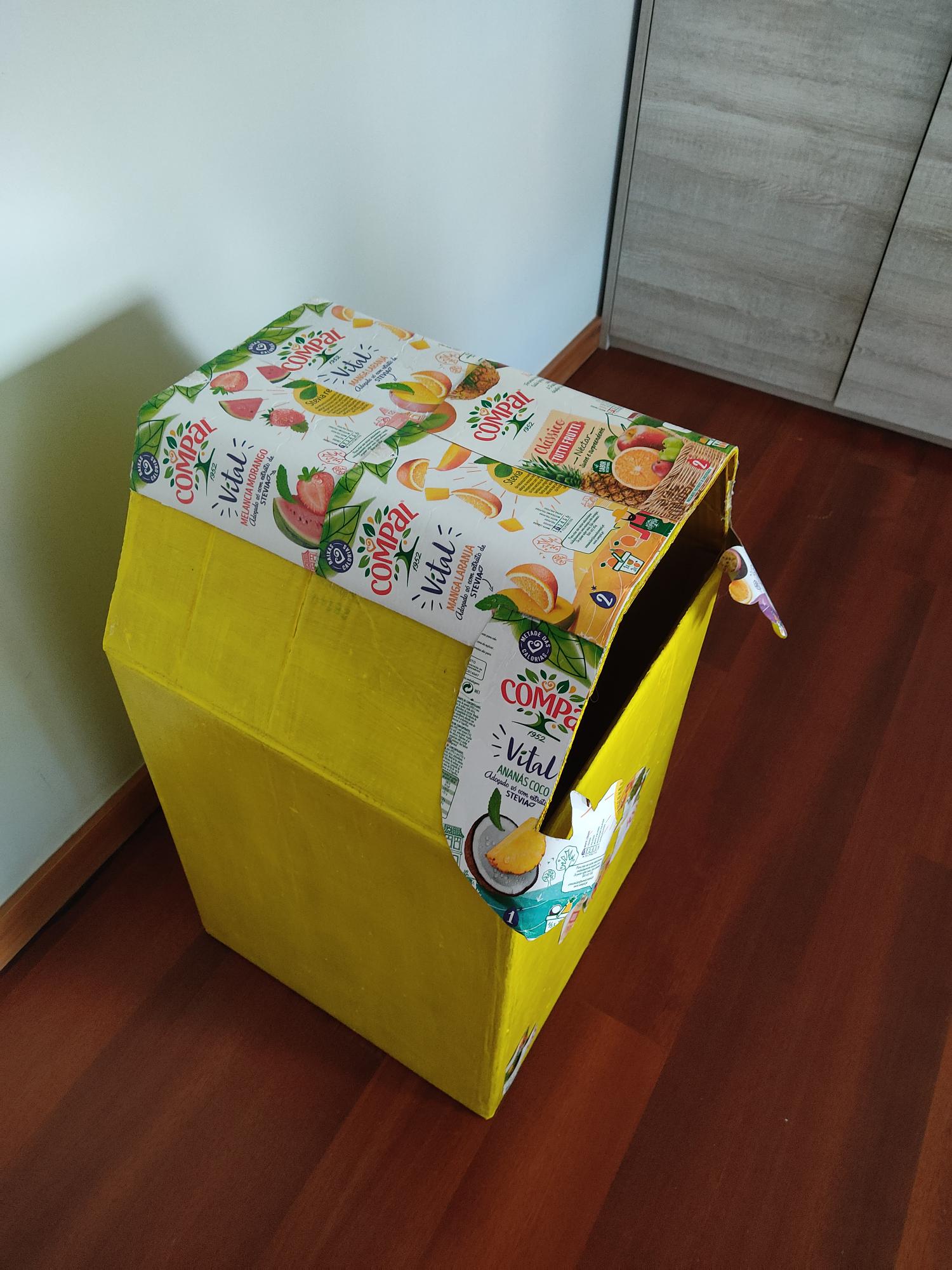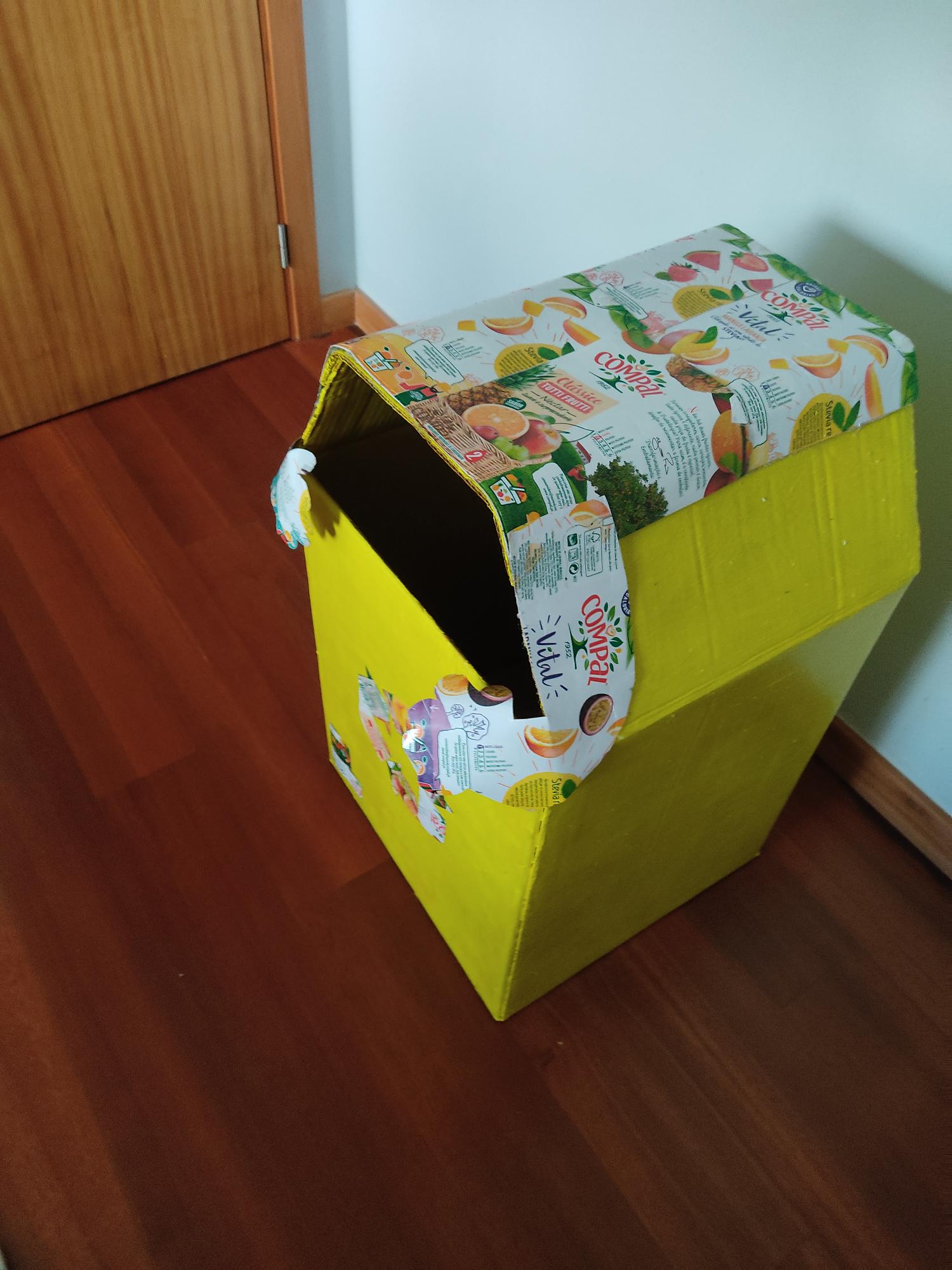 O aluno participou na recolha de embalagens Compal, para realizar uma construção do ecoponto amarela. Para tal, utilizou uma caixa de 40 cm, fita-cola para fechar a base da caixa, cola quente para colar as embalagens da Compal, o símbolo da reciclagem, o símbolo do FSC, tinta amarela para dar cor ao trabalho.