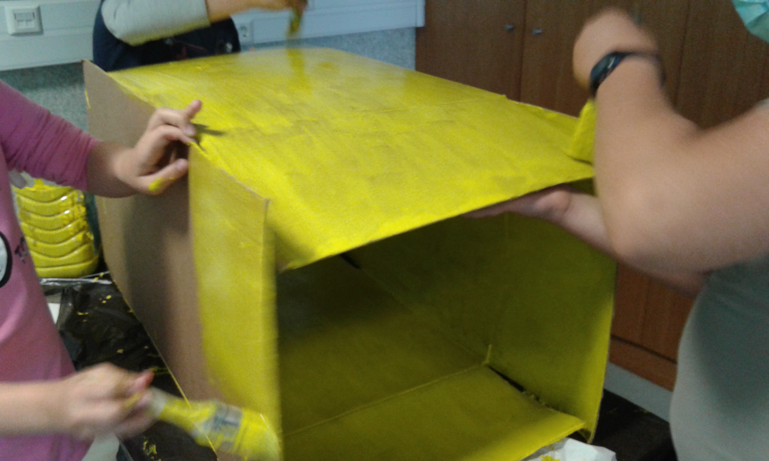 1.º Pintar uma caixa com tinta amarela.
