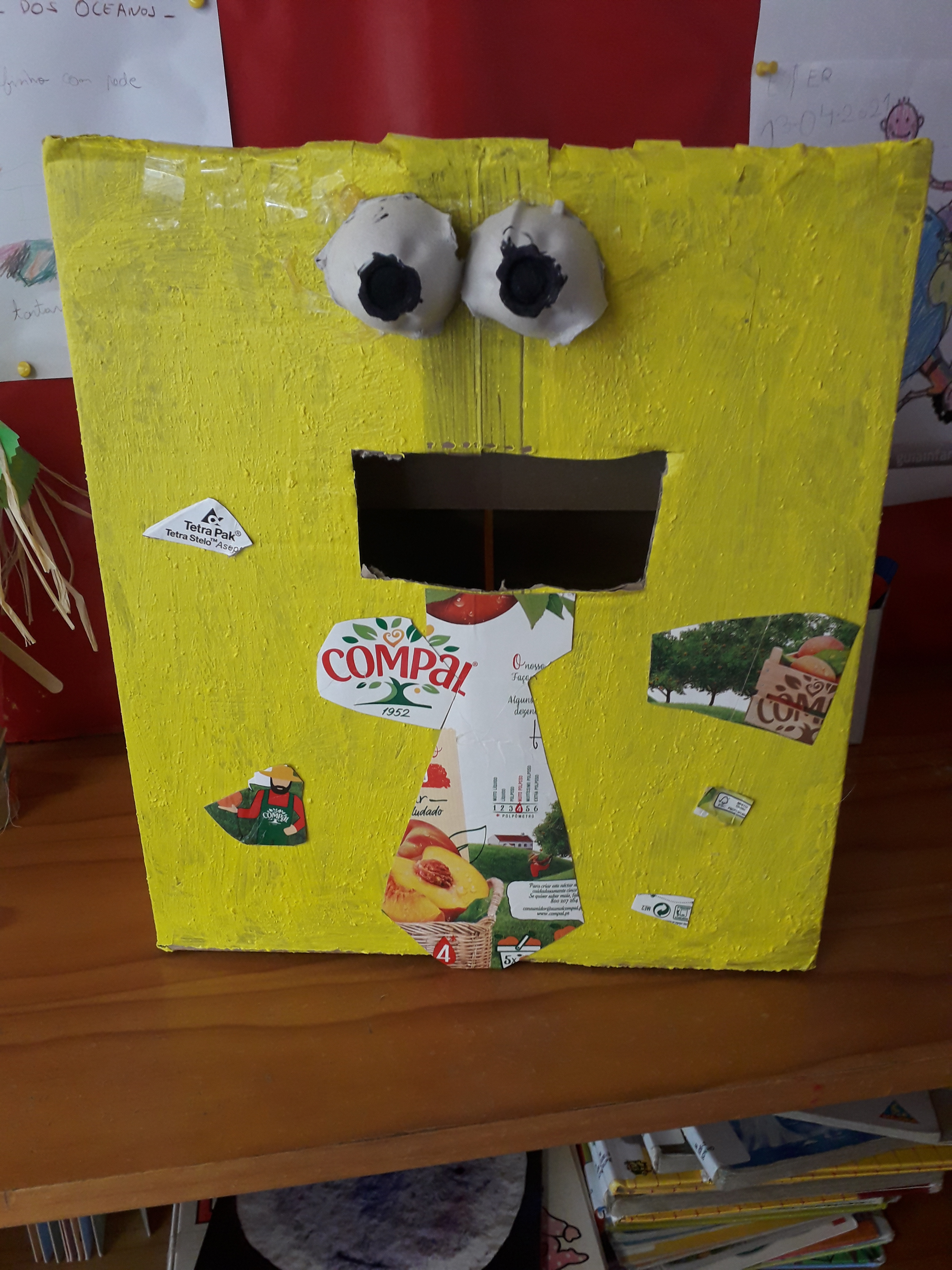 Os alunos pintaram uma caixa de cartão, que tinha chegado à escola como embalagem de toalhas de papel, construíram os olhos reutilizando caixas de ovos e decoraram-no com embalagens Tetra Pack da Compal.