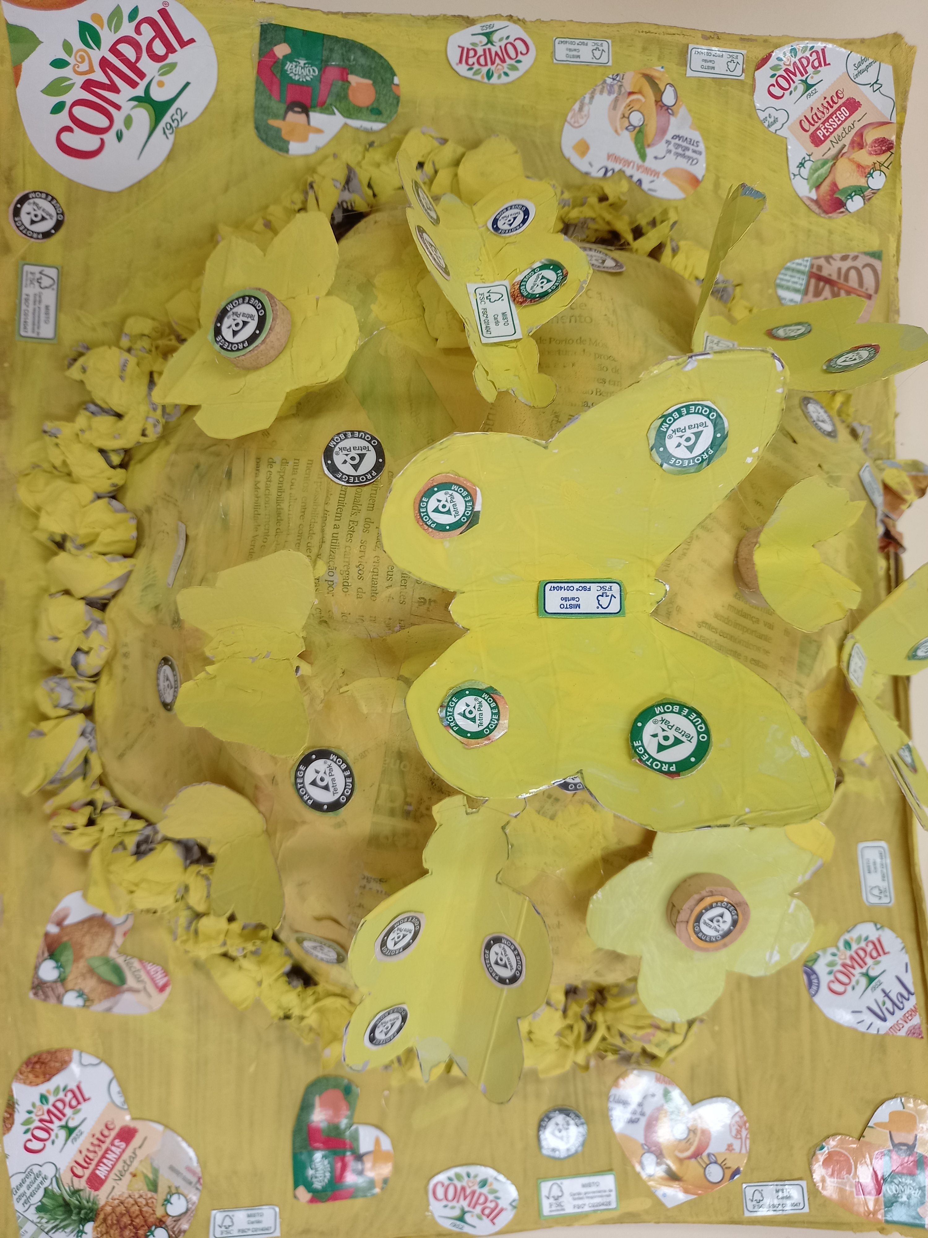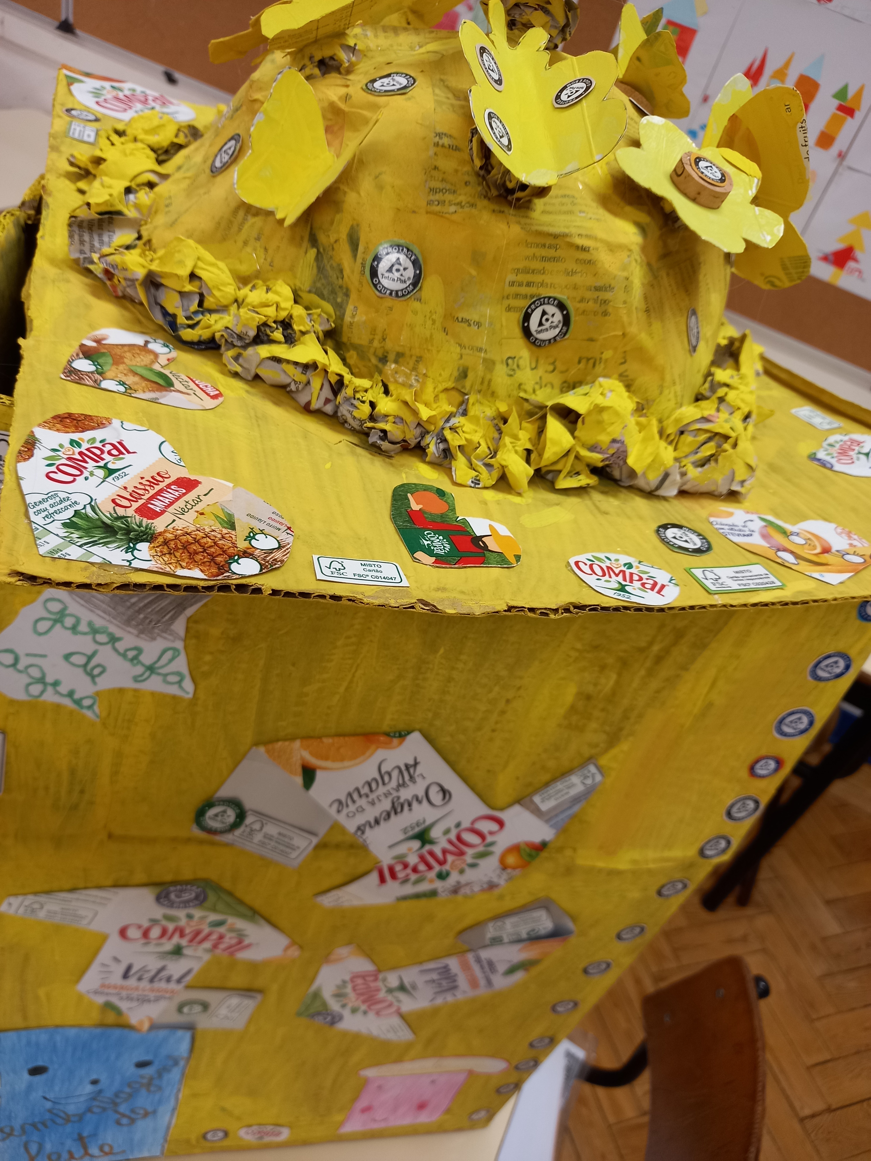 MATERIAIS: Caixote de cartão, cartão, papel (de jornal, revistas e folhetos), tinta guache amarela, pinceis, embalagens da Compal, plásticos, embalagens, rolhas de cortiça, cola UHU.