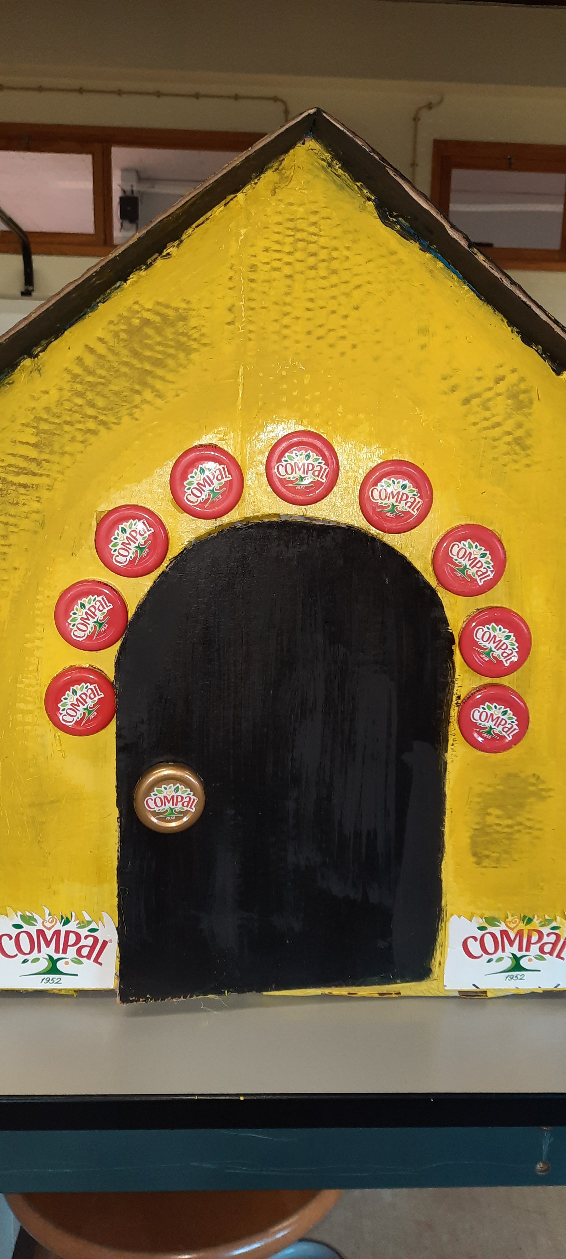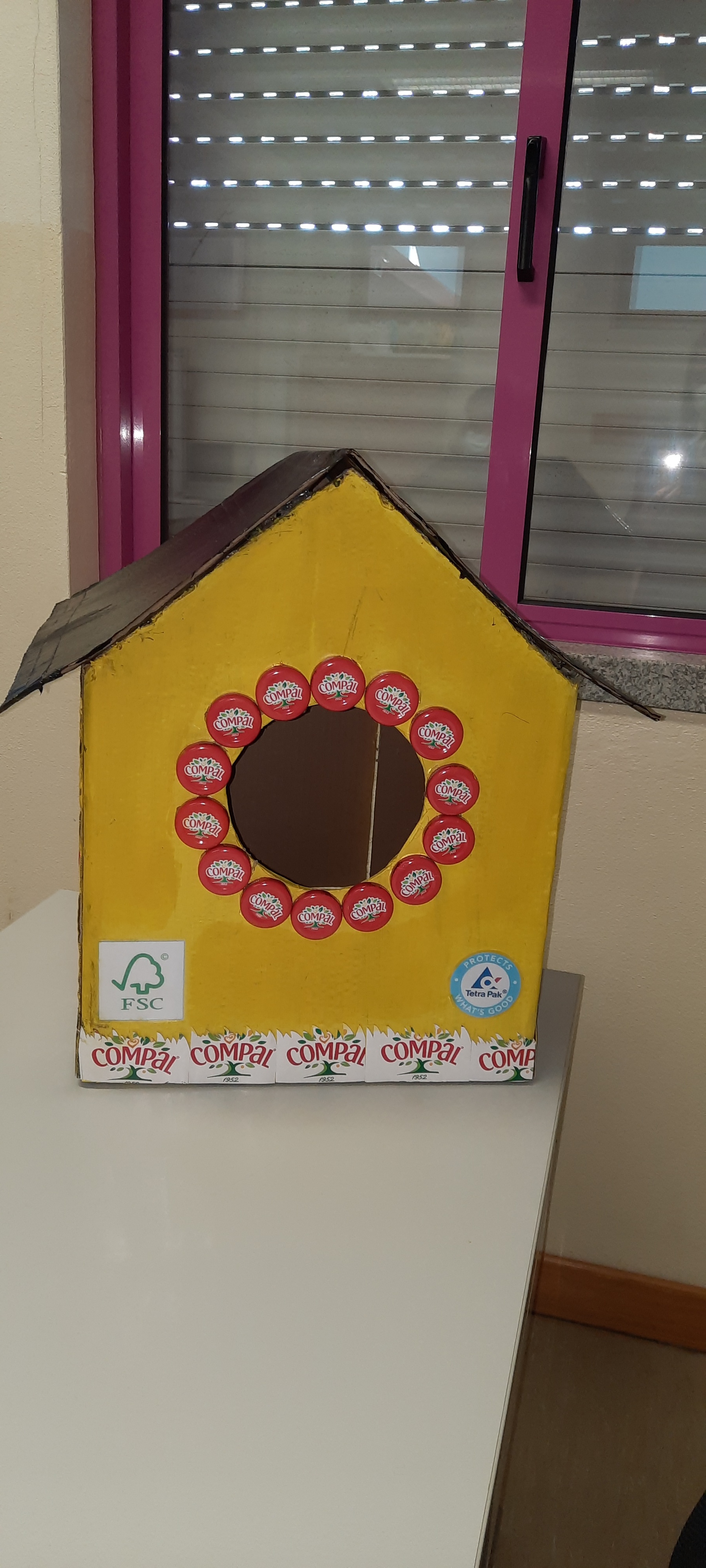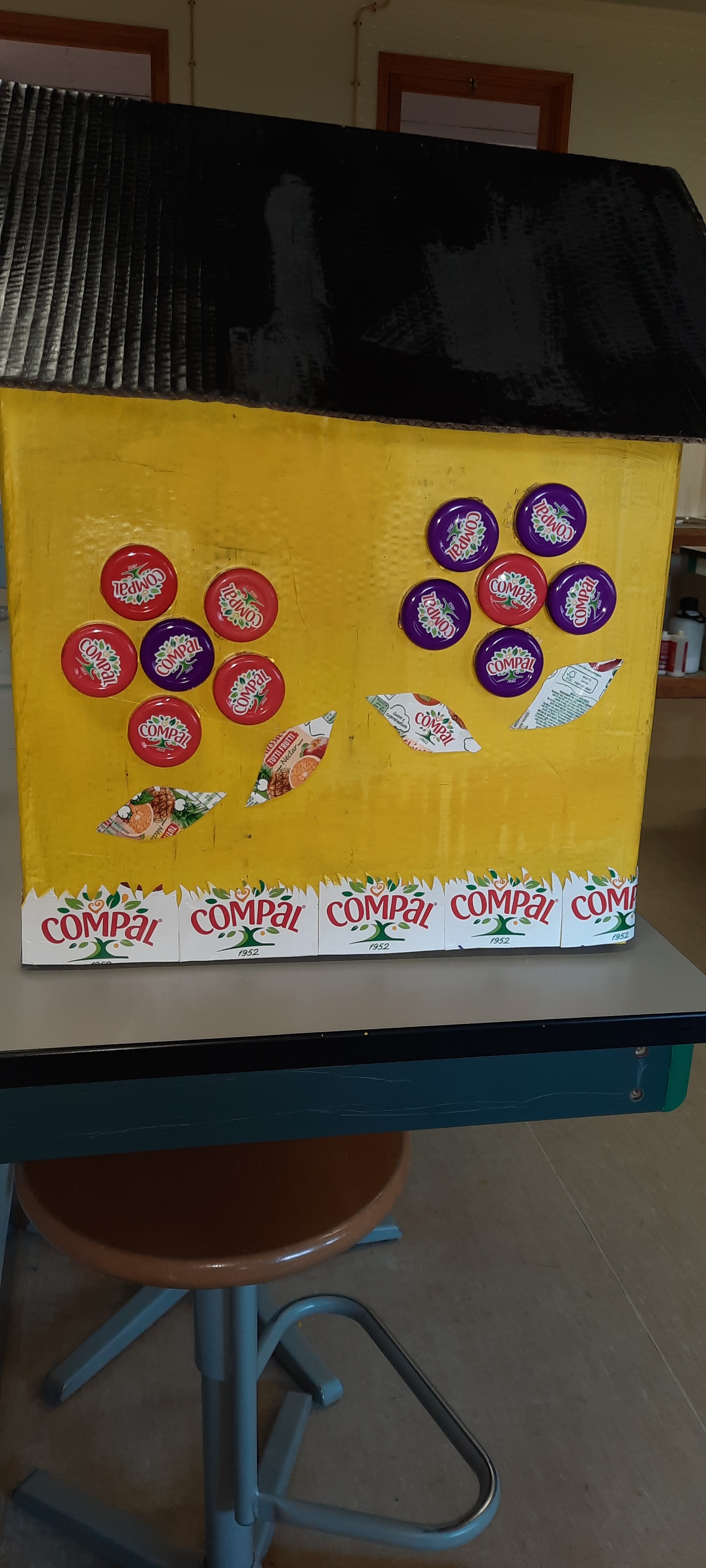 - Material predominante: cartão e embalagens da Tetra Pak da marca Compal;