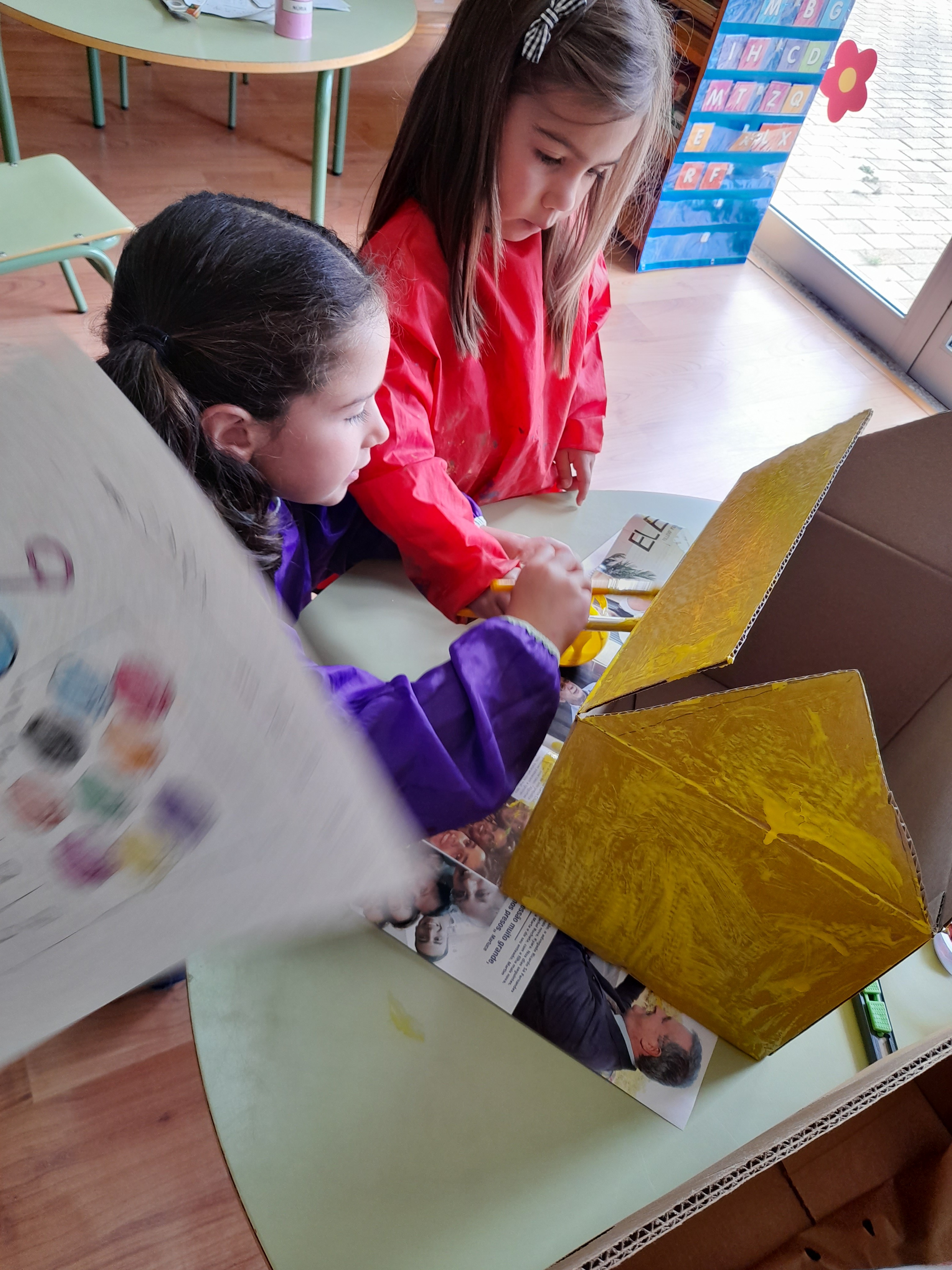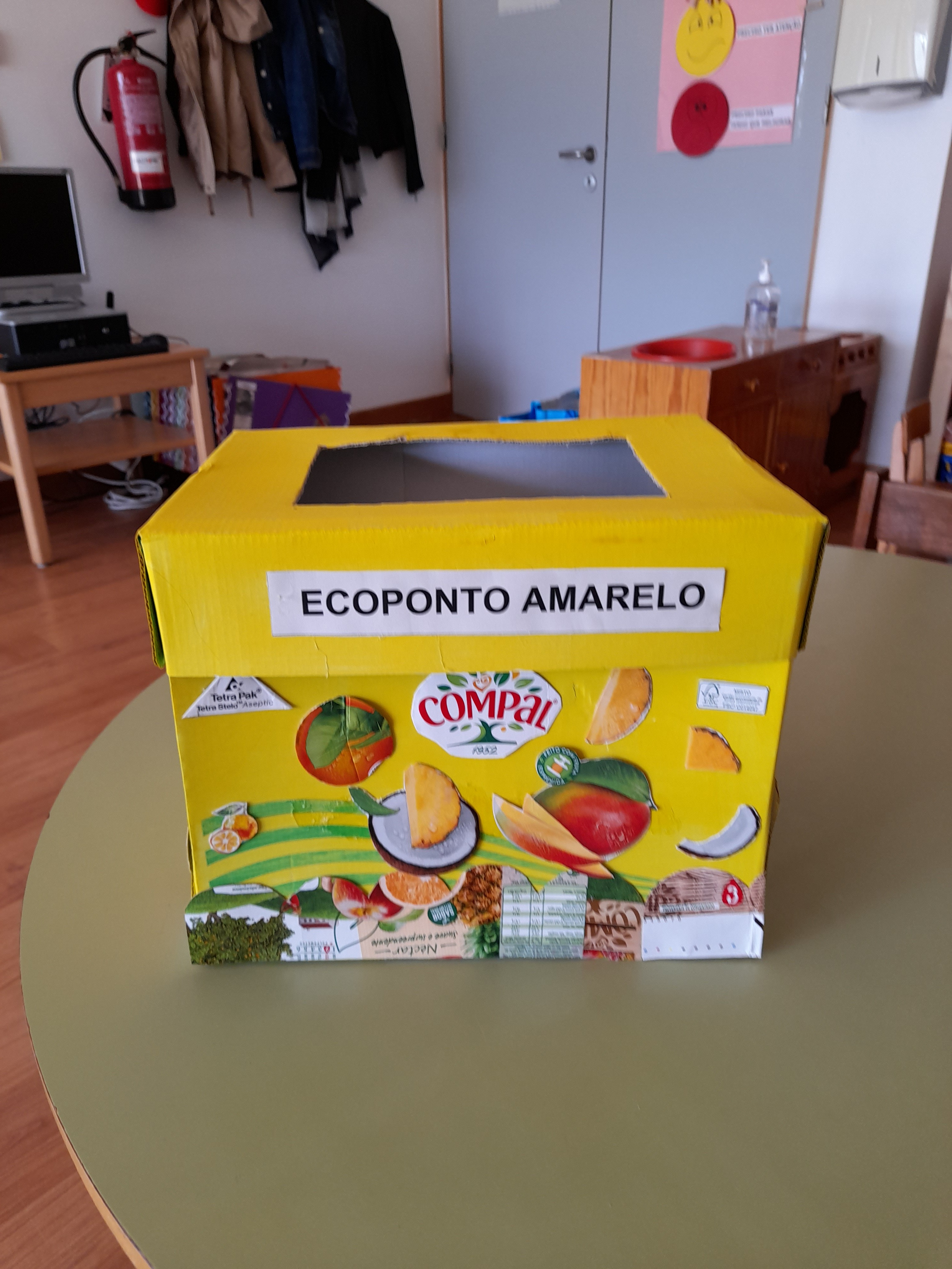 Na continuidade do trabalho realizado na sala de atividades, construímos dois ecopontos amarelos que são utilizados na escola. As crianças recolheram as embalagens Tetrapak, pintaram as caixas de cartão e recortaram as embalagens para colocação nos ecopontos. Todas participaram com entusiasmo na elaboração dos ecopontos e procedem com responsabilidade à separação do lixo.