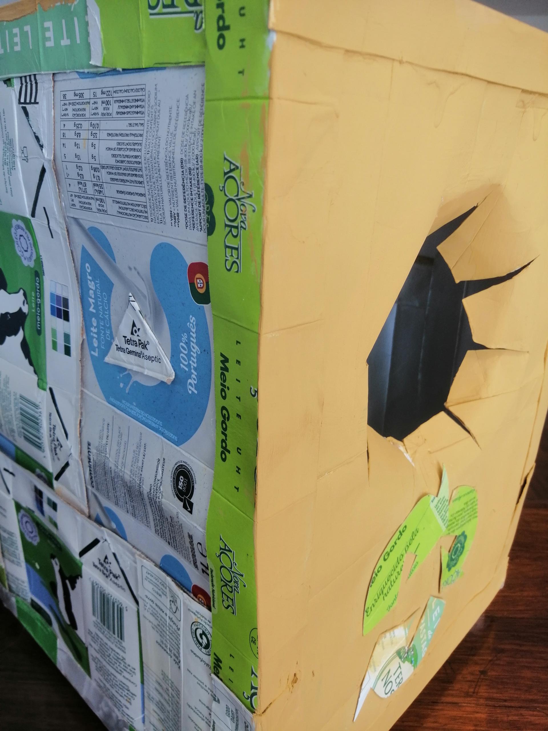 Fase 2 – Lavagem e Construção - Após a recolha de todas as embalagens foi feita uma lavagem geral de forma a poder trabalhar no recorte das mesmas, passando assim a abertura das embalagens para o processo de secagem. Posto isto passamos à construção com a utente do centro de convívio, e com ajuda da monitora, proceder ao processo criativo e de construção dos mesmos ecopontos. Após a construção de cada um dos 3 ecopontos através de colagem das embalagens, procedeu se à pintura de cor amarela.
