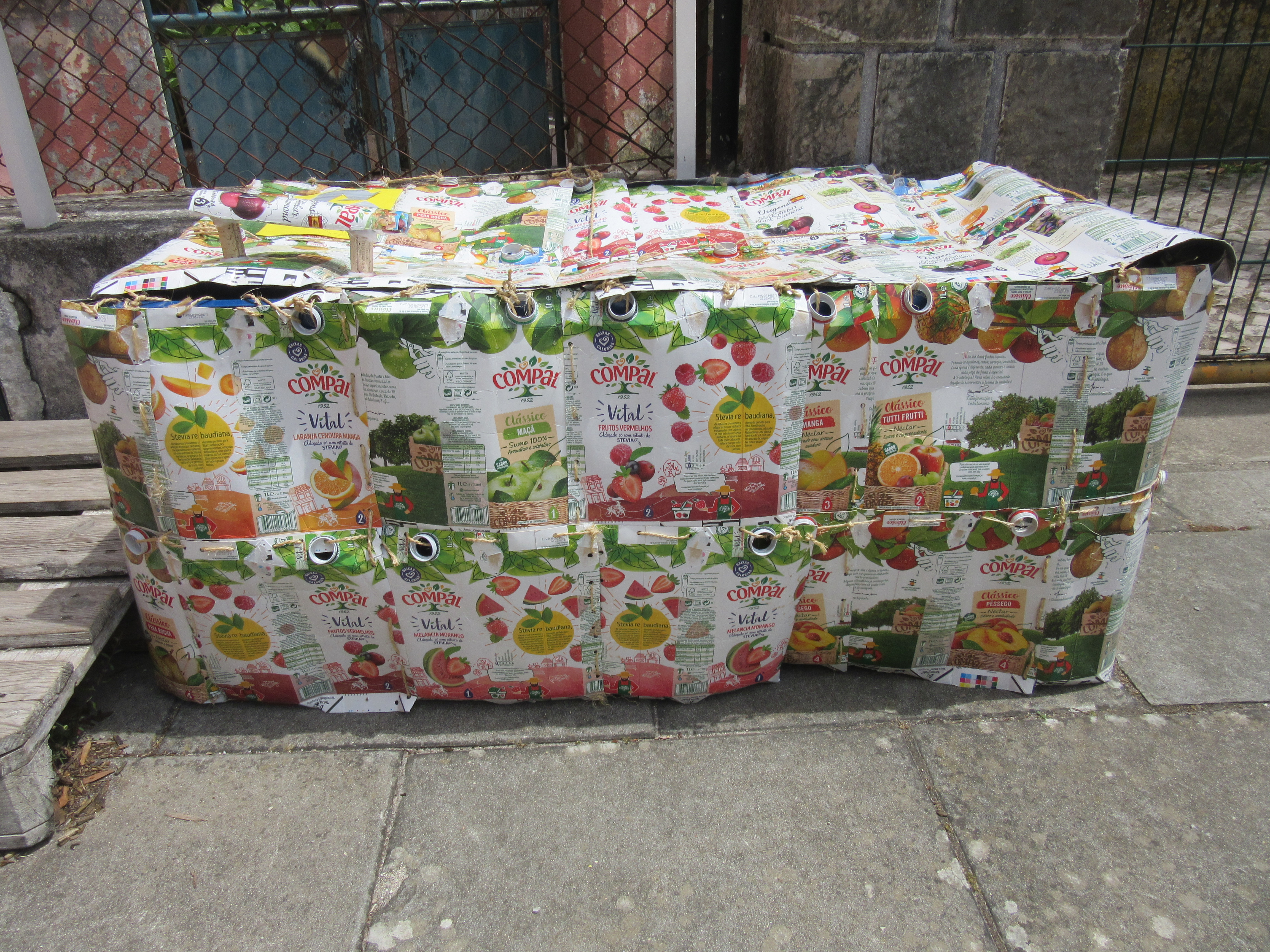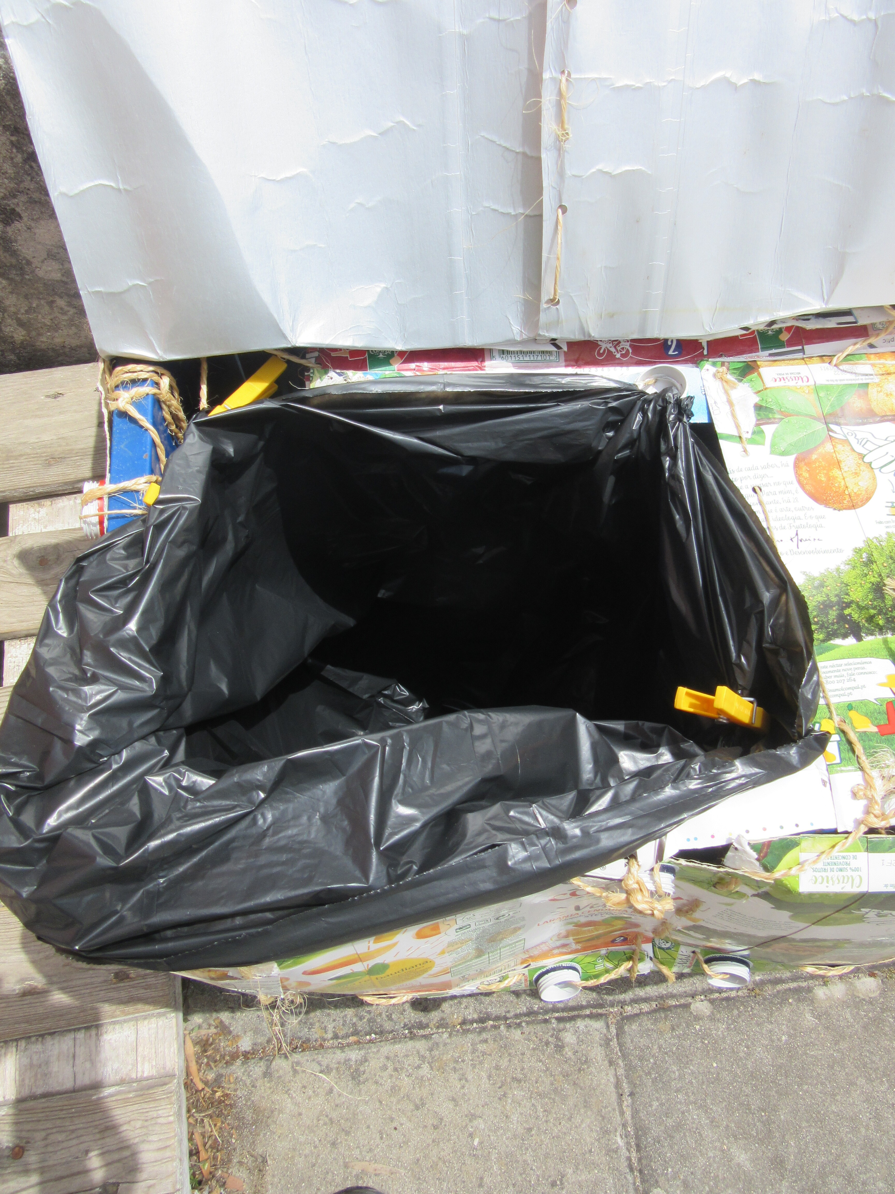 O ecoponto foi montado numa estrutura velha que existia na escola. Na parte de cima colou-se uma pega, feita com um pacote Compal enrolada, para levantar e colocar as embalagens vazias no seu interior. No interior foi colocado um saco de plástico preso com molas amarelas.