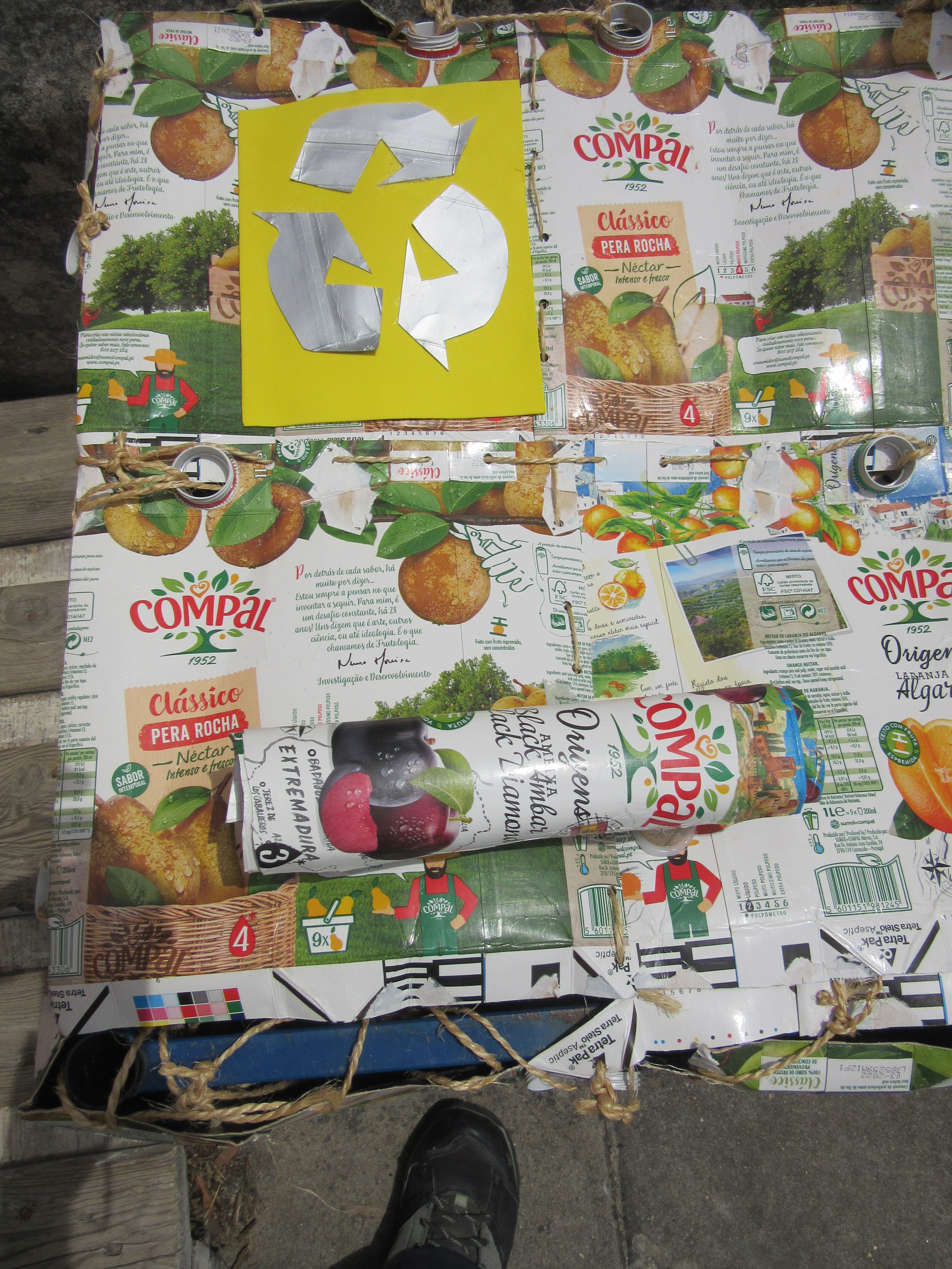 O simbolo da reciclagem foi feito com embalagens Compal pequenas viradas ao contrario e depois coladas com goma eva amarela.