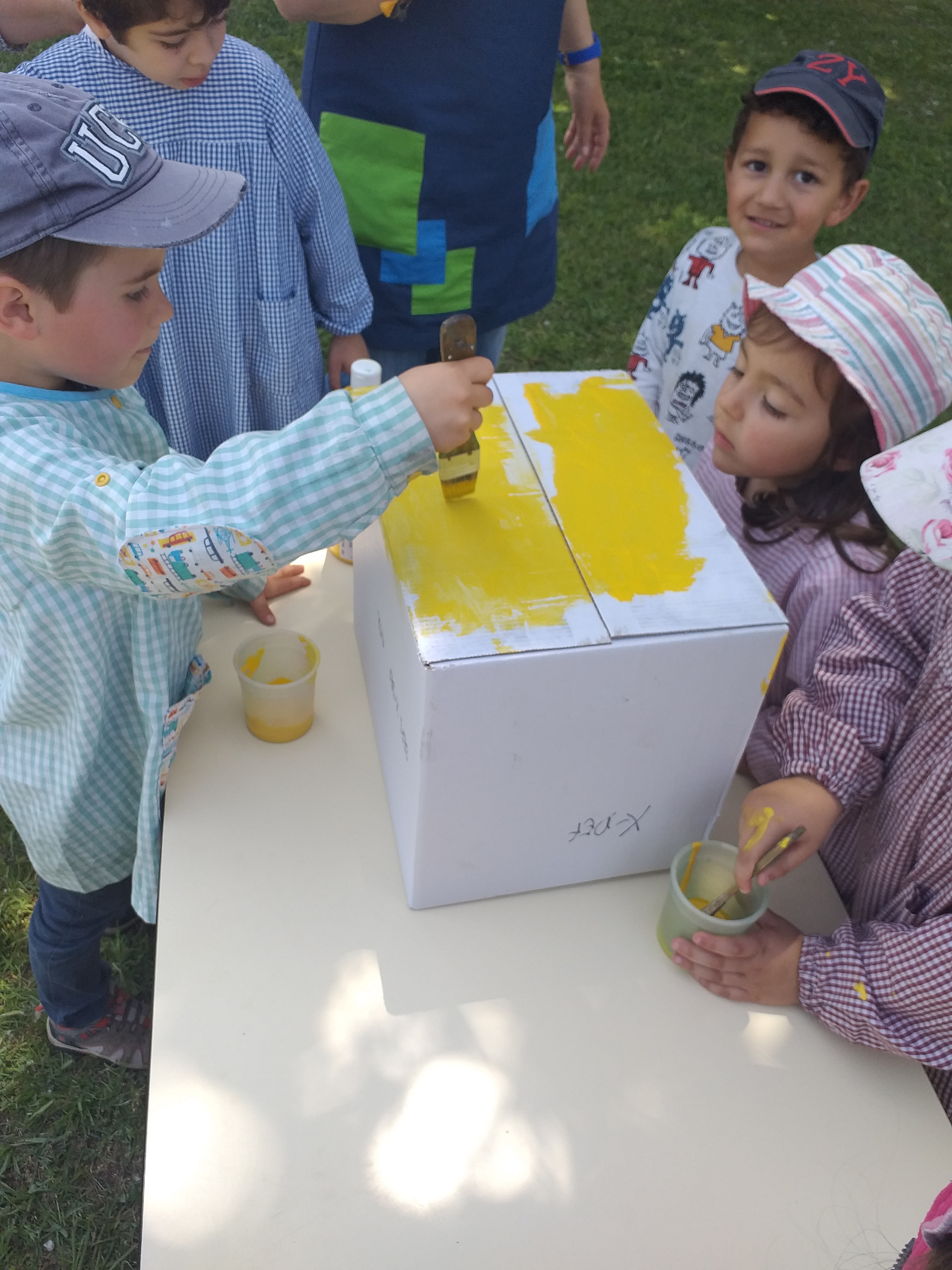Em primeiro lugar, pintámos as duas caixas de cartão com tinta amarela, depois de secas foram coladas uma na outra.
