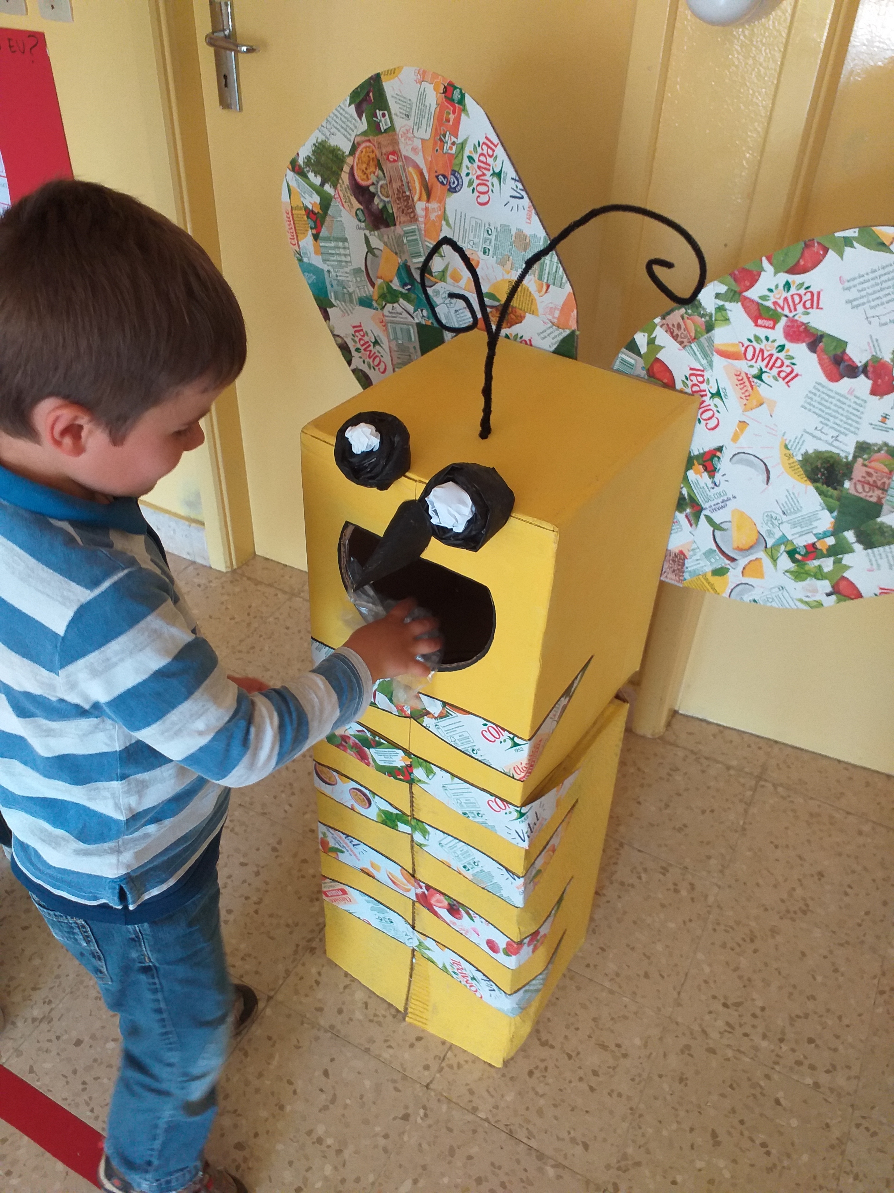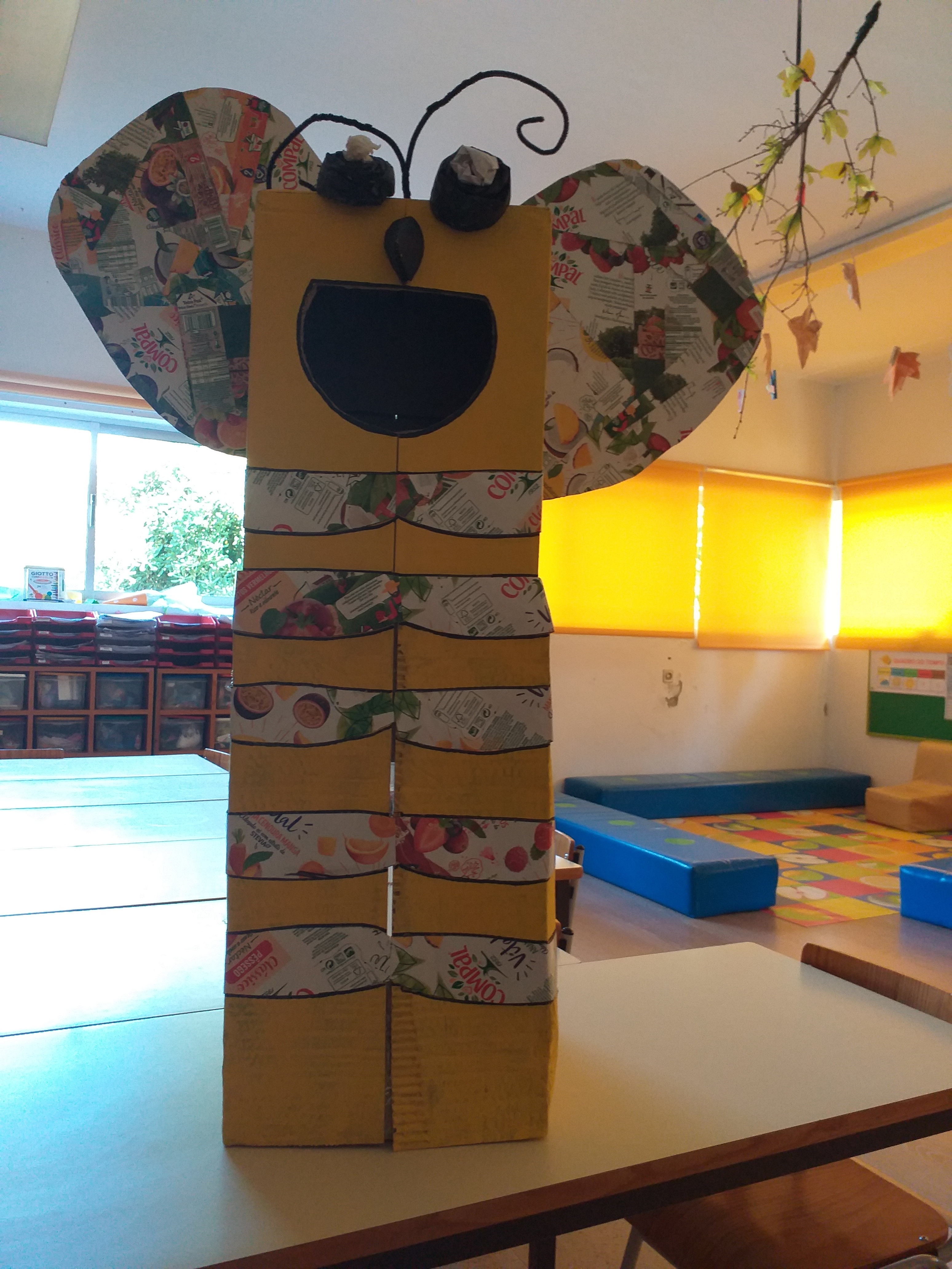 Recortaram-se tiras das embalagens da Compal, que depois foram coladas nas caixas para imitar as riscas das abelhas.