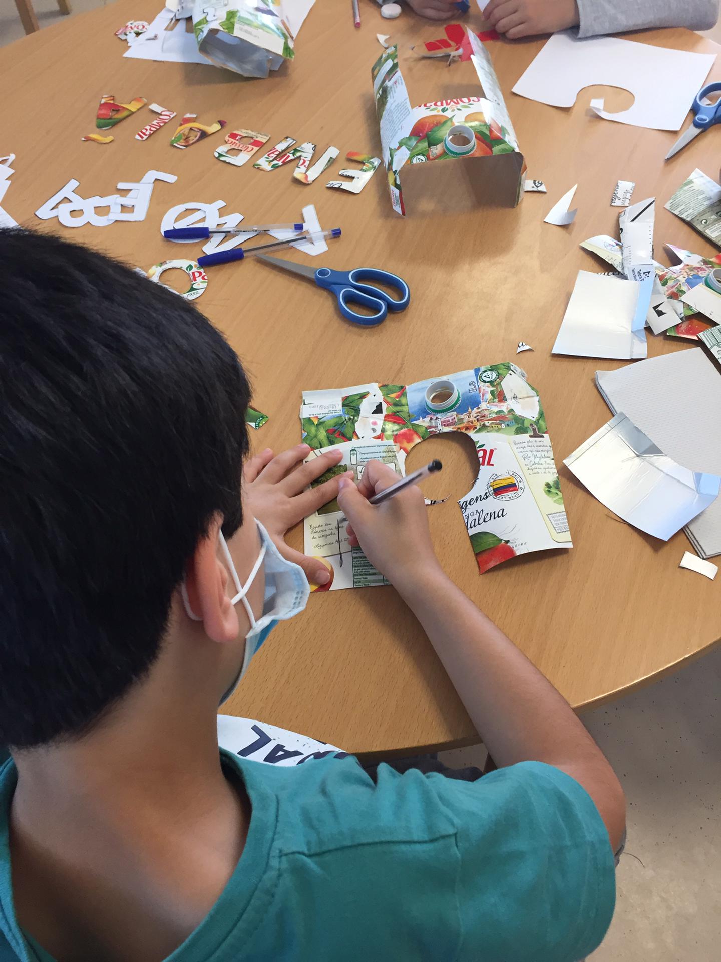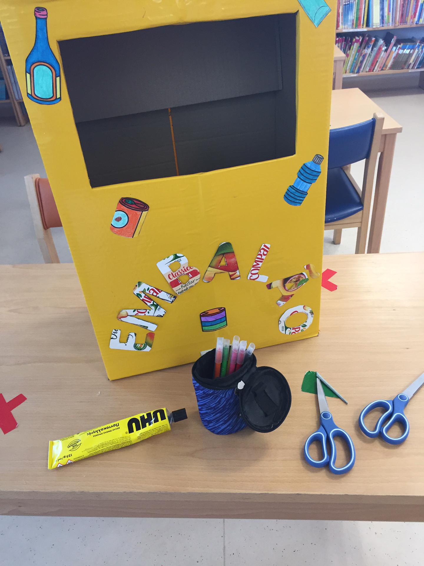 O material selecionado/utilizado foi: caixas de cartão, cola, embalagens da compal Tetra Pack, marcadores, tesoura, figuras para colorir e papel autocolante.