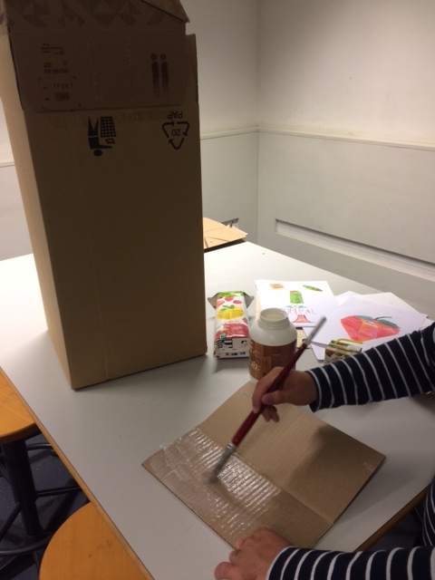 Na construção, foram utilizadas duas caixas de cartão canelado, uma para a estrutura e corpo principal do ecoponto, outra para se poder fabricar a tampa na parte superior, bem como reforçar algumas partes da própria estrutura. Para a tampa preta, utilizou-se cartão prensado da capa dos blocos de desenho e um rolo de papel, que tinham como destino o lixo. Esta foi revestida com plástico de cor preta, material este que também permitiu criar a abertura e fecho da mesma, para a introdução das embalagens para reciclagem. Para unir toda a estrutura e componentes, foi apenas utilizada cola branca, tal como na aplicação dos desenhos e rótulos na superfície do ecoponto. Por fim, aplicou-se por toda a embalagem, tinta amarela à base de água como acabamento final.
