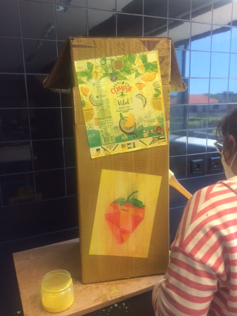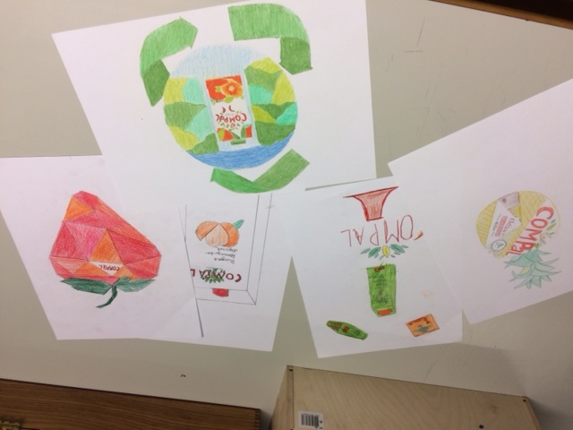 Foi proposto ao Gonçalo, aluno com necessidades Educativas Especiais da Turma F do 10º ano, que fizesse uma curta pesquisa e escolhesse uma embalagem tetra pack/Compal. A escolha recaiu na embalagem de litro do Compal Néctar. A turma C do 6º ano realizou e ilustrou alguns desenhos sobre a Compal, para serem utilizados na decoração externa da embalagem do ecoponto, juntamente com rótulos de produtos da Compal.
