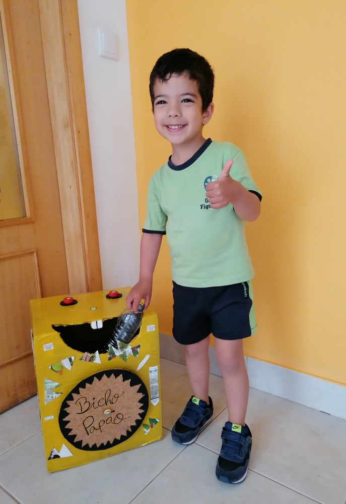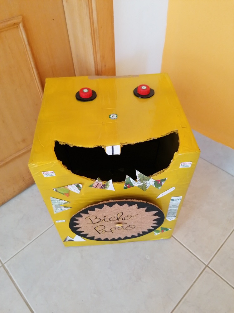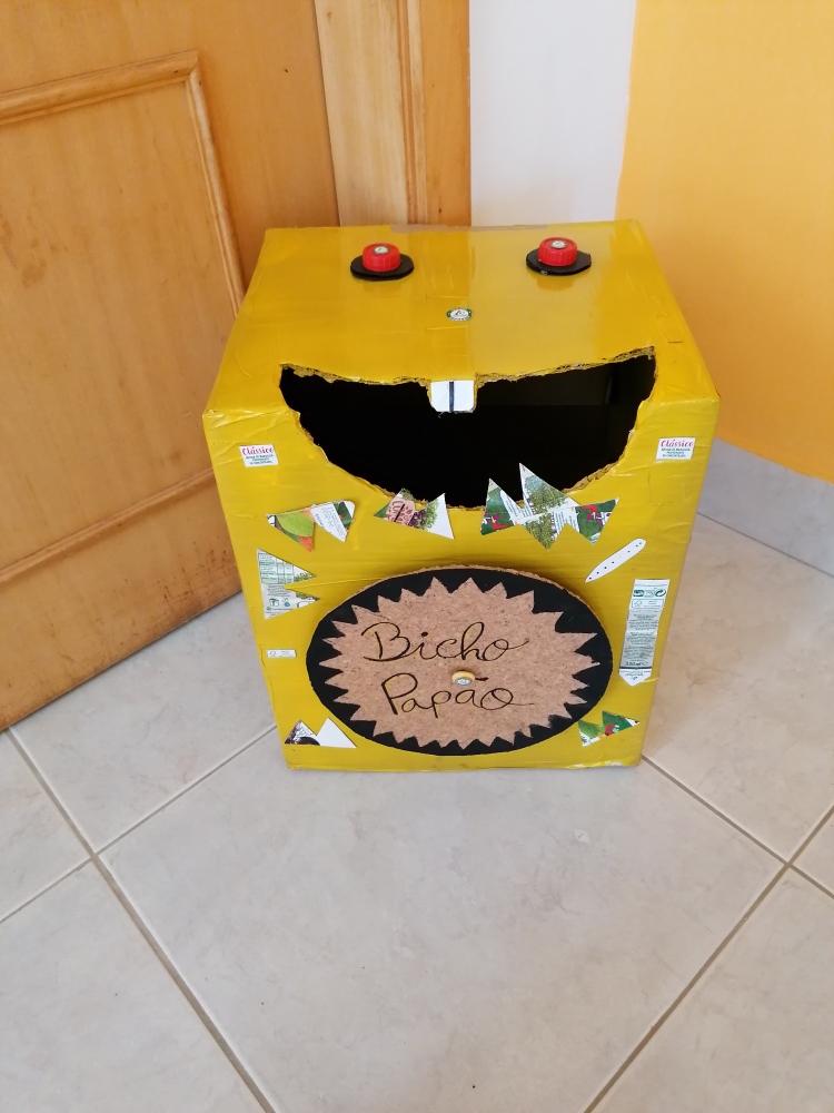 nossos alunos. O ecoponto foi elaborado com uma caixa de cartão, pintado de