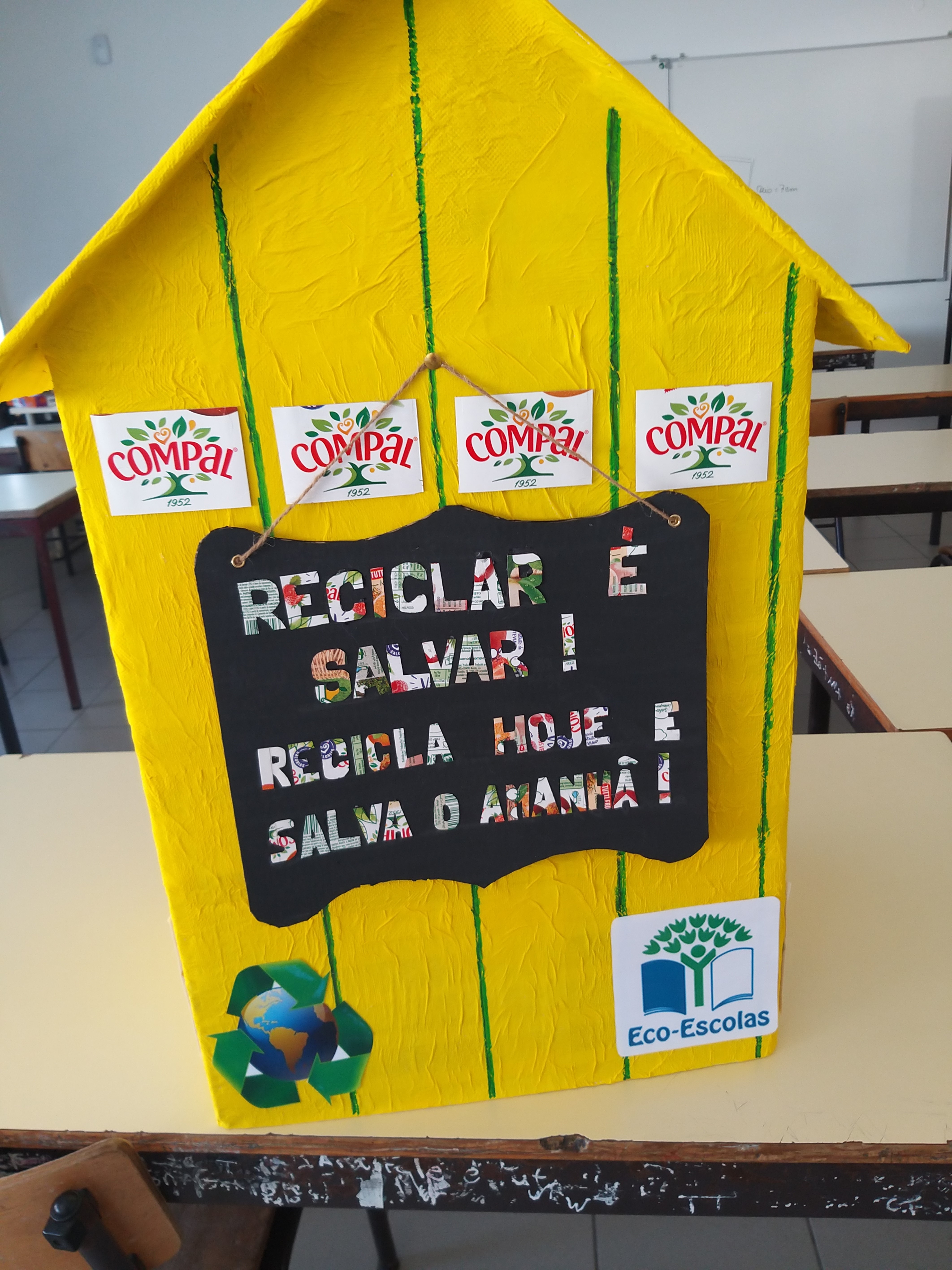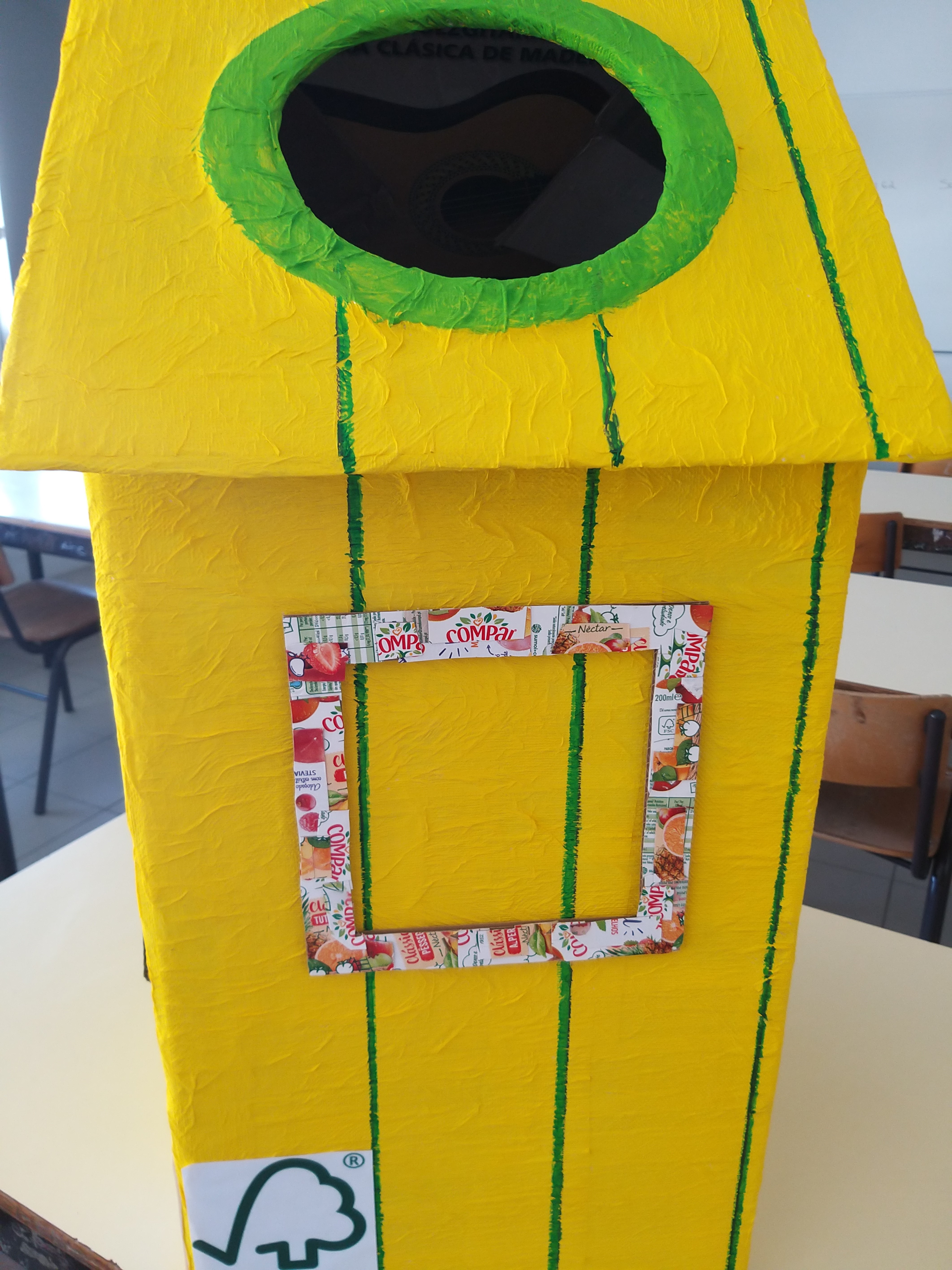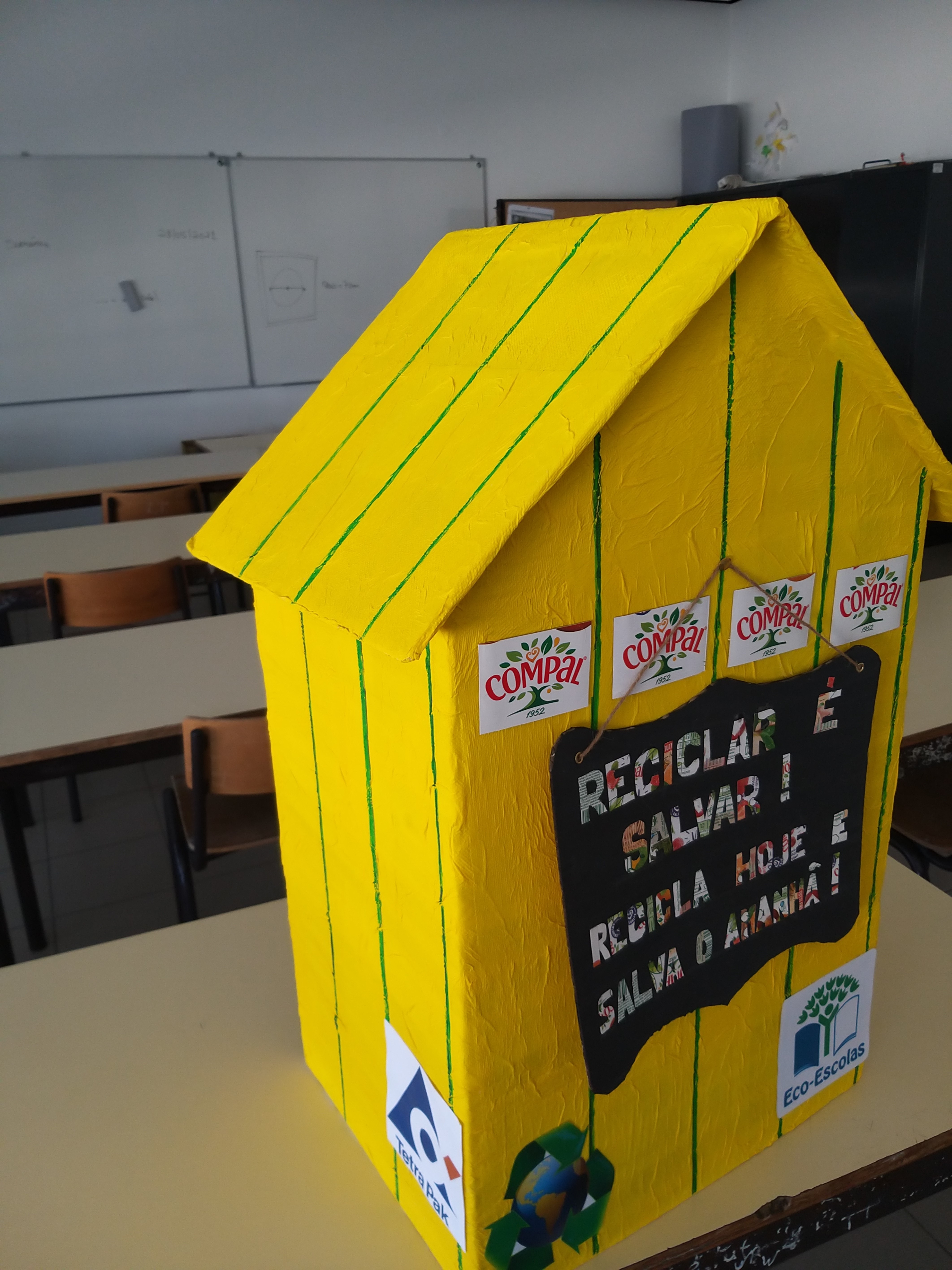 Posteriormente o ecoponto foi pintado de amarelo, a frase e os símbolos FSC, Tetrapack e Eco Escolas foram colados.