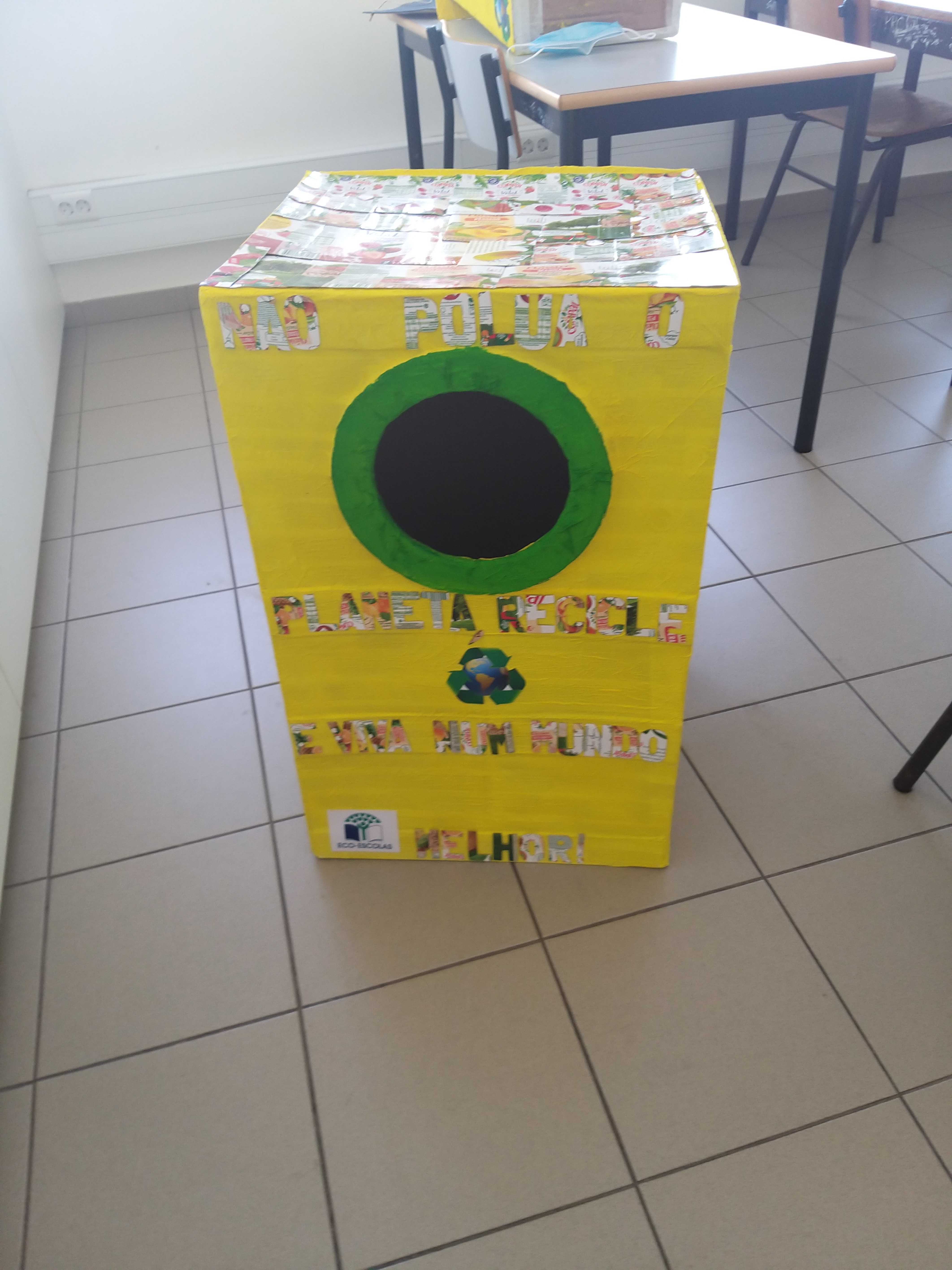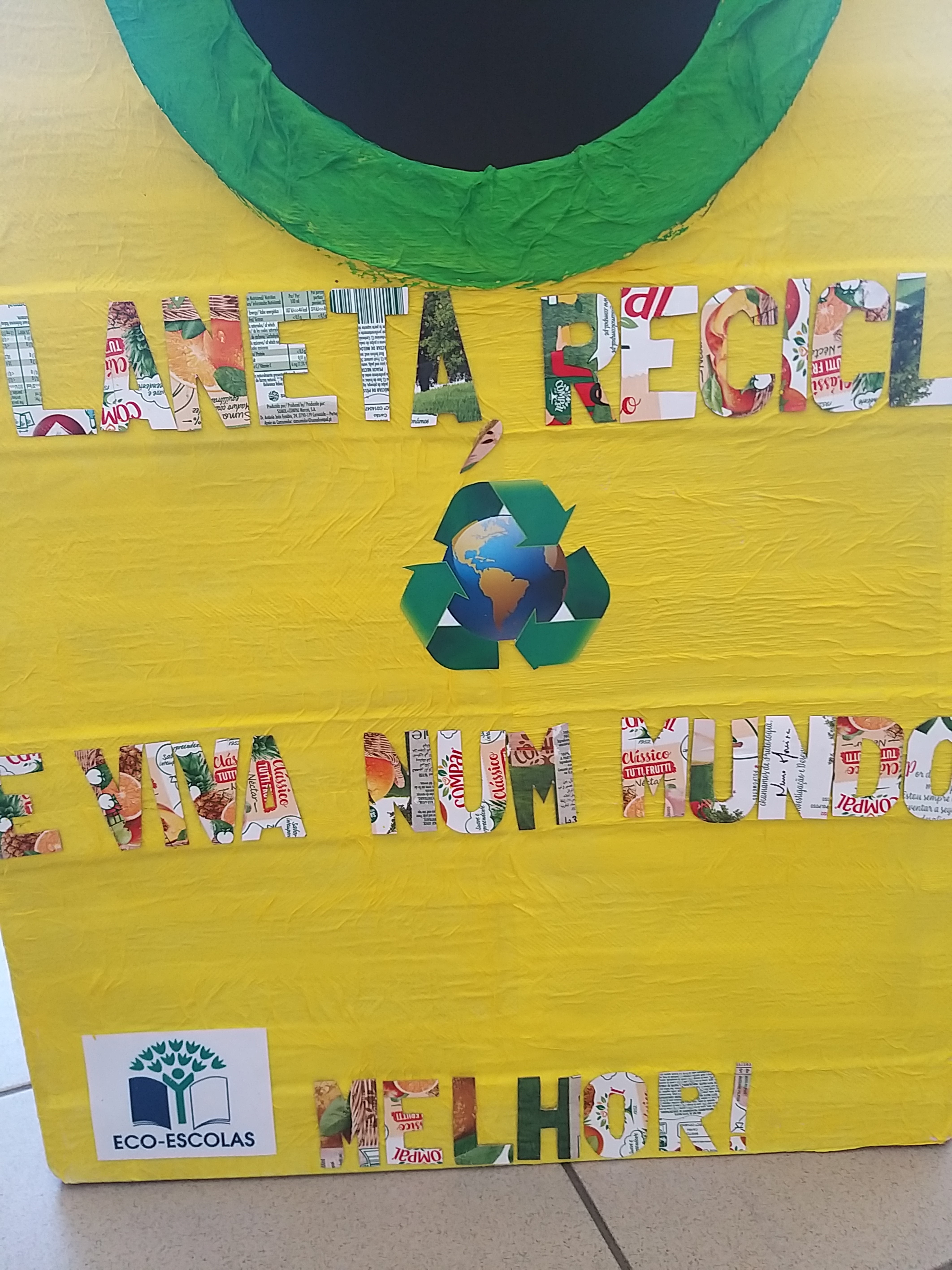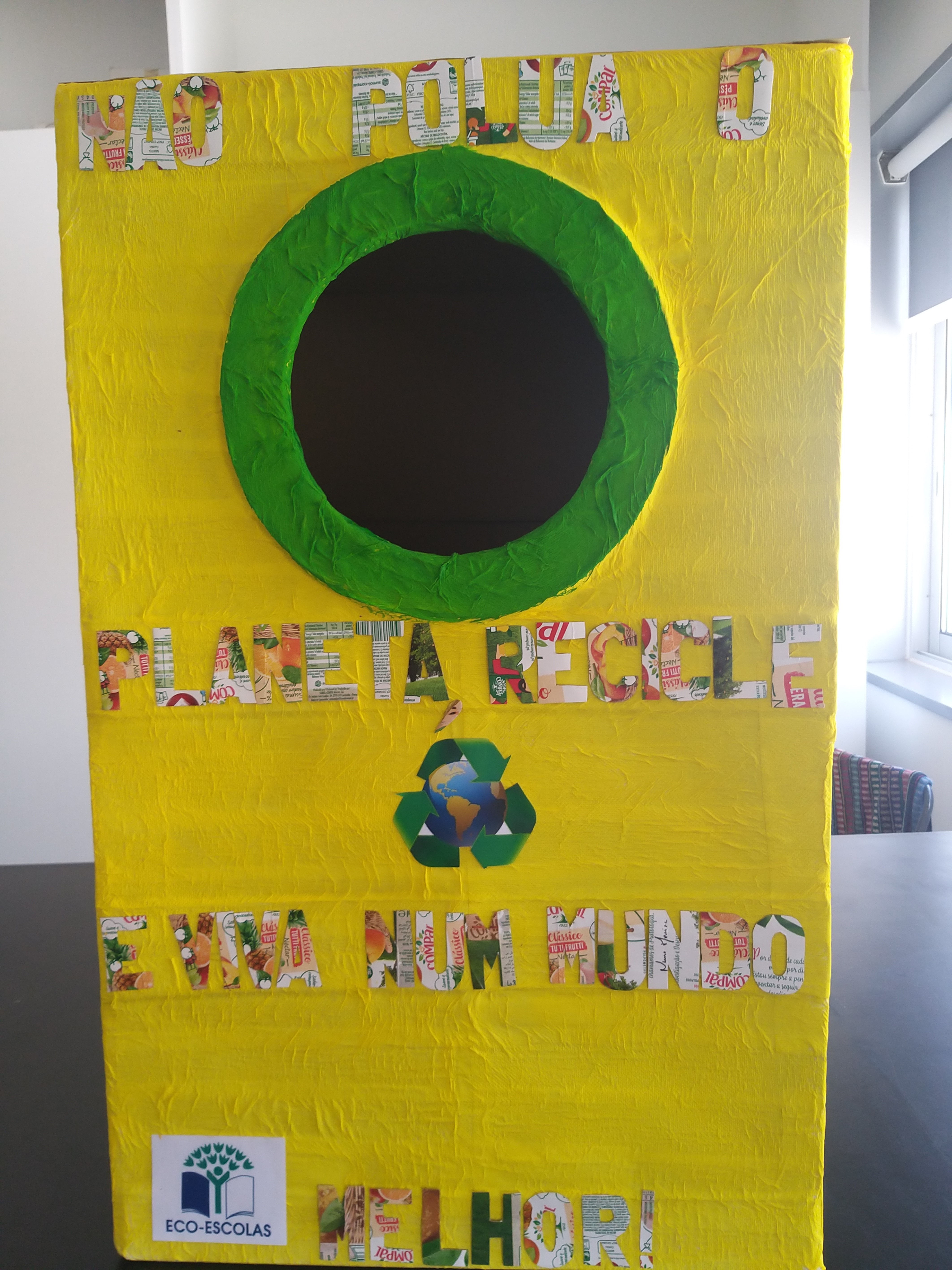 Posteriormente o ecoponto foi pintado de amarelo, a frase e os símbolos FSC, Tetrapack e Eco Escolas foram colados.