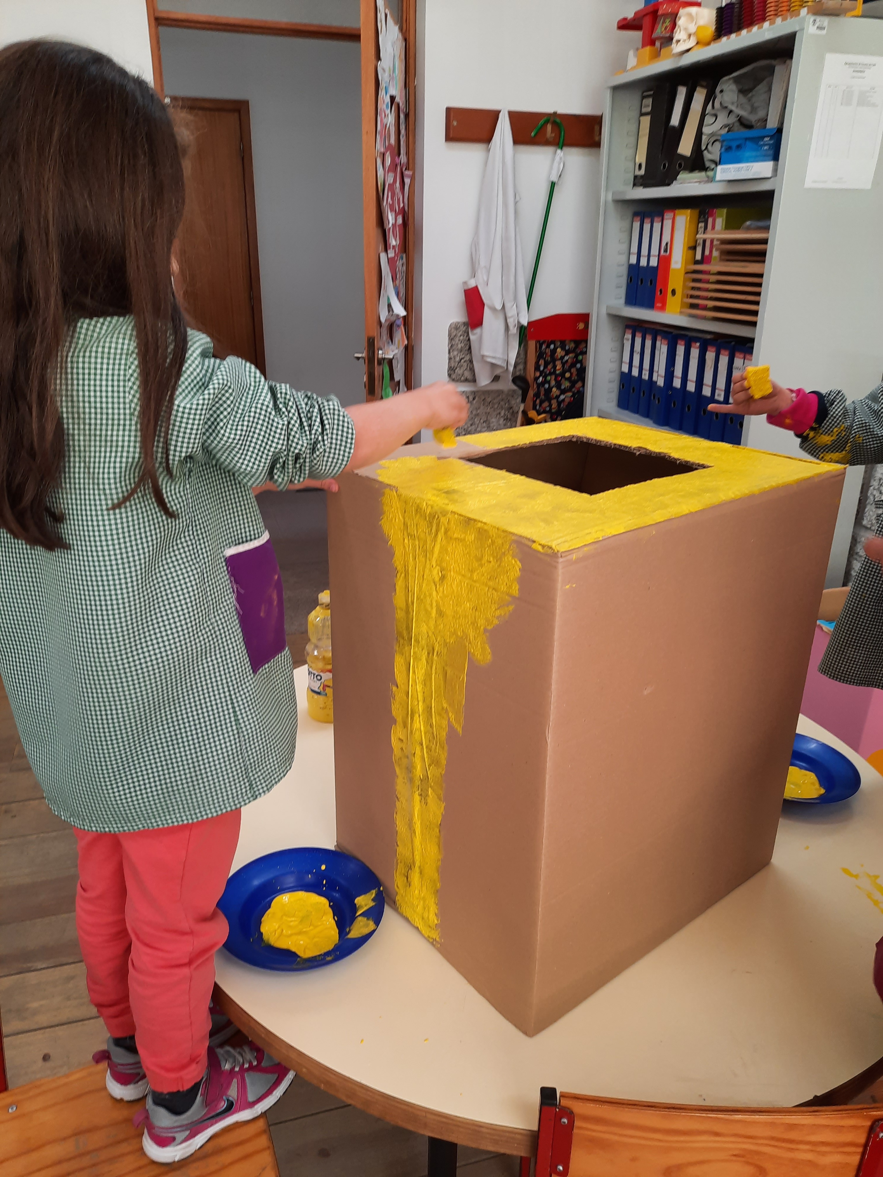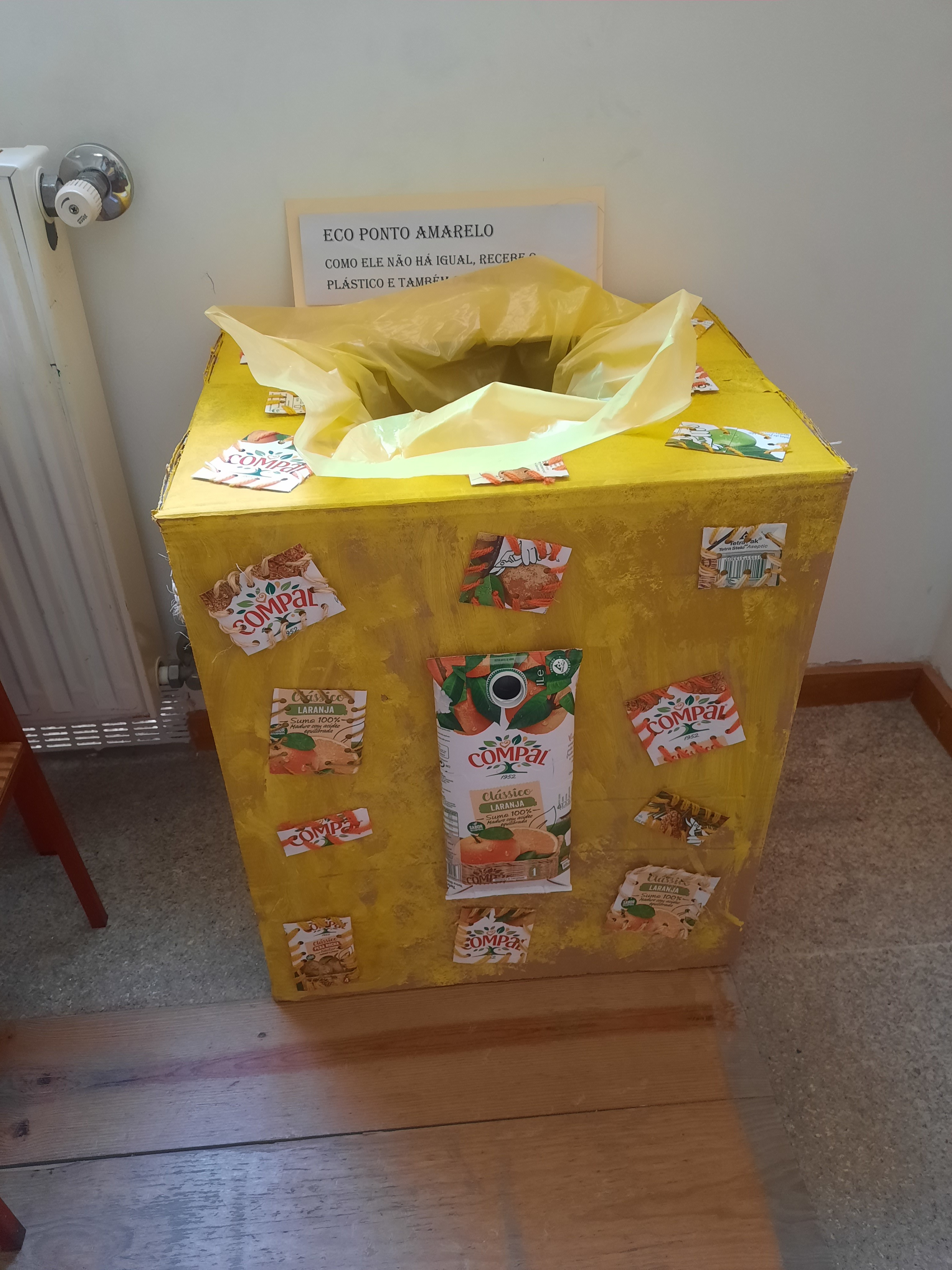 Ecoponto amarelo, este ecoponto é feito com as embalagens da Compal predominantemente amarelo e outros materiais como; caixa de cartão, tinta, lã, corda, tesouras e cola.