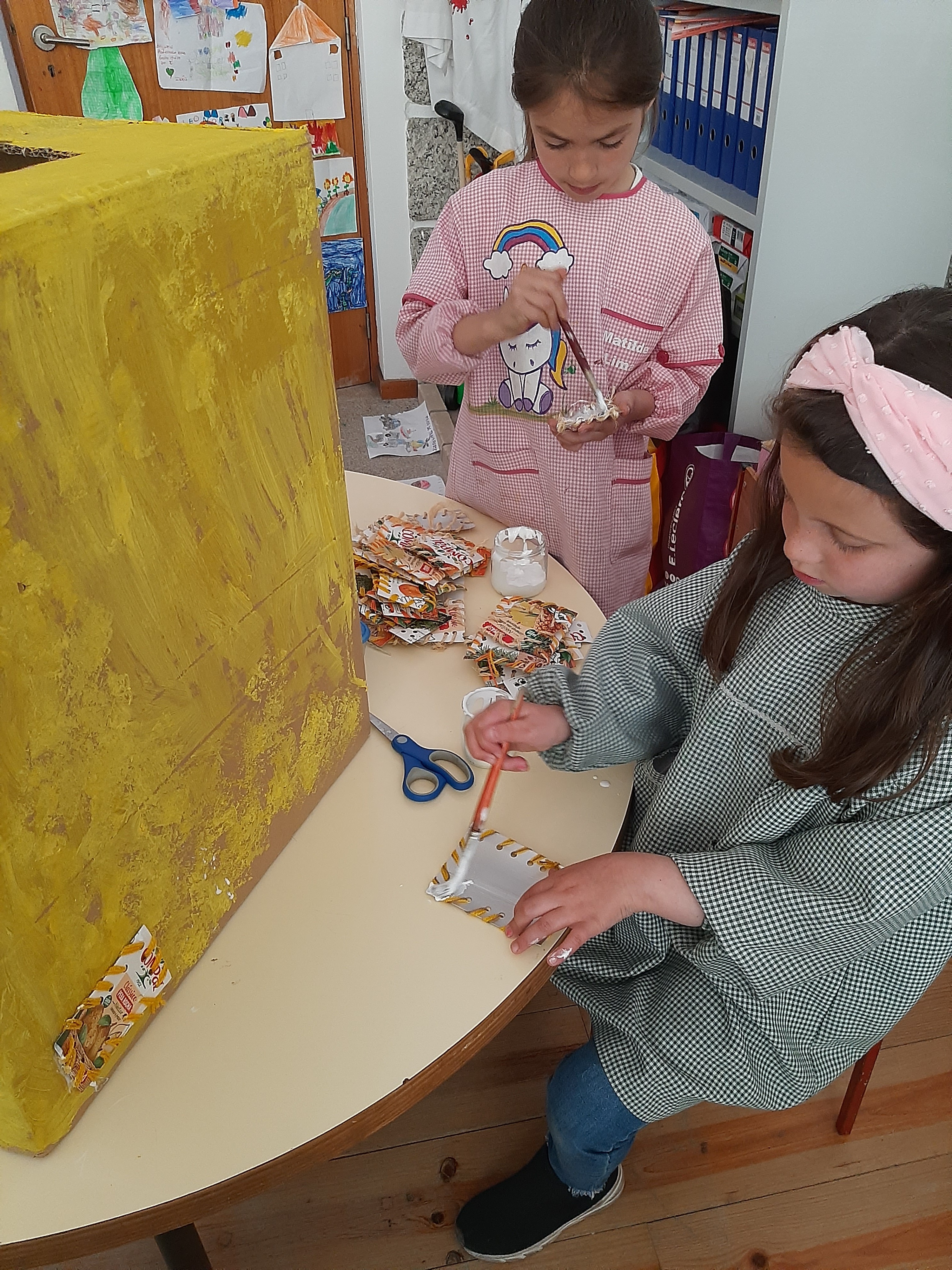 Em primeiro lugar foi feita uma sensibilização aos alunos sobre o ecoponto amarelo e qual a sua importância, outro assunto debatido foi a importância da reciclagem assim como as embalagens da treta pak e o ecoponto certo para a sua recolha e um breve esclarecimento sobre o significado do selo FSC. As embalagens foram recolhidas, abertas e recortadas, de seguida foram picotadas e debruadas com lã dentro dos tons amarelos e corda, finalmente coladas na caixa pintada de amarelo. Os alunos do 3º e 4º ano escreveram frases sobre o eco ponto amarelo e selecionamos uma entre muitas. os alunos participaram com interesse e empenho, os encarregados de educação também de empenharam em dar ideias e enviaram os pacotes de Compal. A mensagem foi passada aos alunos e aos encarregados de educação. O ecoponto foi colocado na entrada da escola.