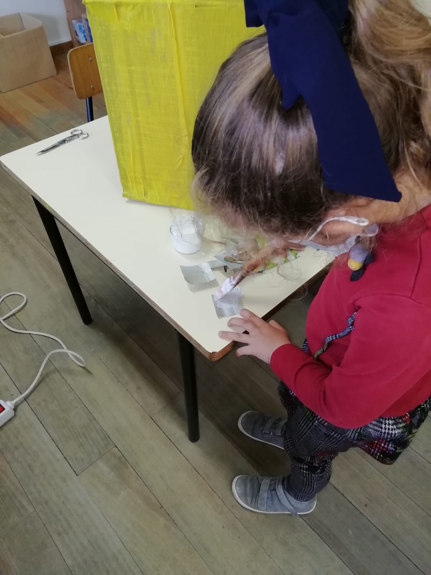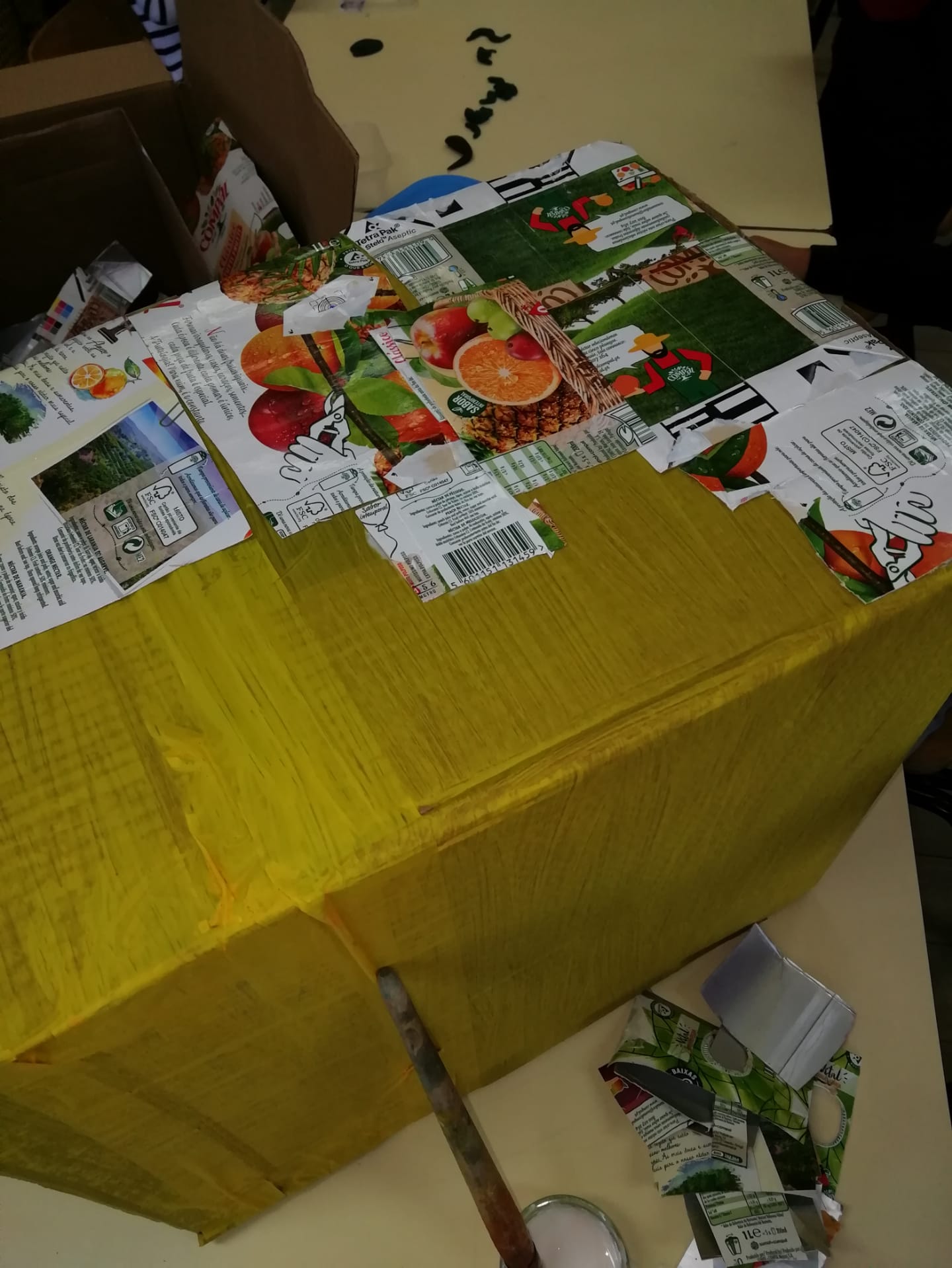 A atividade foi proposta aos alunos, e, explicada a importância da separação e recolha dos resíduos. Os alunos procederam à recolha das embalagens de sumo da Compal, e quando já tinham um boa quantidade os alunos sugeriram usar uma caixa de cartão que depois pintaram de amarelo. Para a reutilização das embalagens foram cortadas e coladas na caixa. Para a pega da tampa foram utilizadas tampas de plástico amarelo. Para finalizar foram colocados os símbolos das embalagens da Compal, assim o símbolo da reciclagem e a frase de apelo à correta separação de embalagens para que possamos assegurar um melhor futuro.