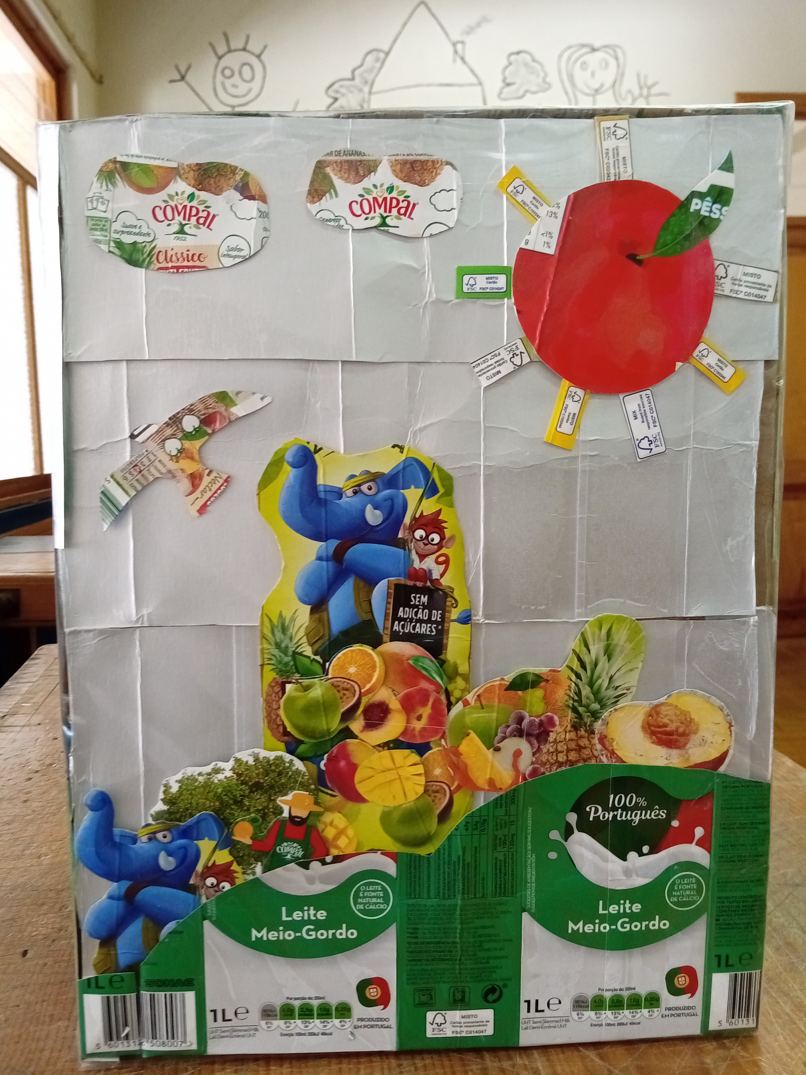 Assim que o número de materiais foi suficiente, tiveram início os trabalhos de construção dos ecopontos: em primeiro lugar, fez-se uma abertura nas caixas de cartão, suficientemente grande para colocar e recolher plástico; de seguida, foram bem lavadas e escorridas as embalagens Tetrapak; por fim, com tesouras e tubos de cola, a imaginação foi posta à prova, forrando-se de cima a baixo as caixas de cartão com essas mesmas embalagens. Para um acabamento mais firme, os ecopontos foram posteriormente cobertos com papel autocolante, que havia sobrado aquando da encadernação de livros e cadernos.