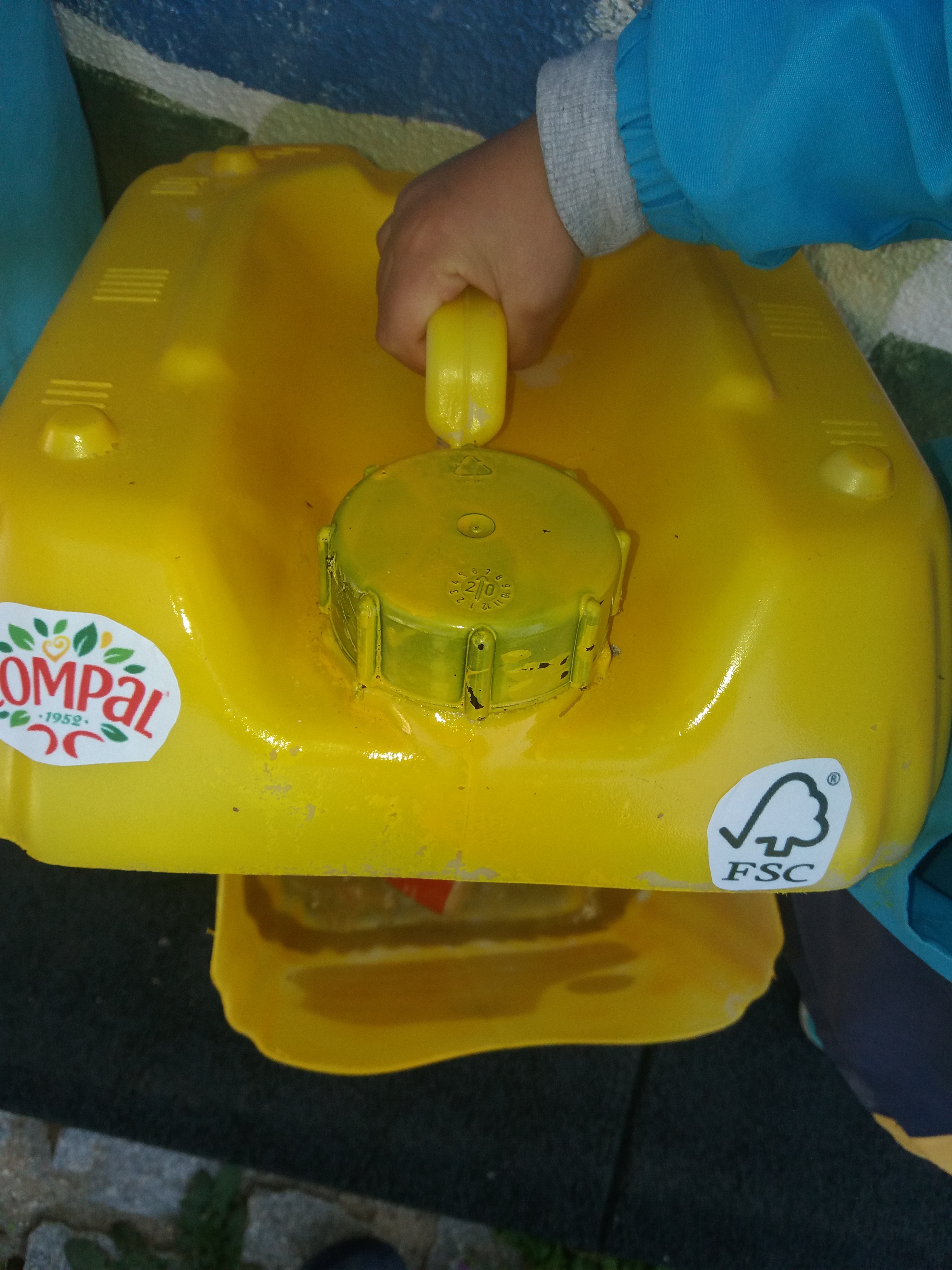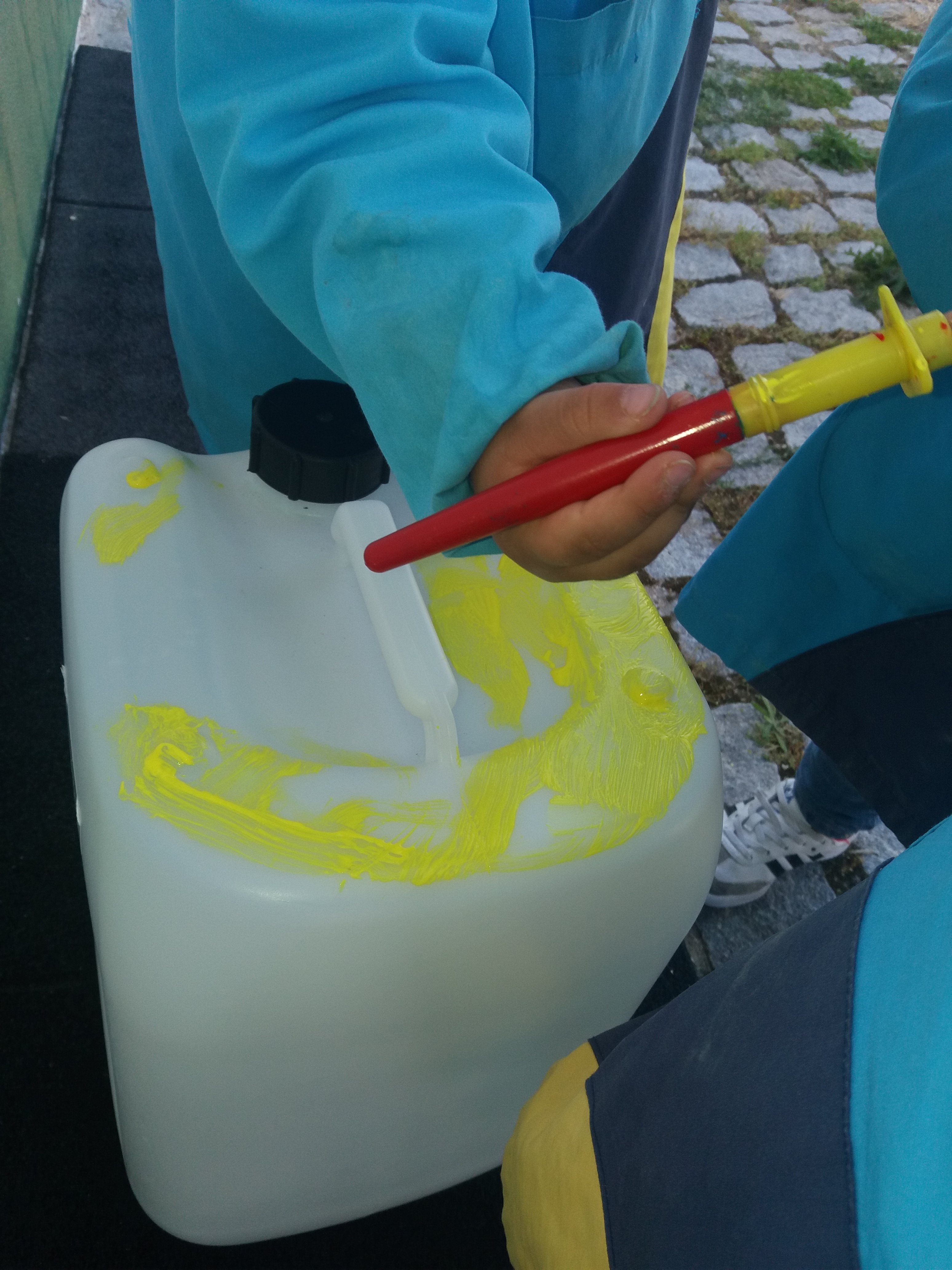 Utilizámos uma embalagem usada de detergente para o chão, abrimos a embalagem de forma a ter uma tampa, pintámo-la e colocámo-la na entrada do edifício.